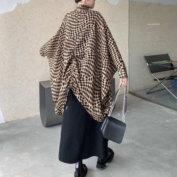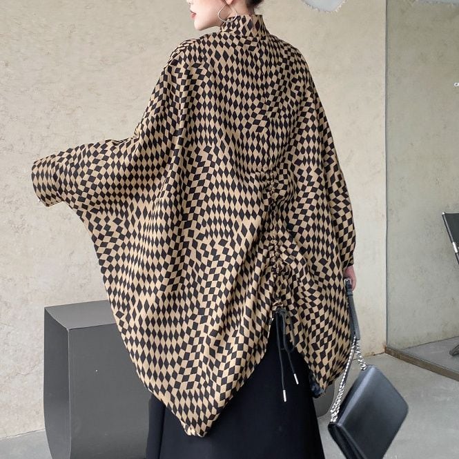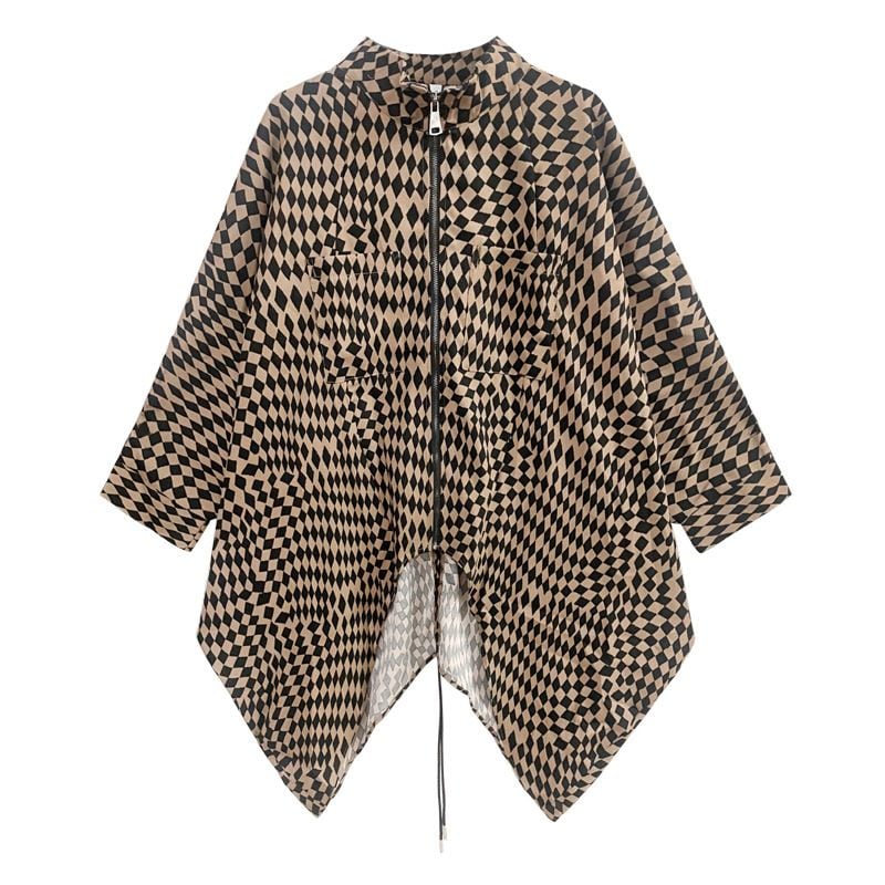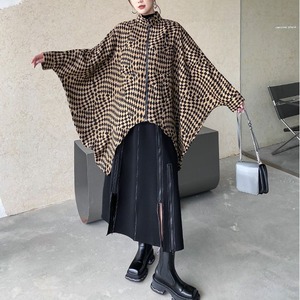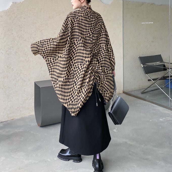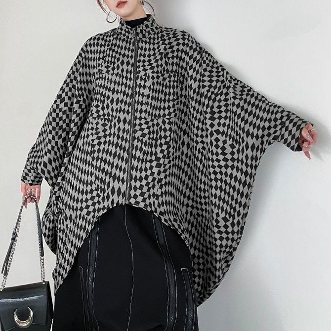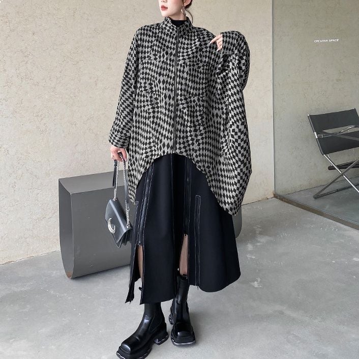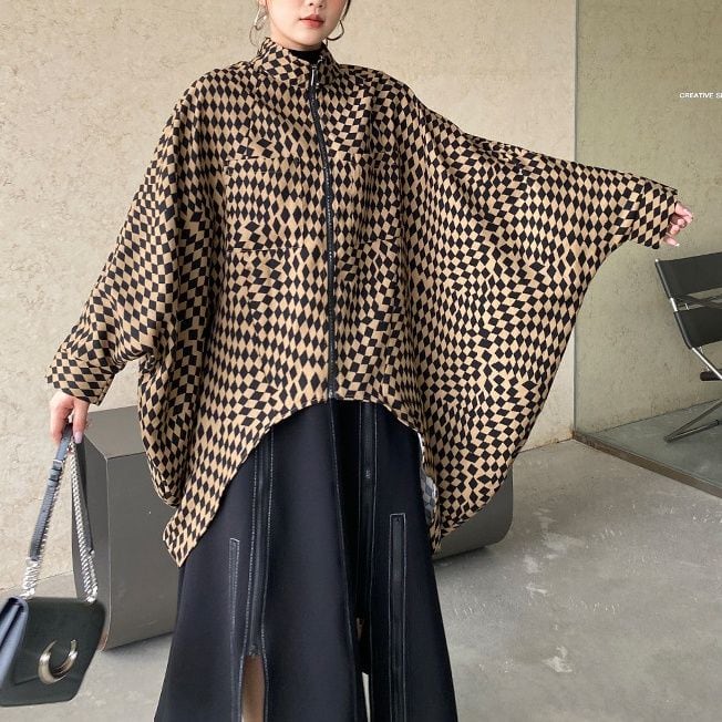 CHECKERED PATTERN STAND COLLAR FULLZIP BAT SHAPE JACKET 2colors M-14361