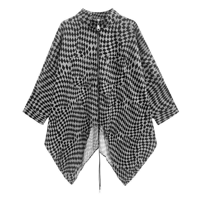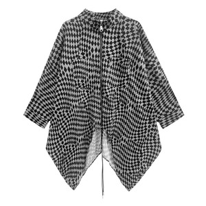 細かな市松模様の素材でできた、スタンドカラー・長袖・イレギュラーヘムのフルジップジャケットです。バックのセンターにドローストリングが付いてアレンジできる、蝙蝠のようなシルエットが目を惹くアイテムです。色は2色から選べます。
