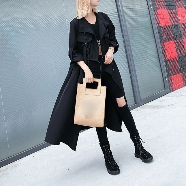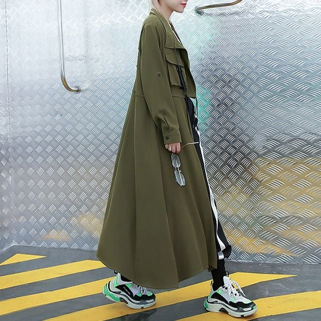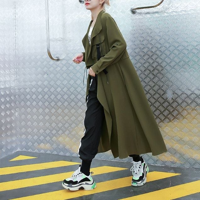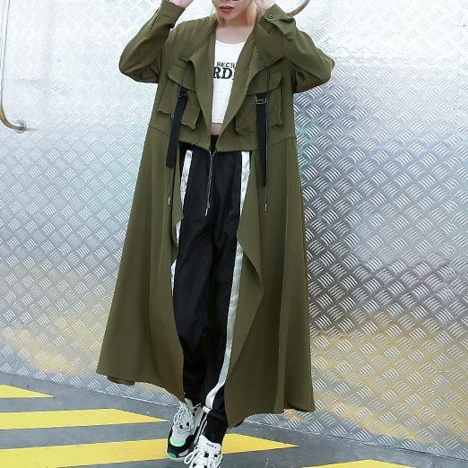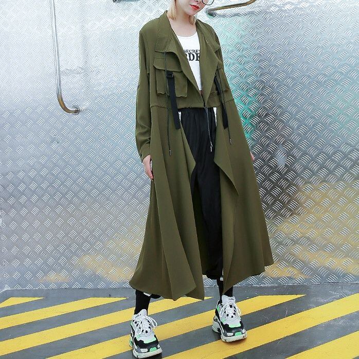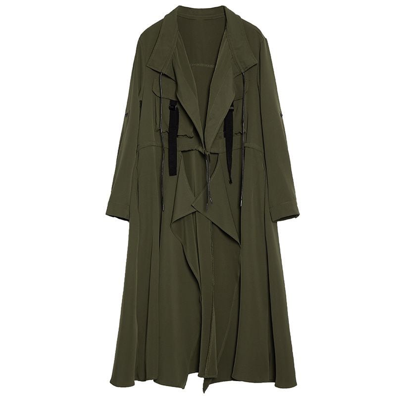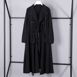 デザインポケットやフロントのシルエットが特徴的で目を惹く、長袖・ボタンレス・ロング丈のデザインコートです。首元やウエストにドローストリングが付いた、ドレープやひらひらとはためくフラップが魅力的なカジュアルアイテムです。色は2色から選べます。