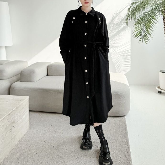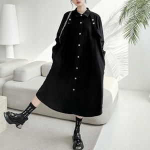 ブラック地にお洒落なボタンがアクセントになった、ポロ襟・長袖・ミドル丈のデザインシャツワンピースです。ゆったりとしたシルエットの裾はラウンドカットで、ウエストストラップで印象が変わるアイテムです。