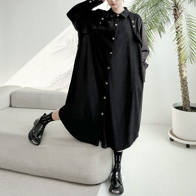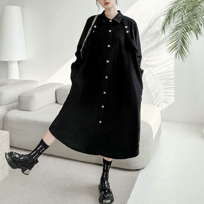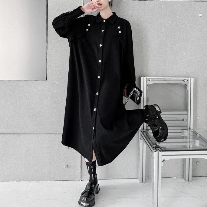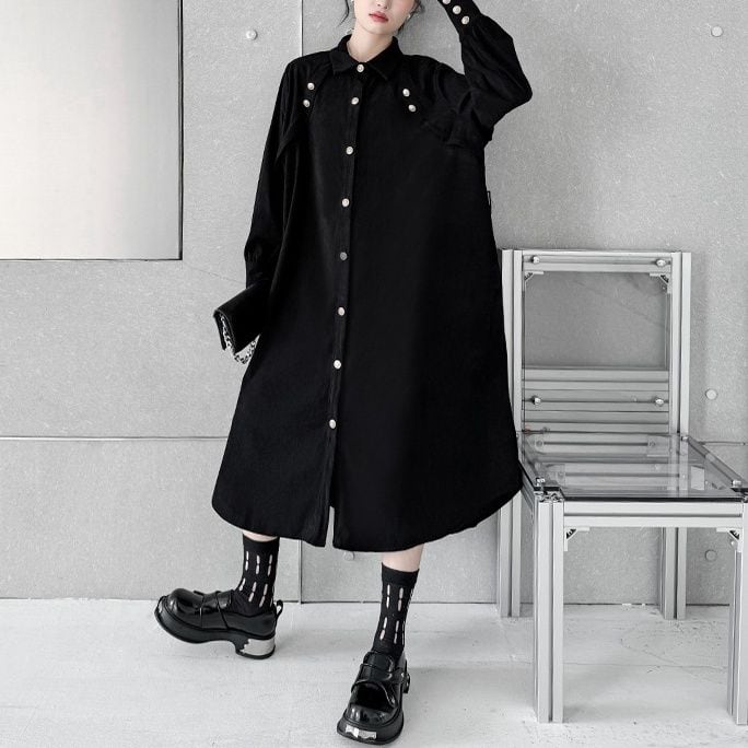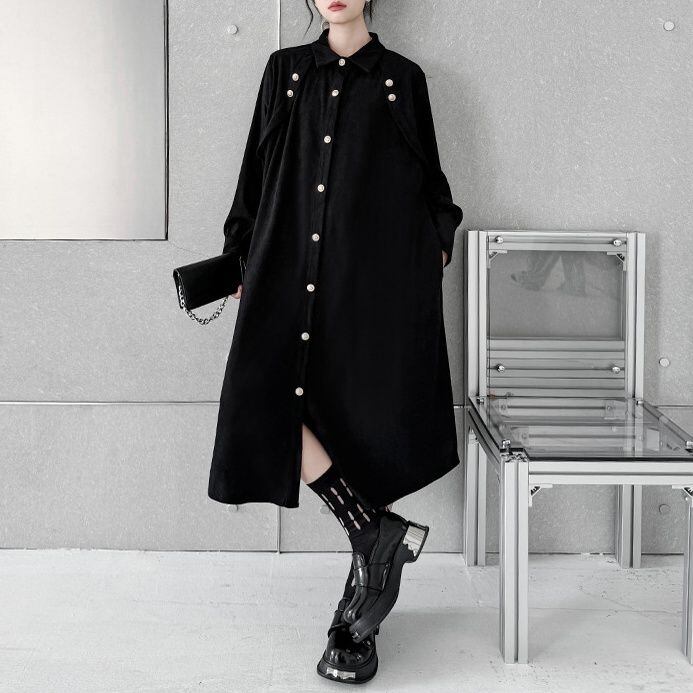 BLACK LONG SLEEVES MIDI DESIGN SHIRT DRESS 1color M-14366