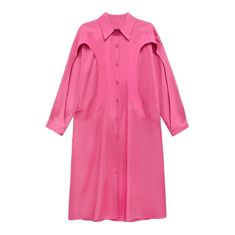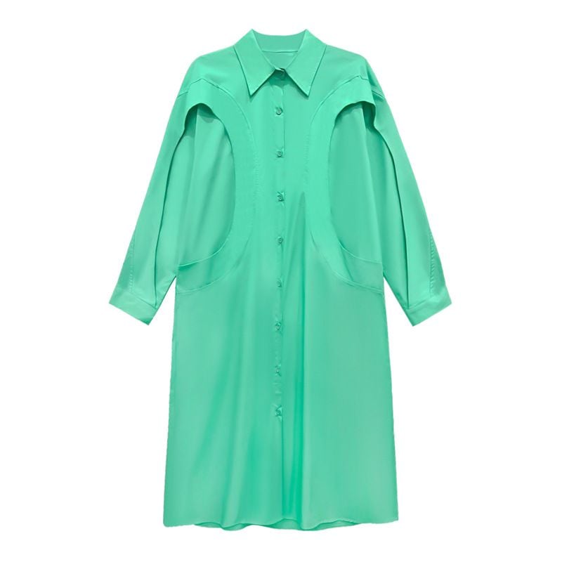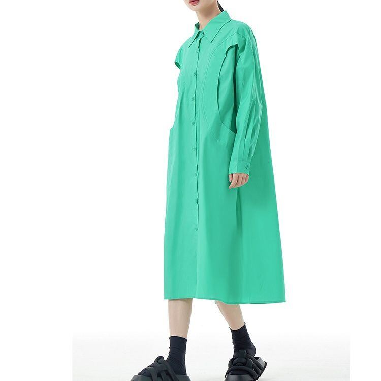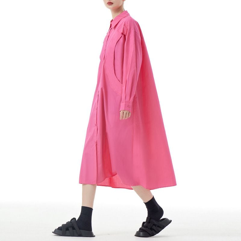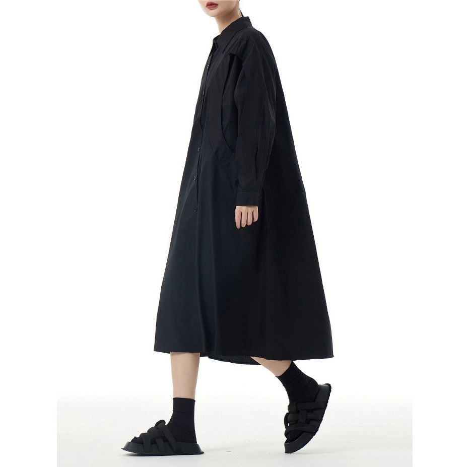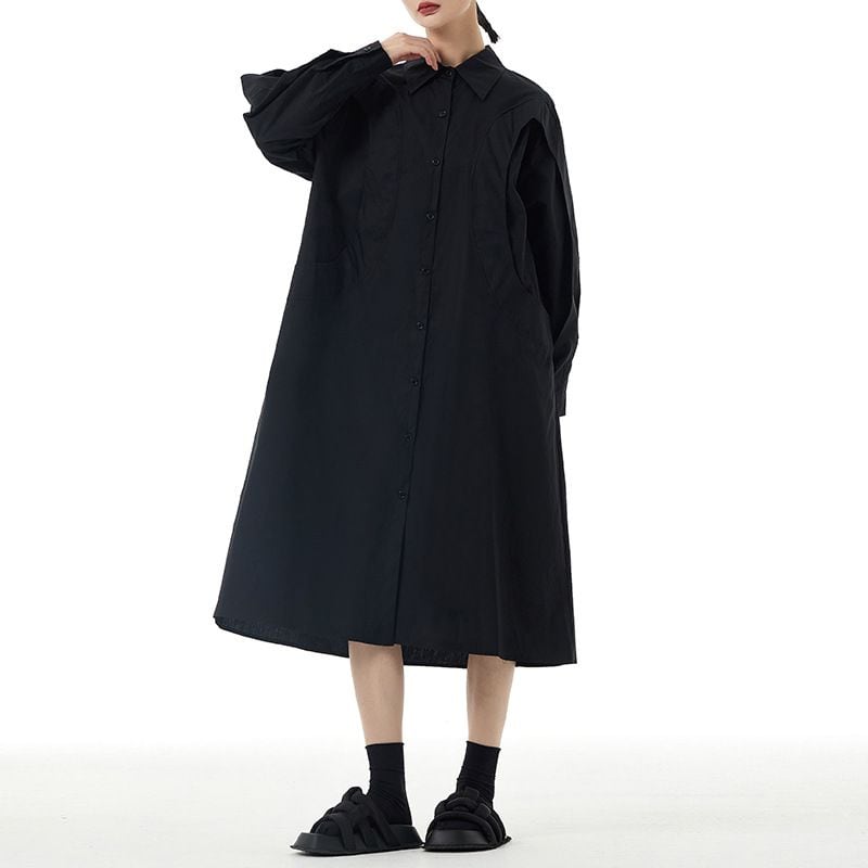 SOLID LONG SLEEVES MIDI A-LINE DESIGN SHIRT DRESS 3colors M-14368
