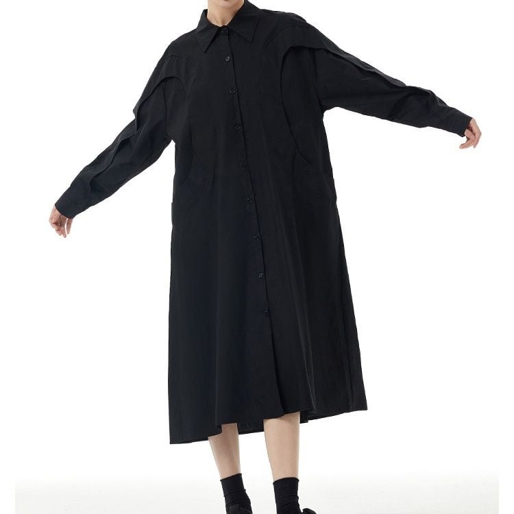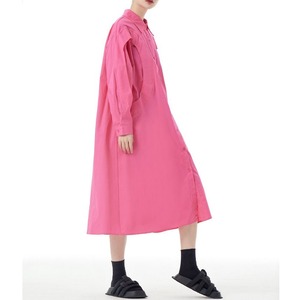 両肩から脇へ弧を描くフラップが特徴的な、ポロ襟・長袖・膝下丈のシャツワンピースです。ゆったりとしたシルエットにわずかに広がるAラインが上品な、単色で小物アレンジの利くアイテムです。色は3色から選べます。