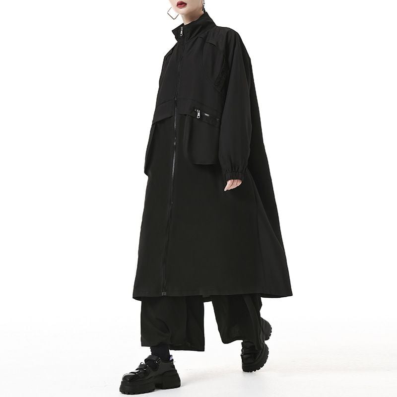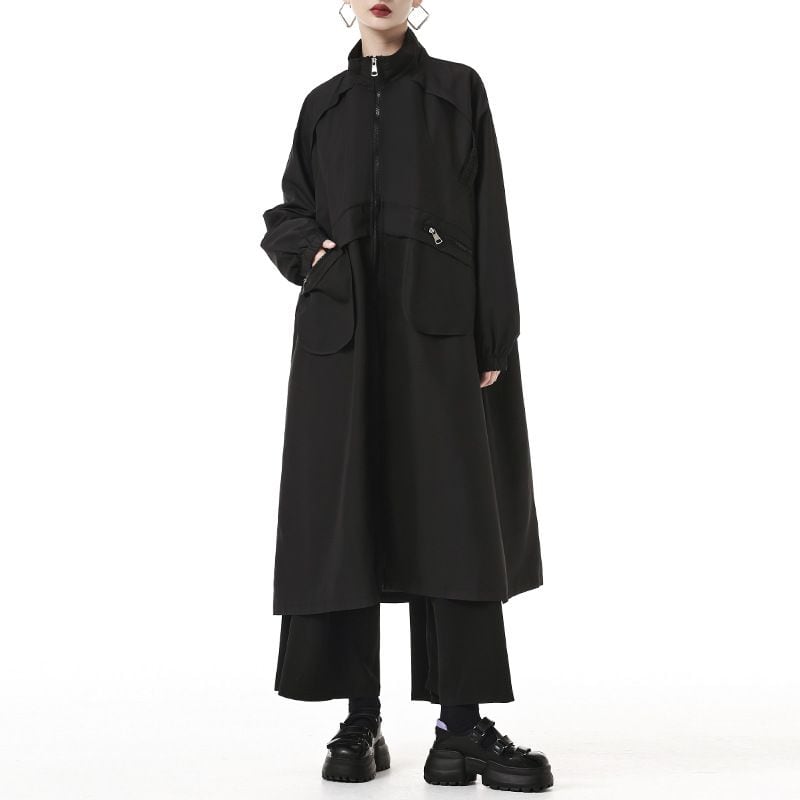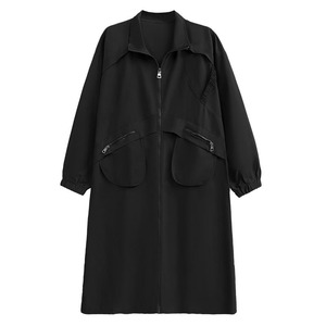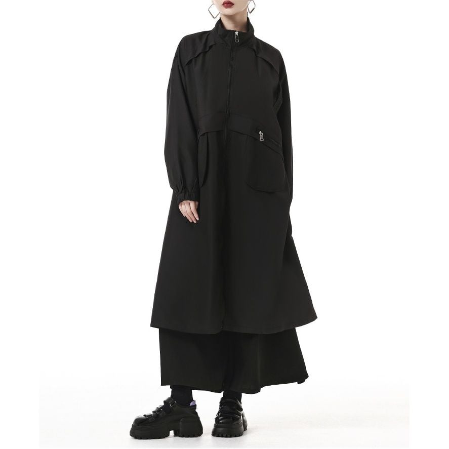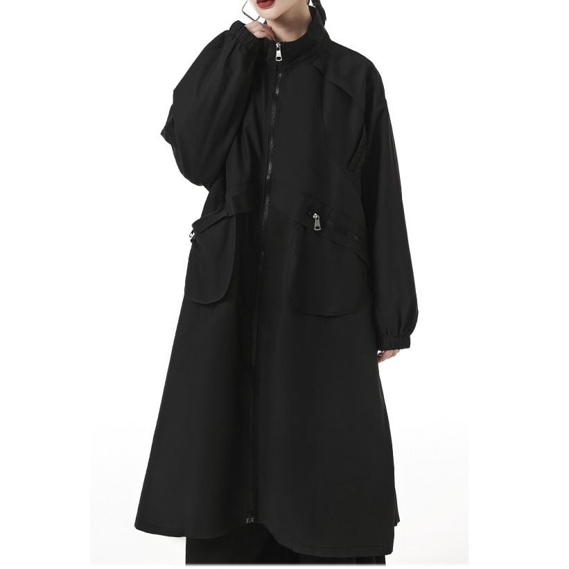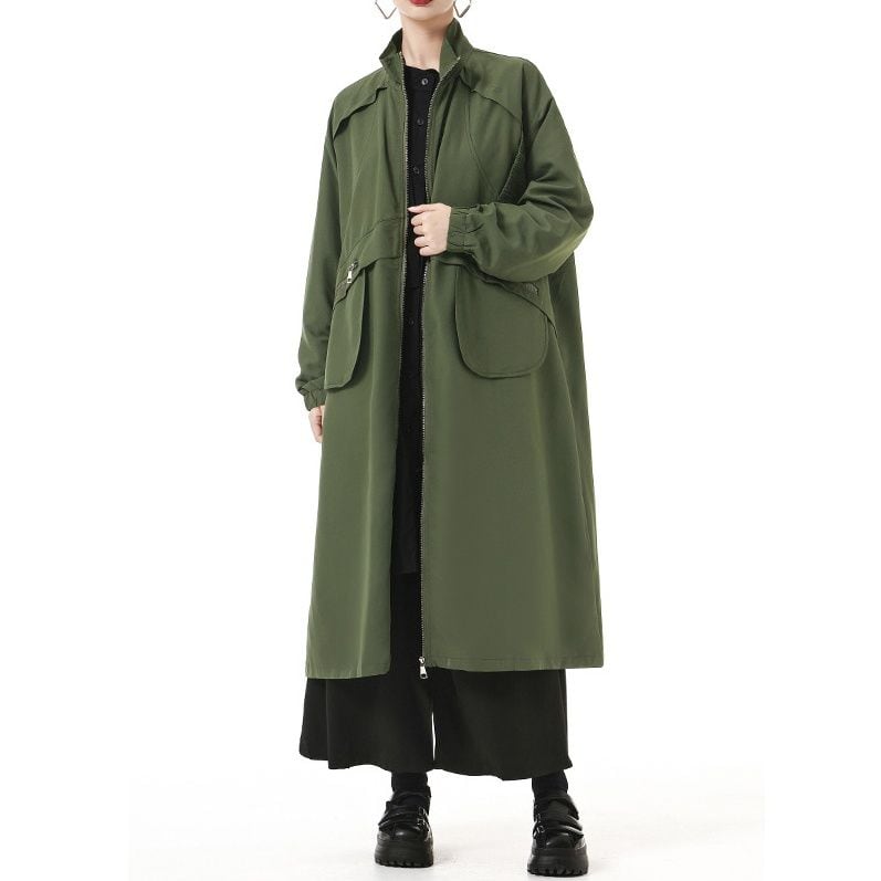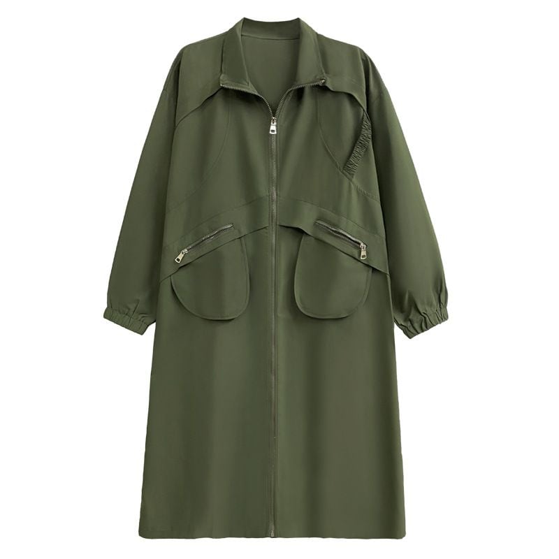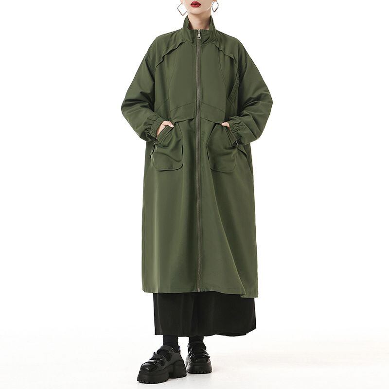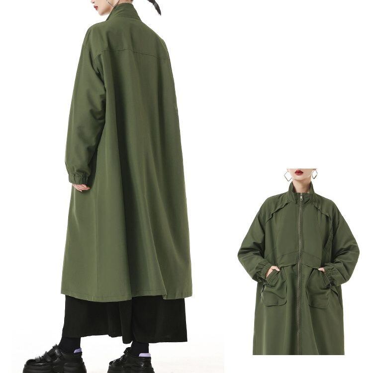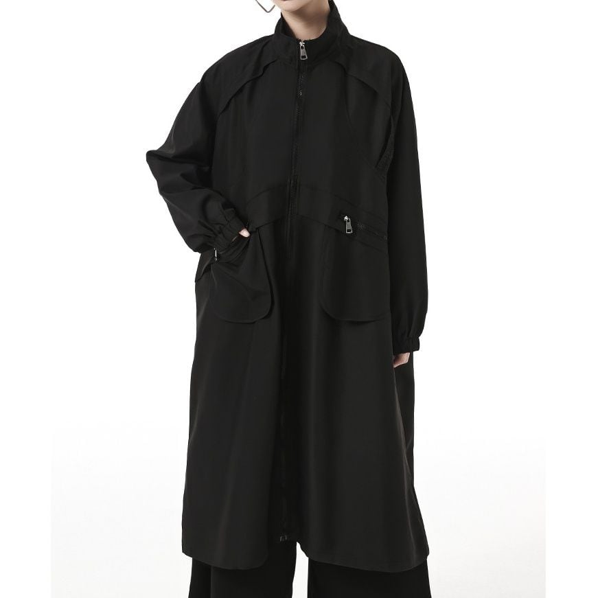 フラップラインやデザインポケットがお洒落な、スタンドカラー・長袖・膝下丈のウインドブレーカーコートです。ゆったりとしたAラインのフルジップデザインが使いやすい、クールな印象のカジュアルアイテムです。アーミーグリーンとブラックの2色から選べます。