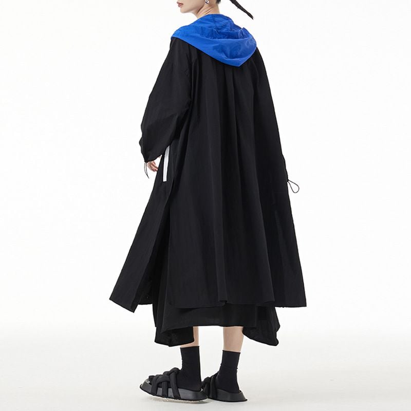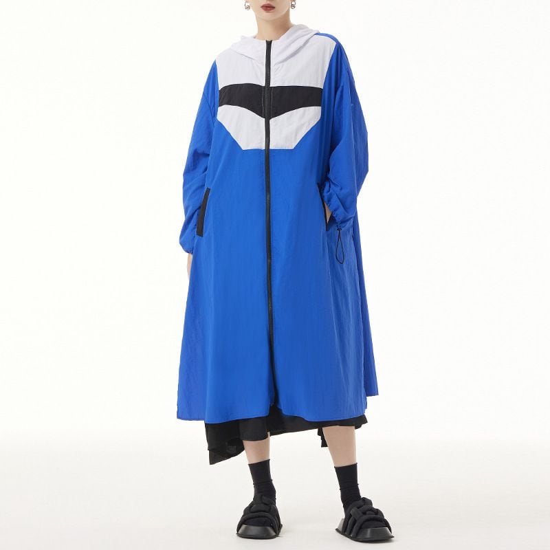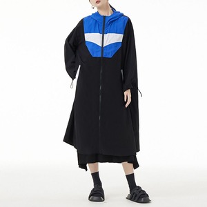 ブルー・ブラック・ホワイトの3色を使ったスティッチデザインが目を惹く、フード付き・長袖・ミドル丈のウインドブレーカーコートです。袖口にドローコード・サイドは深いスリットの入ったフルジップデザインで、コーディネートの主役になるアイテムです。2色から選べます。