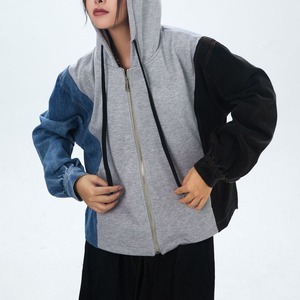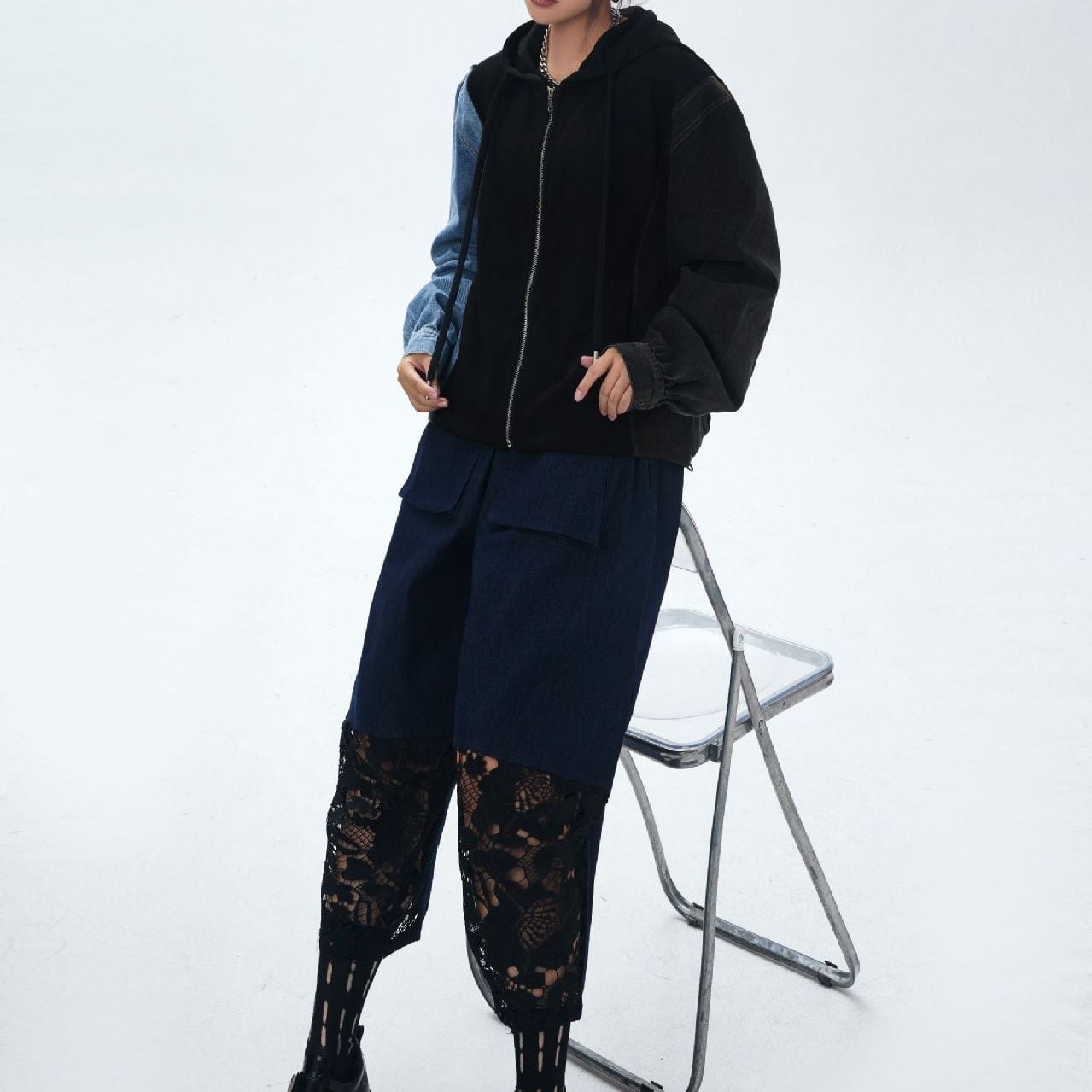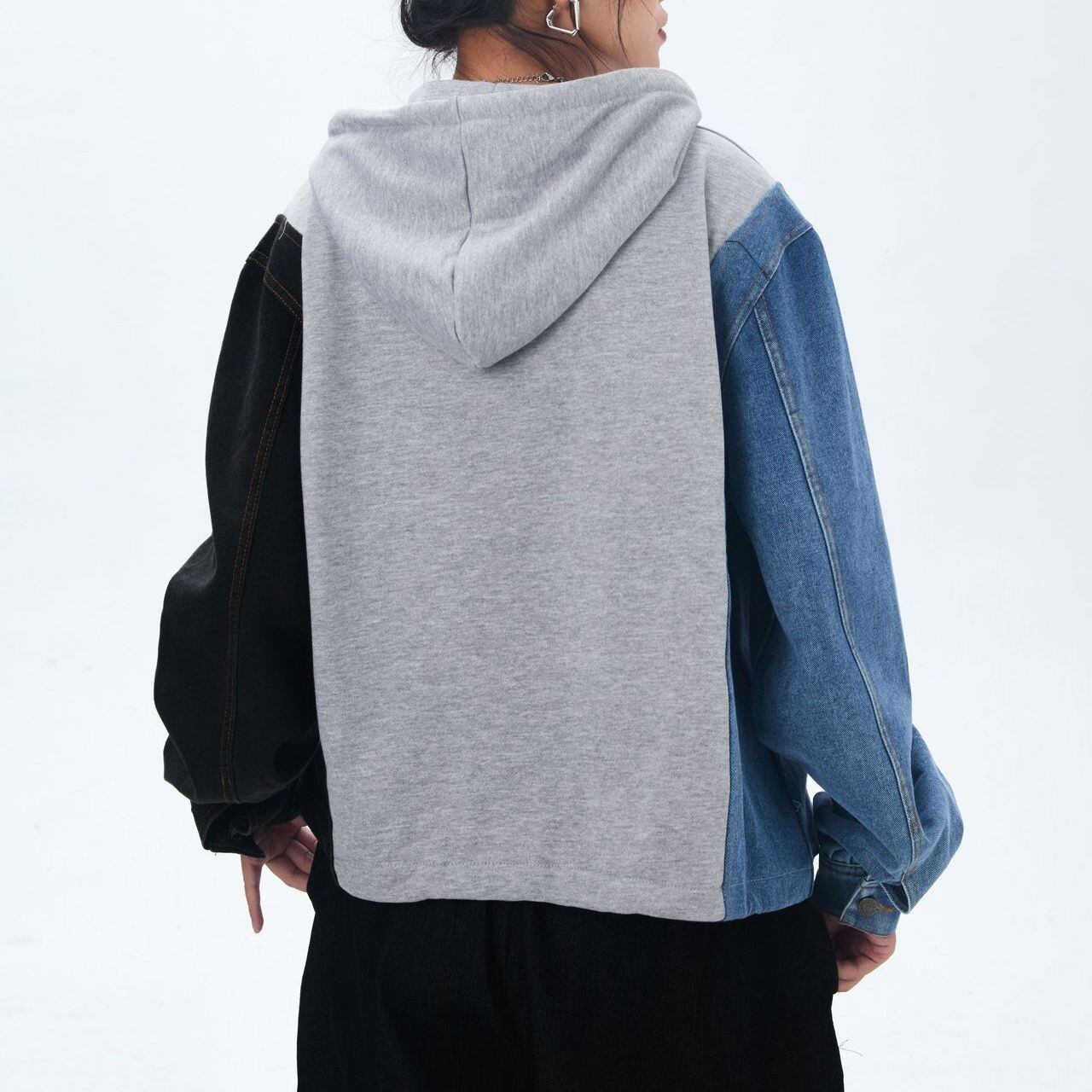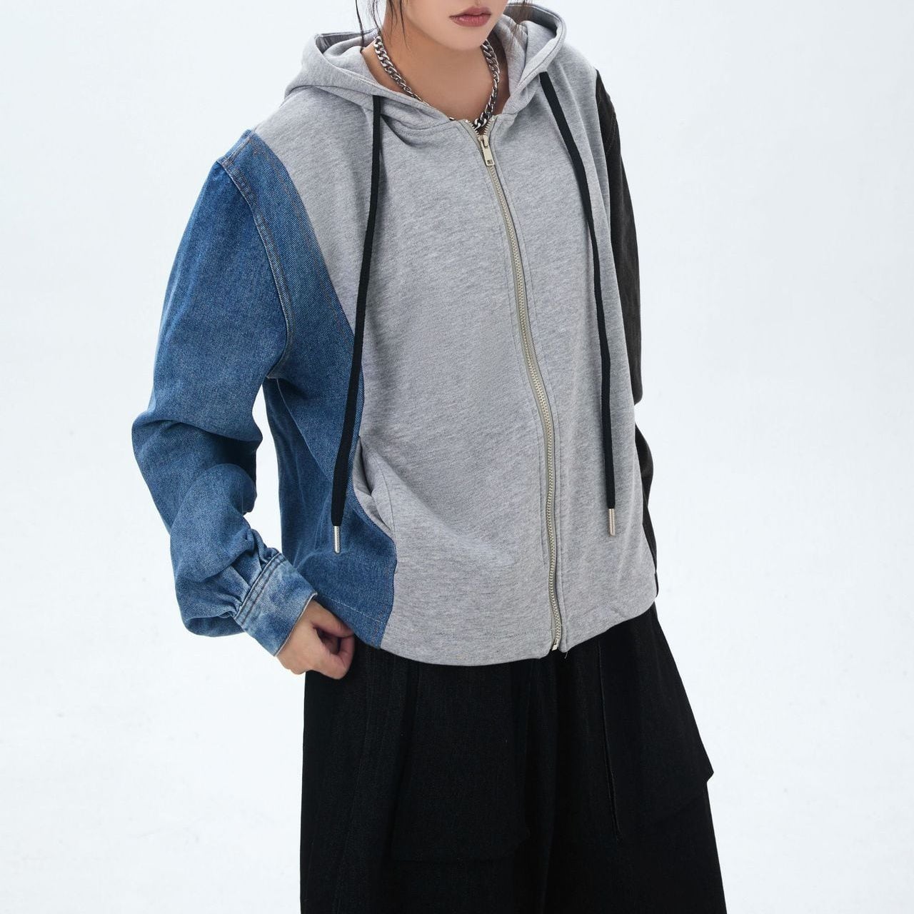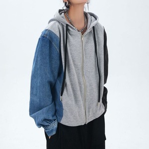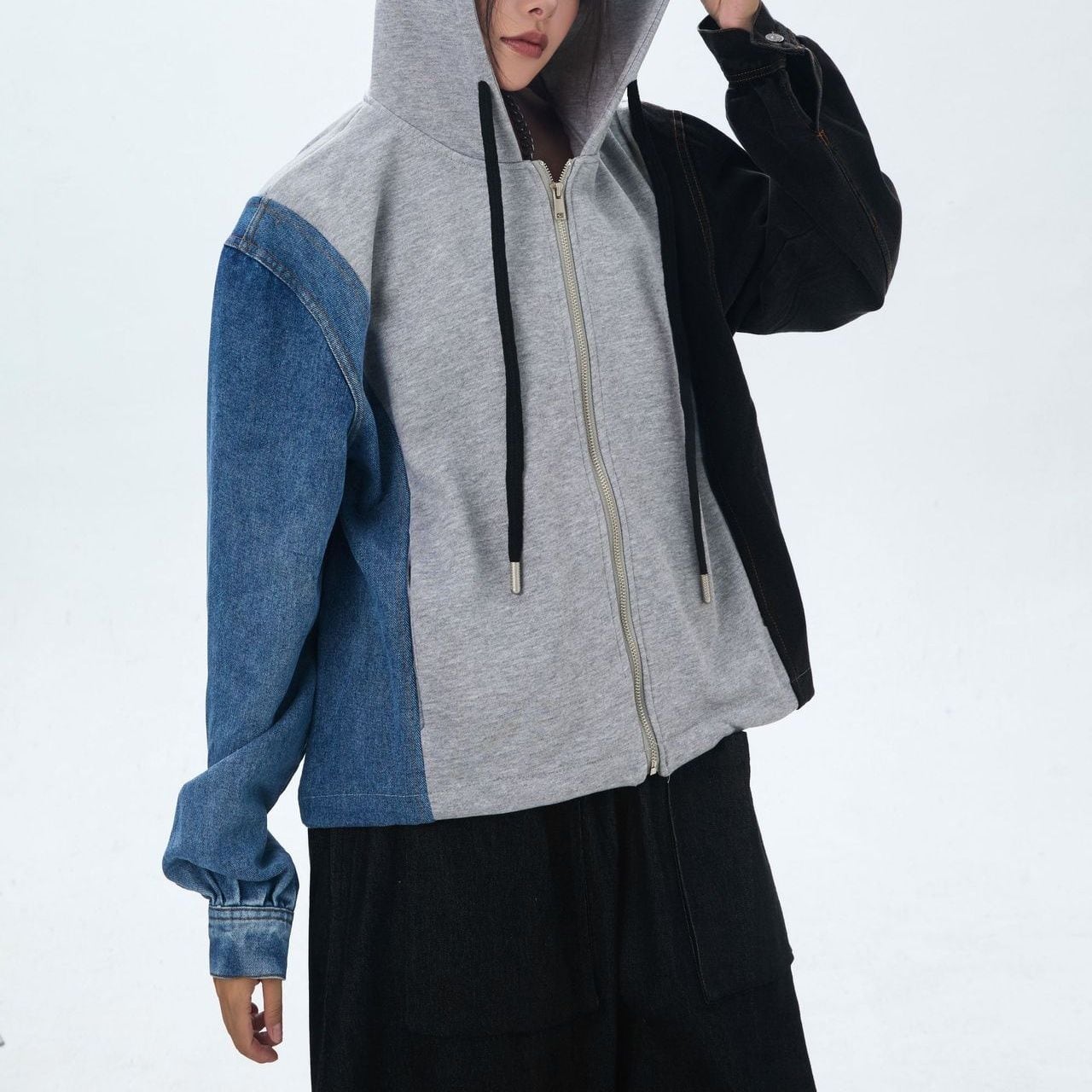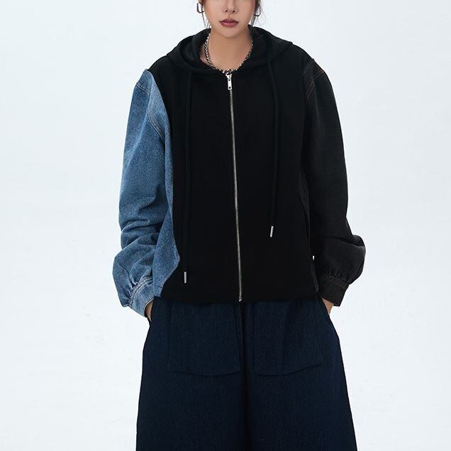 サイドと袖がブラックとブルーのデニム生地でできた、フード付き・長袖・ショート丈のフルジップジャケットです。アシンメトリックなデザインが目を惹く、コーディネートの主役になるカジュアルアイテムです。2種類から選べます。