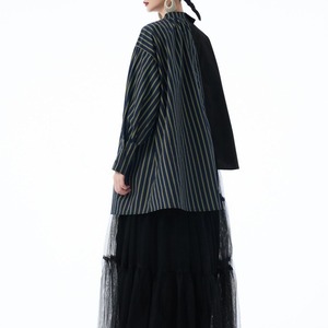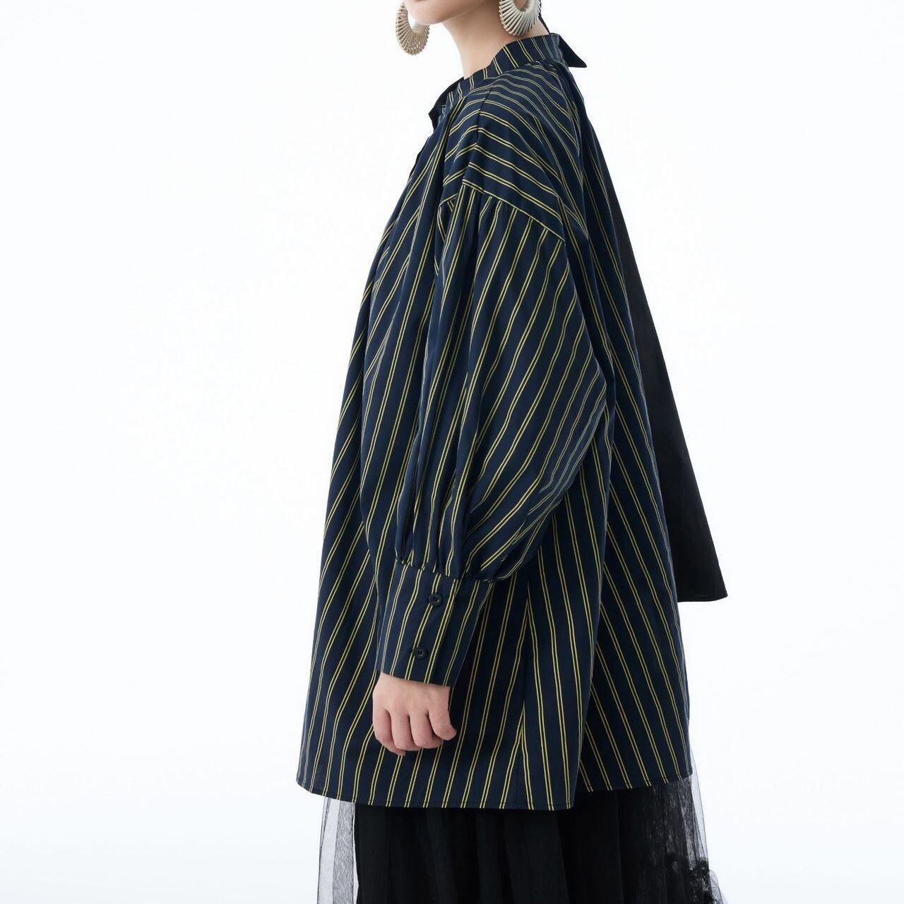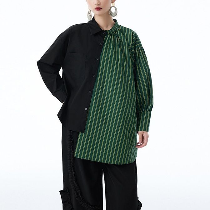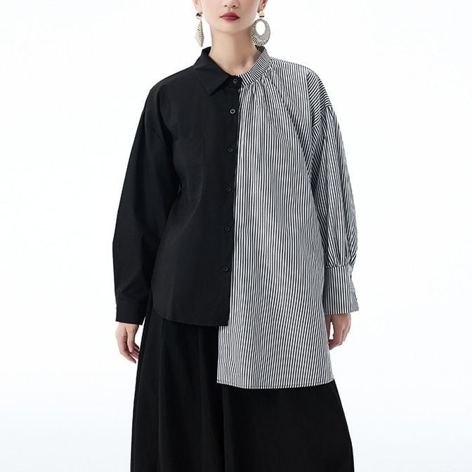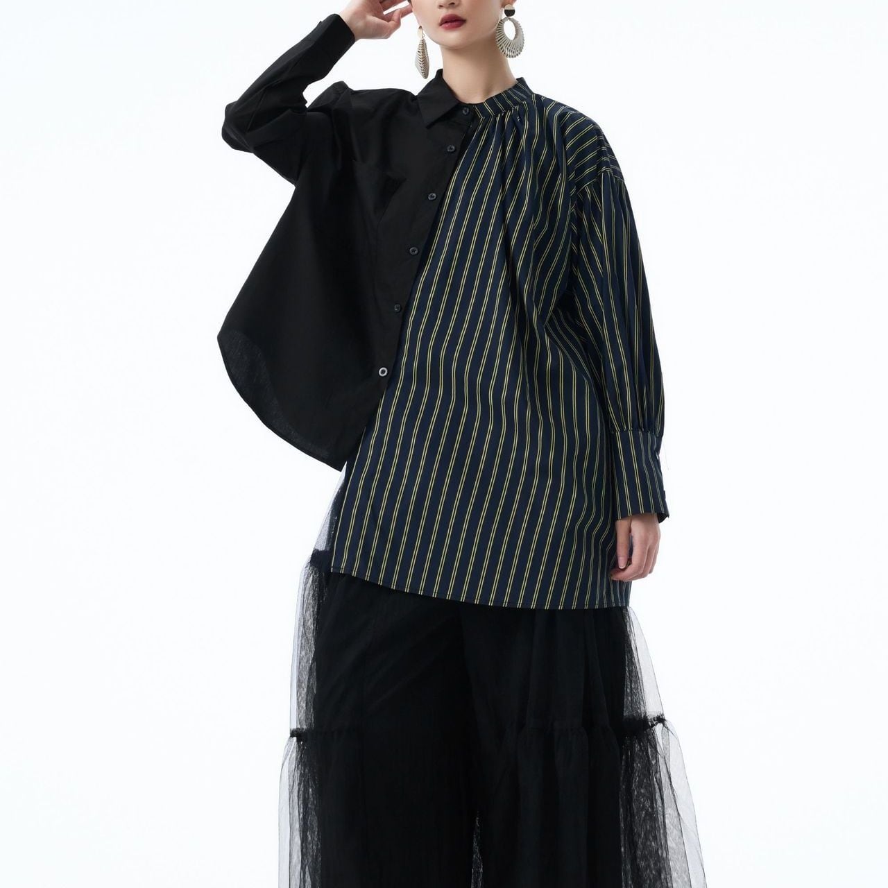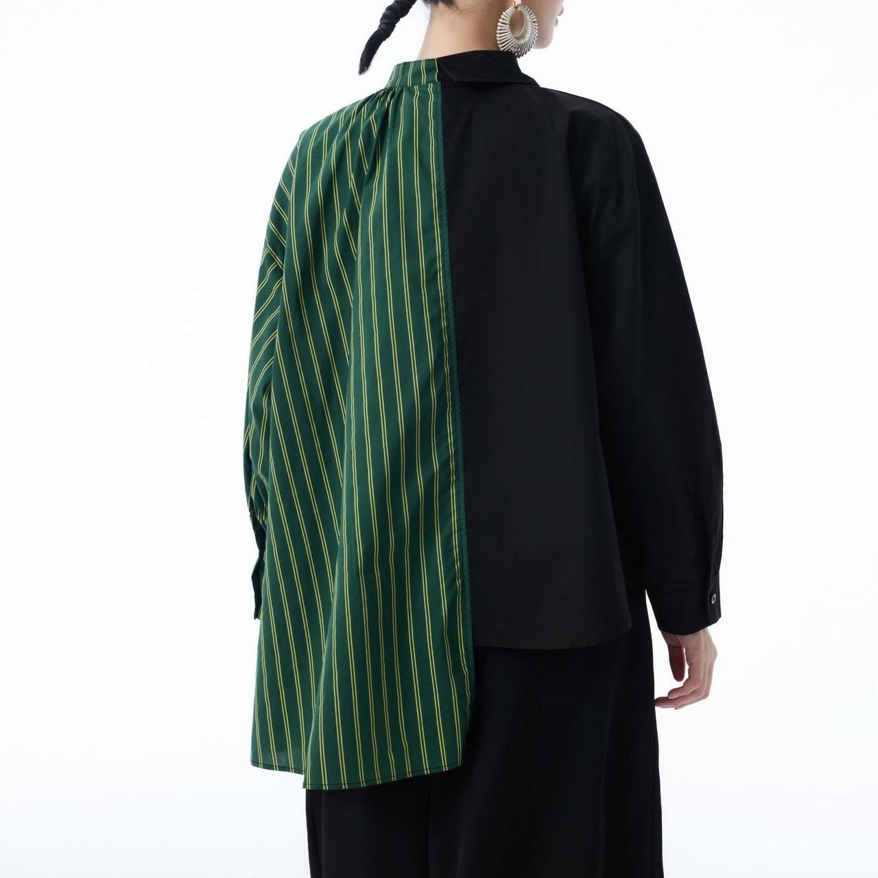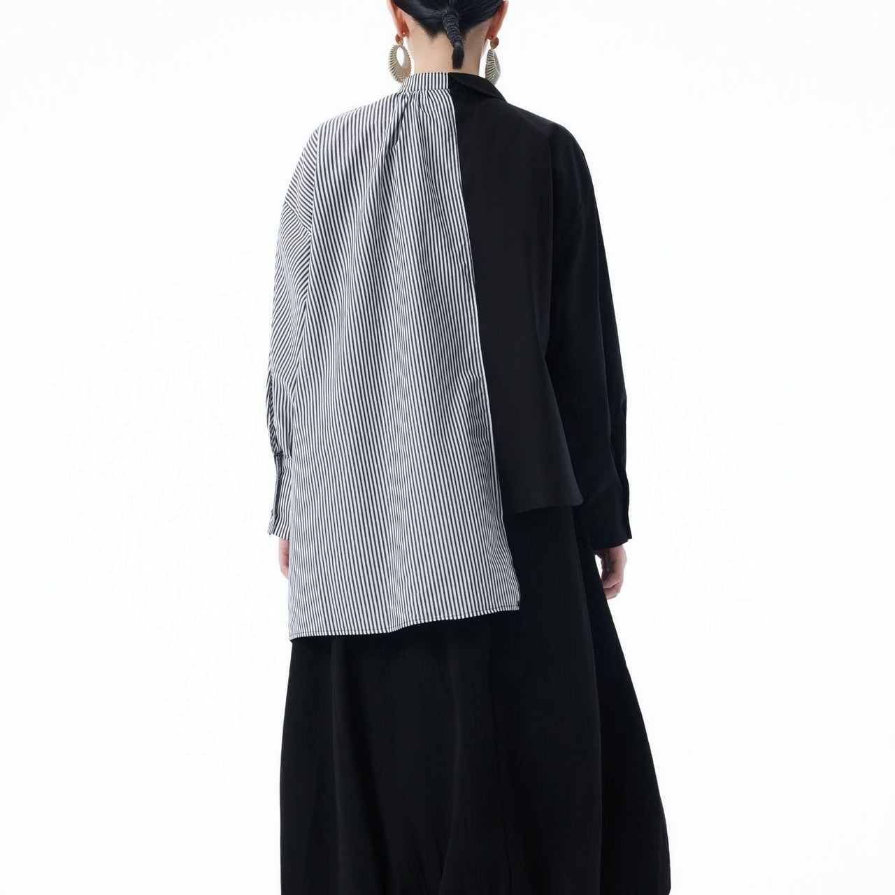 単色とストライプのアシンメトリックなシルエットが目を惹く、長袖・イレギュラーヘムのデザインシャツです。素材だけでなく、襟の形や裾の長さまでが異なる2枚を組み合わせた、モードな印象のお洒落なアイテムです。色は全4色から選べます。