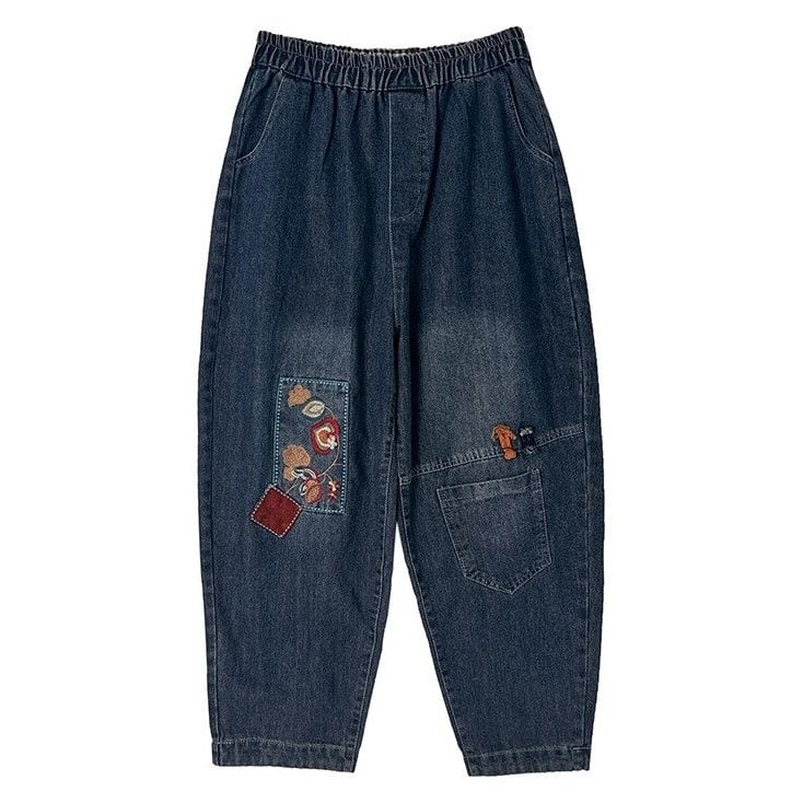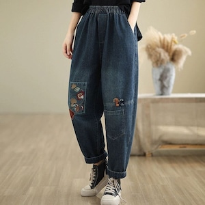 刺繍のパッチや留め具飾りがキュートな、キャロットスタイルのデニムパンツです。ウエストはゴムなので、着脱が簡単で履き心地が良いです。何にでも合わせやすい、レトロ雰囲気のカジュアルアイテムです。