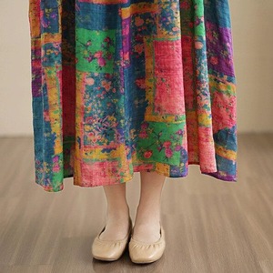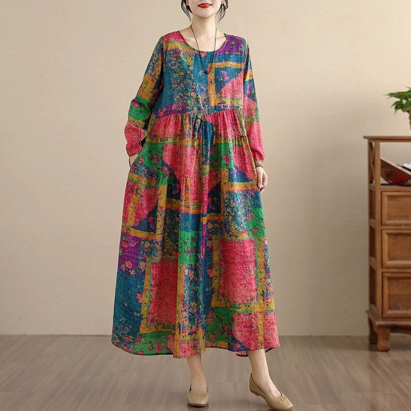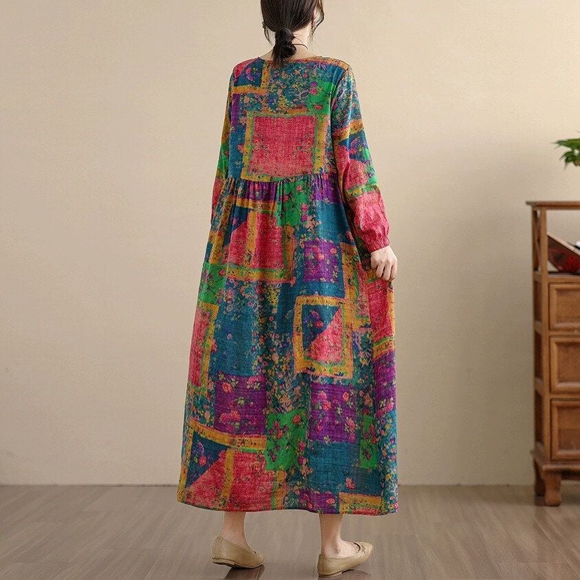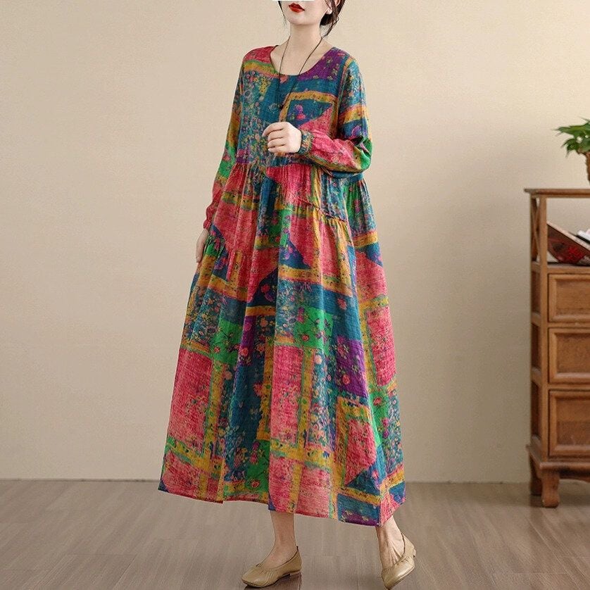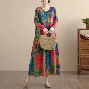 PRINT BOAT NECK A-LINE LONG PULLOVER DRESS 1color M-14478