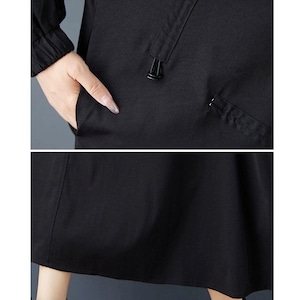 いくつもの短いドローコードが作り出すシルエットがお洒落な、フード付き・長袖・ミドル丈のカジュアルコートです。ワンピースのようなAラインがキュートな、単色のフルジップデザインで使いやすいアイテムです。ブラックとアーミーグリーンの2色から選べます。