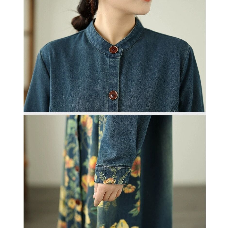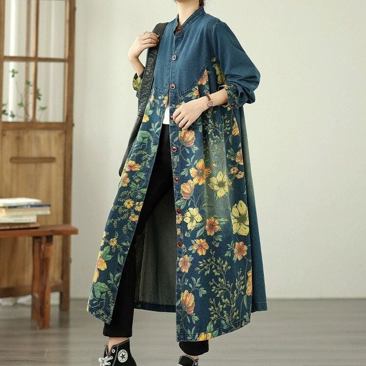 FLOWER PRINT STITCH STAND COLLAR A-LINE MIDI DENIM COAT 1color M-14492