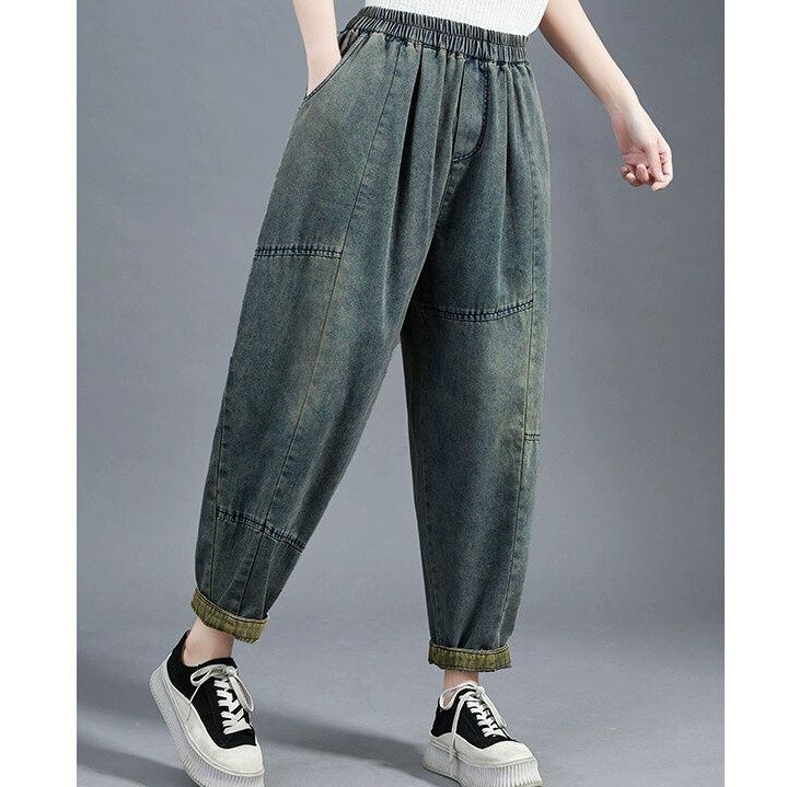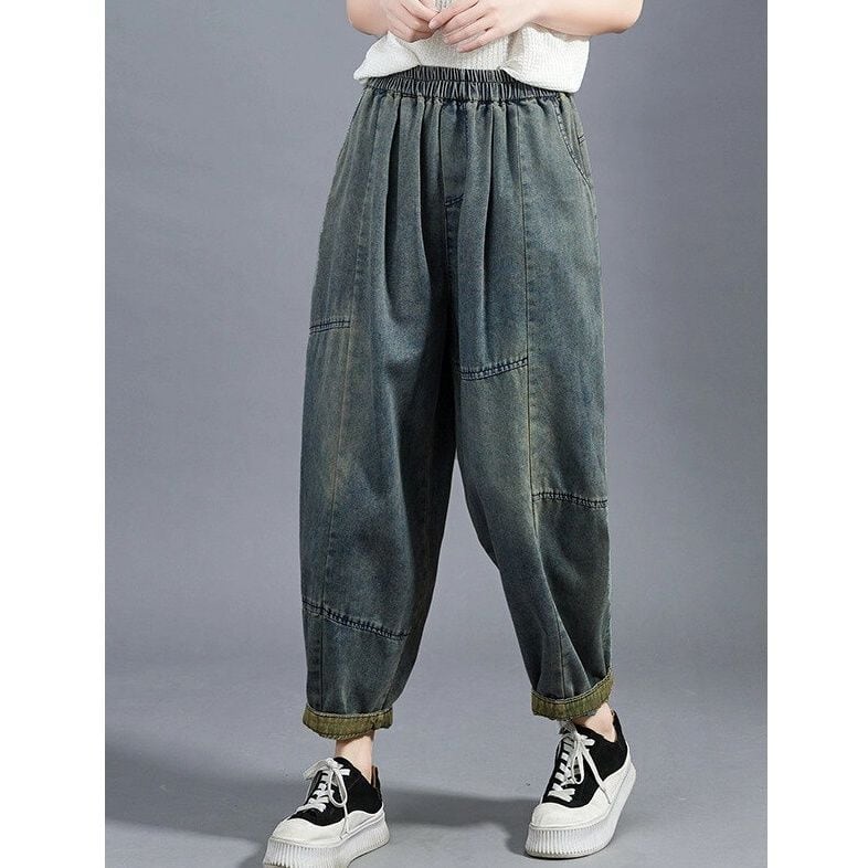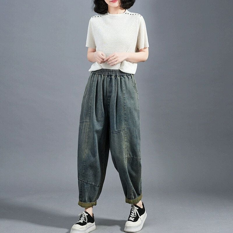 アシンメトリックなスティッチラインがお洒落な、クロップド・デニムパンツです。ウエストはゴムなので、着脱が簡単で履き心地が良いです。ゆったりとしたキャロットシルエットで、折り返した裾をカラースティッチでアクセントにしたデザインがキュートなアイテムです。
