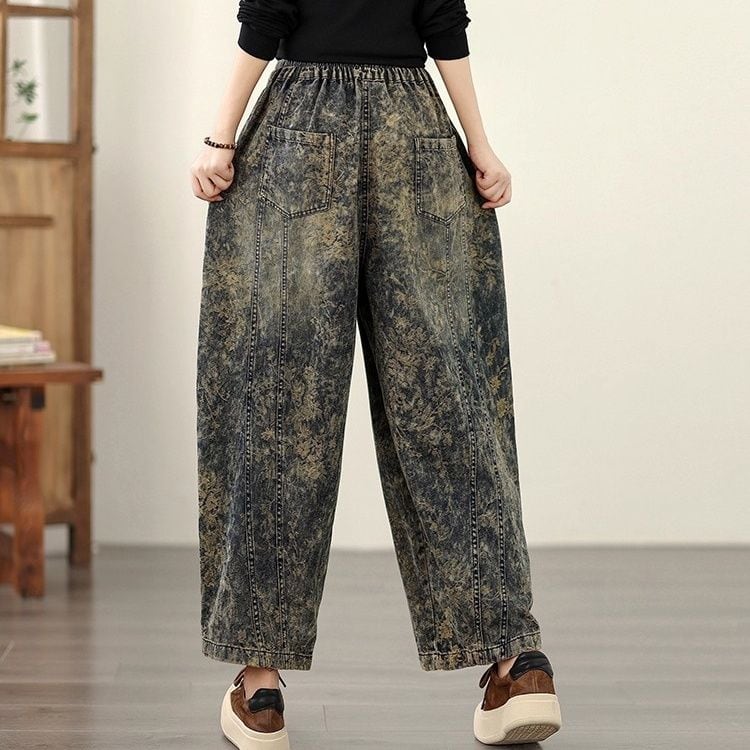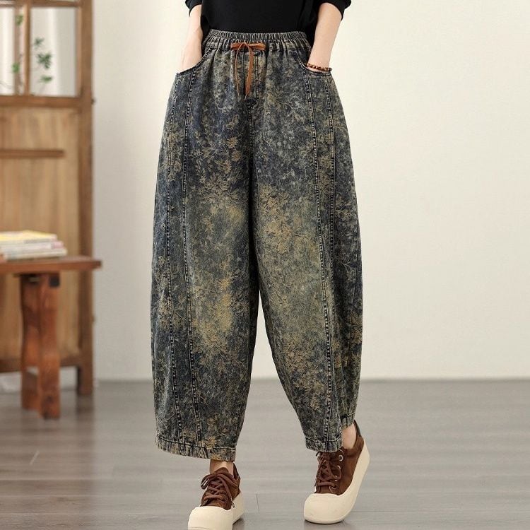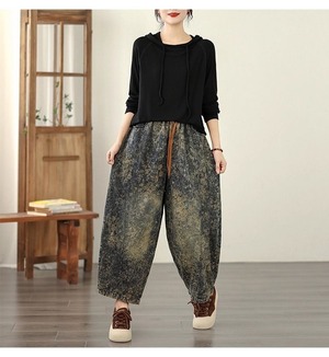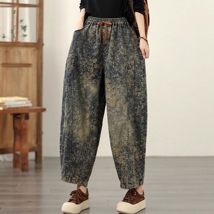 さりげないボタニカル柄がお洒落な、ワイドレッグ・クロップド・デニムパンツです。ウエストはドローストリングなので、着脱が簡単で履き心地が良いです。裾に向かって少しだけ絞られたシルエットが魅力的な、コーディネートしやすいアイテムです。