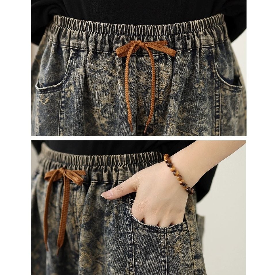 BOTANICAL PRINT DRAWSTRING WAIST WIDE LEG CROPPED DENIM PANTS 1color M-14496