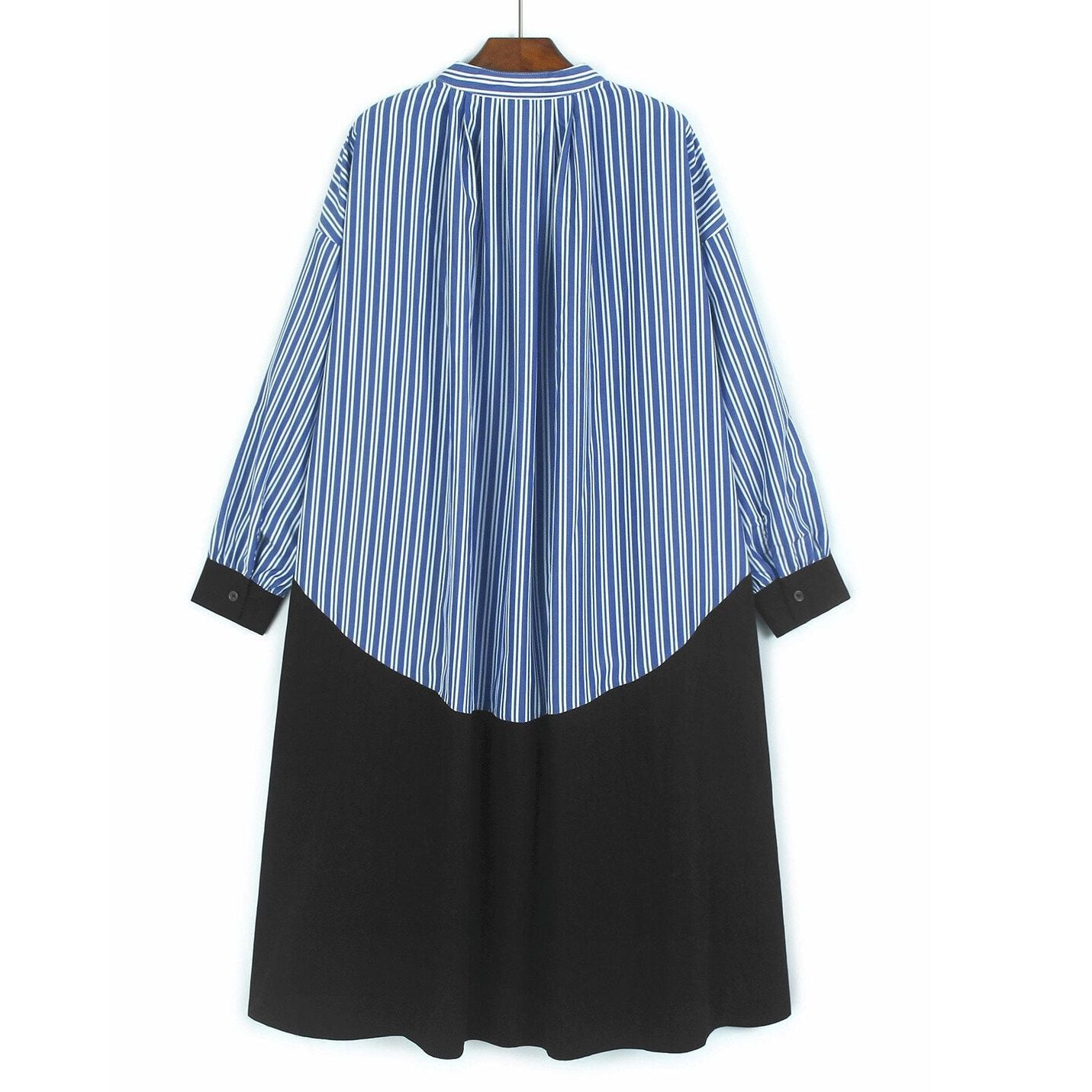 ストライプと無地の切り替えが印象的なロング丈ワンピースです。纏うだけで存在感を放ち、日常から特別なシーンまでドラマティックに輝きます。