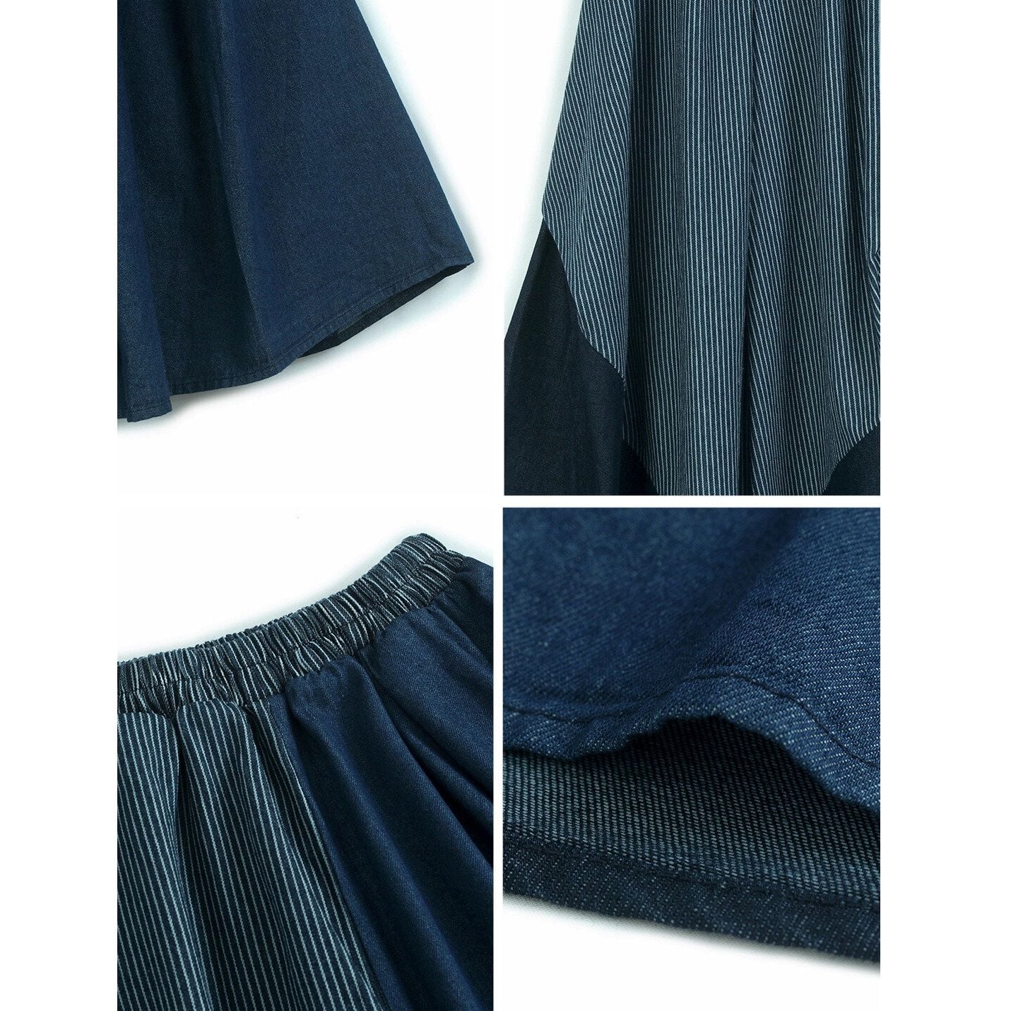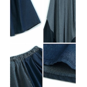 ストライプとデニムを組み合わせたAラインのミディ丈スカートです。纏うだけで個性的なムードを演出し、日常のスタイルに華やかな印象を加えます。