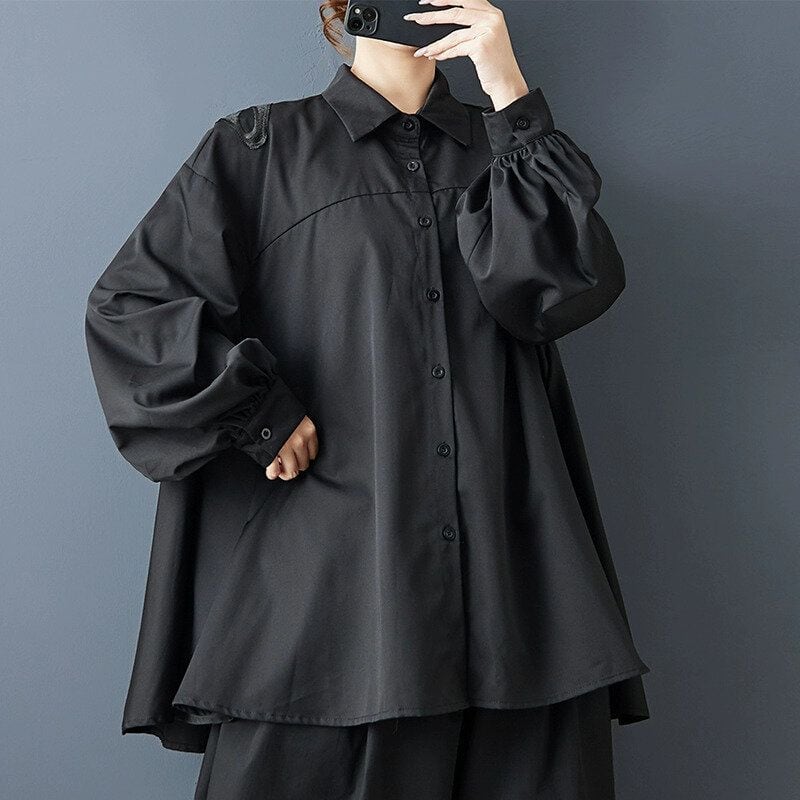 バックの大きな蝶のモチーフが目を惹く、ブラックのポロ襟・長袖・デザインシャツです。ランタンスリーブや大きく広がるAラインのシルエットが魅力的な、ブラックの単色ながらもコーディネートの主役になるアイテムです。