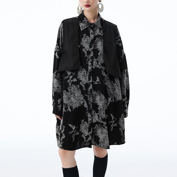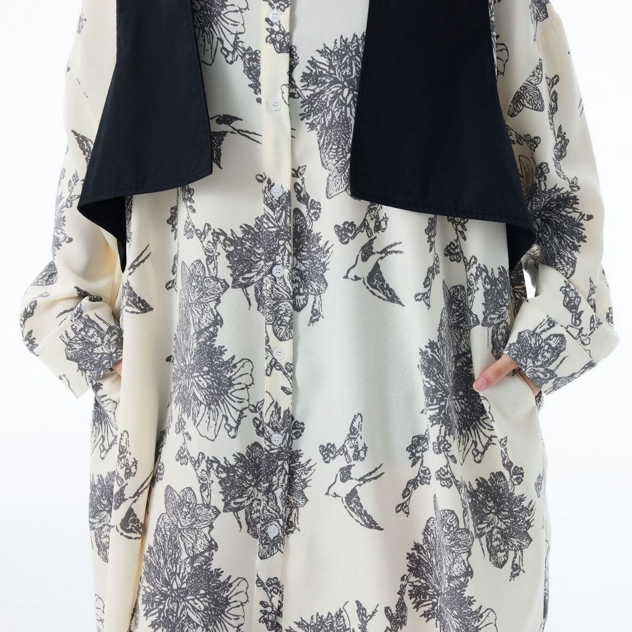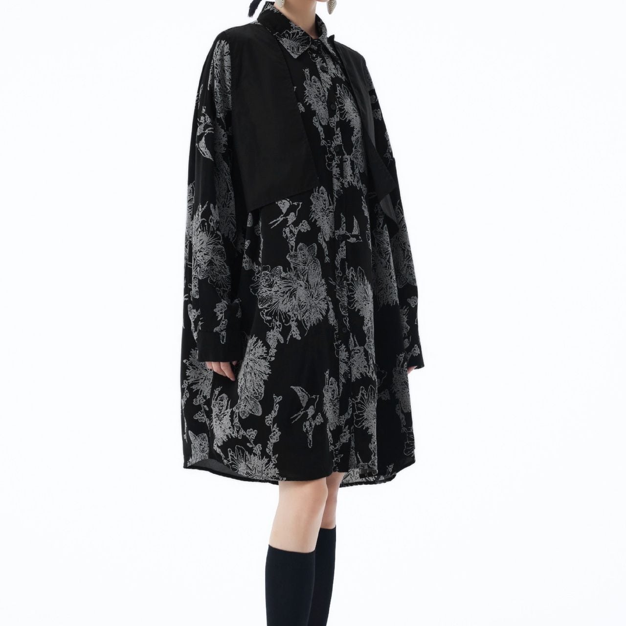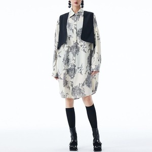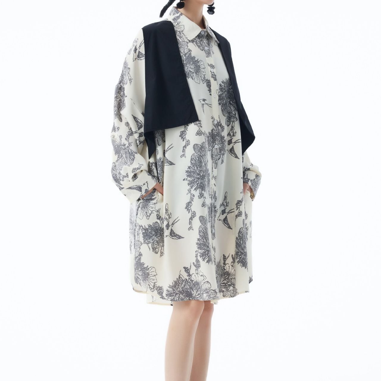 ブラックのショートベストを重ねたようなフェイクツーピースデザインがお洒落な、ポロ襟・長袖・膝上丈のシャツワンピースです。モノトーンカラーのボタニカルプリントが魅力的な、ゆったりとしたシルエットのアイテムです。ブラックとホワイトの2色から選べます。