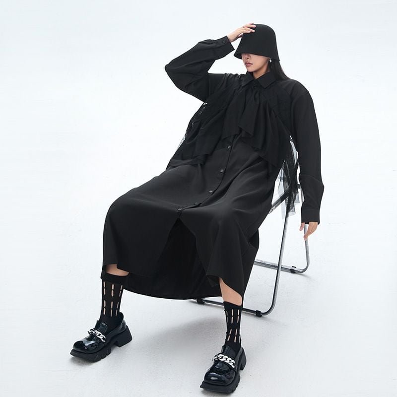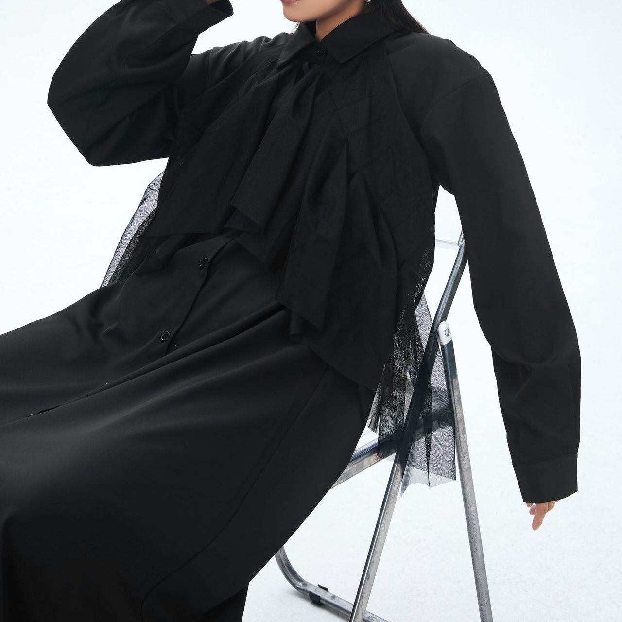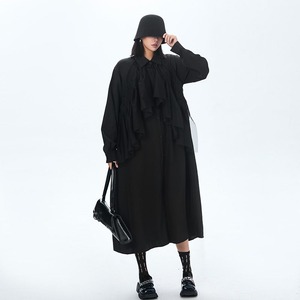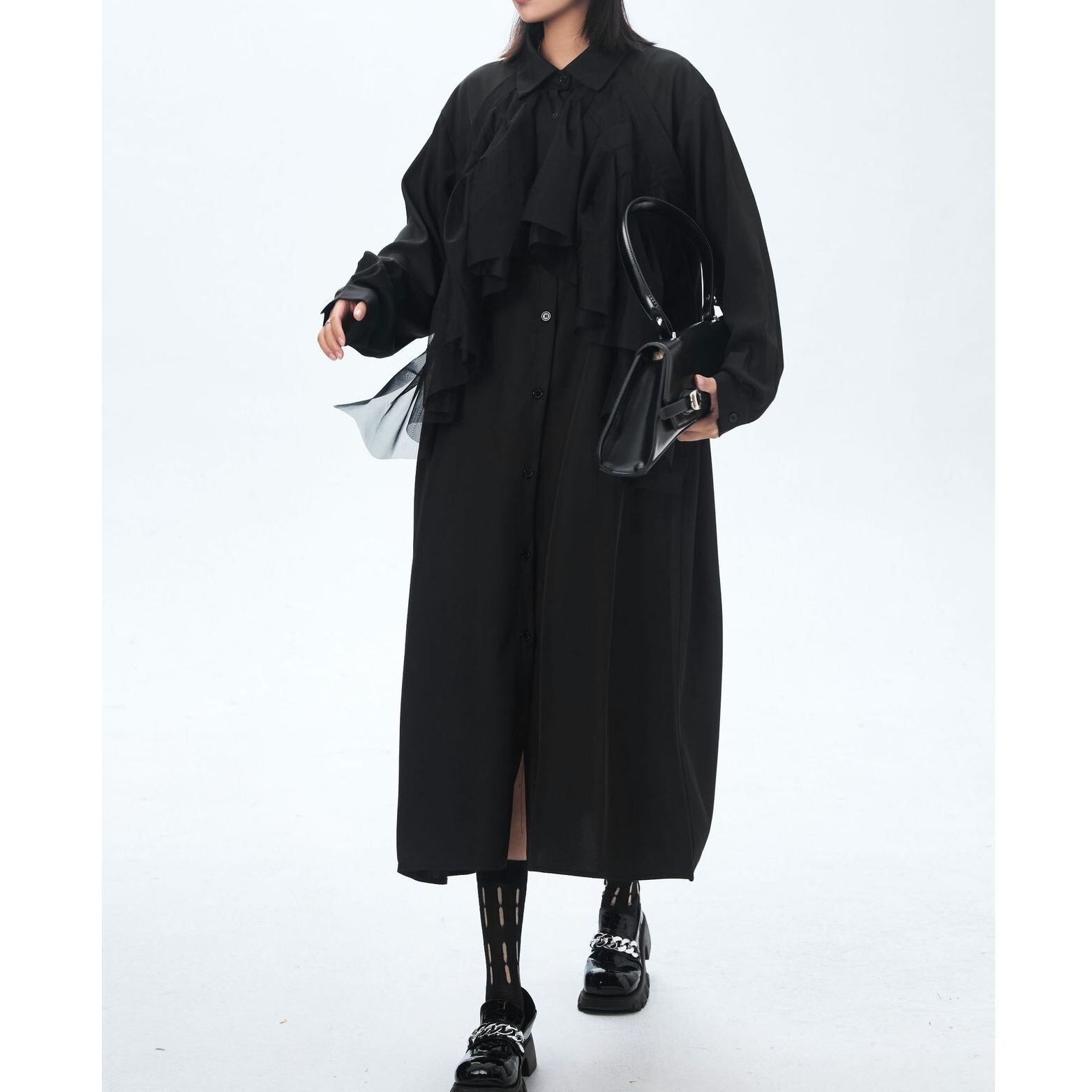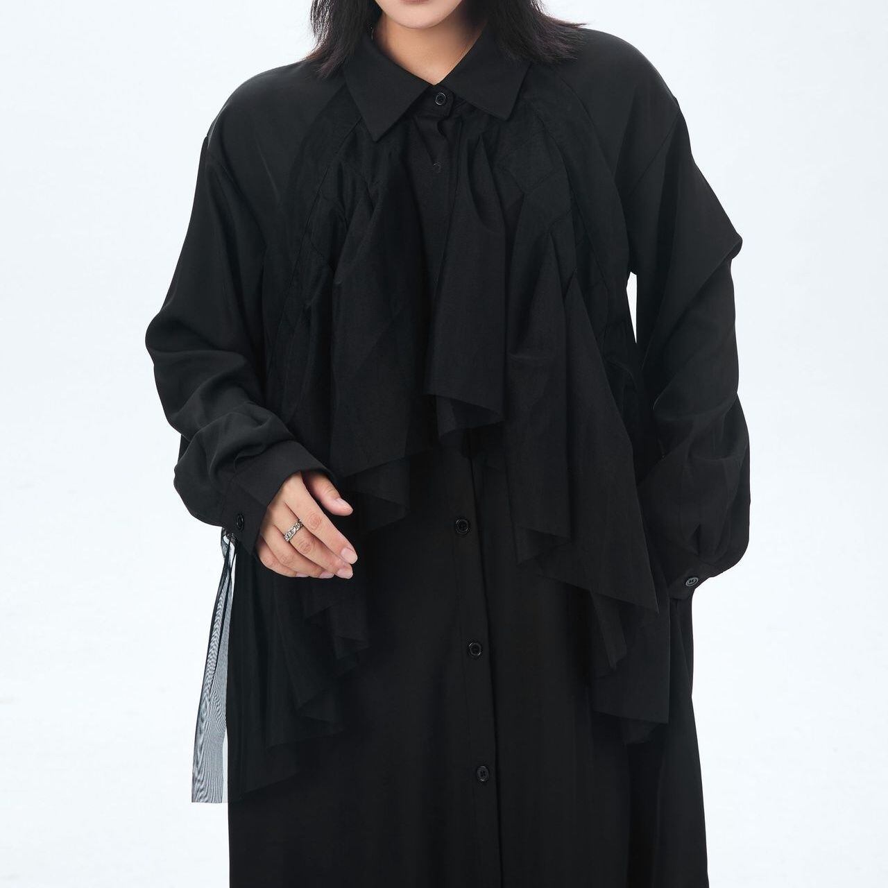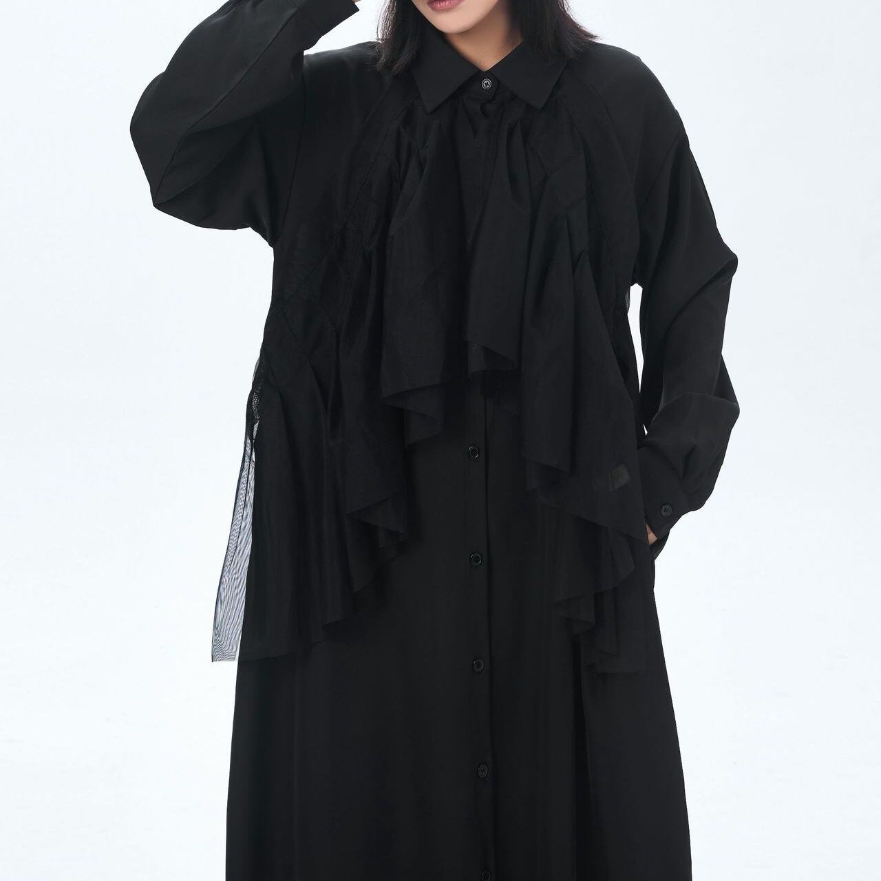 メッシュレイヤーの大きなフリル飾りが目を惹く、ポロ襟・長袖・膝下丈のシャツワンピースです。オールブラックのゆったりとしたシルエットが、クール&モードな印象のアイテムです。