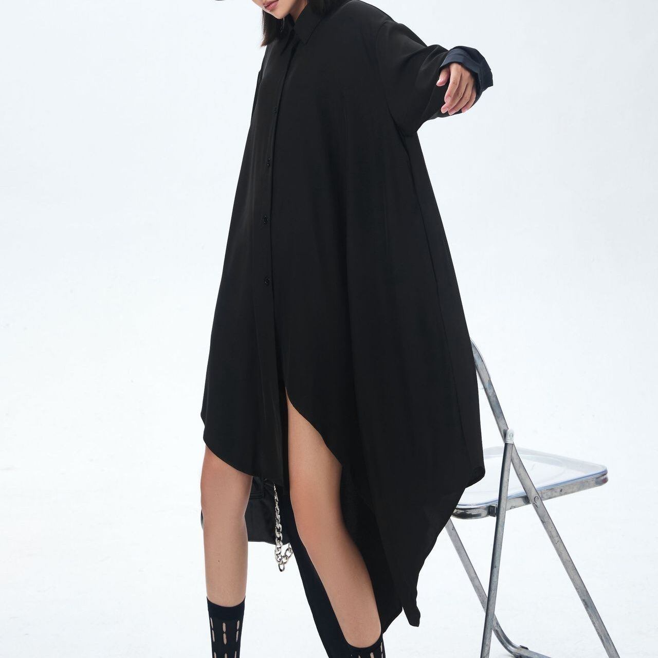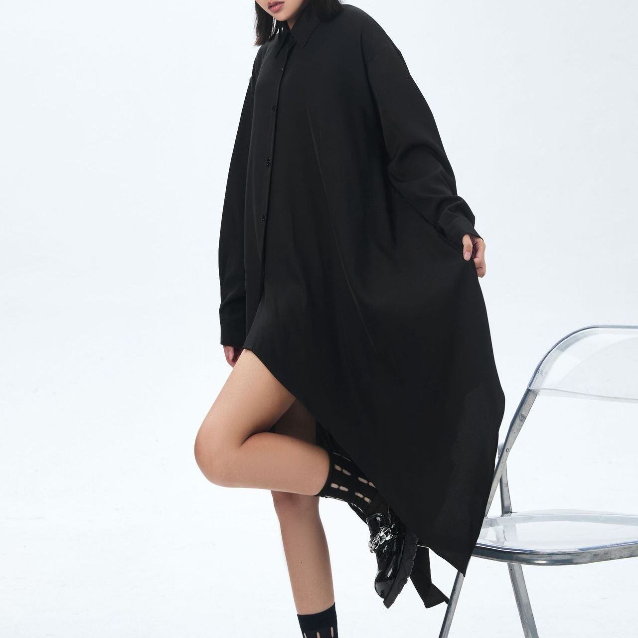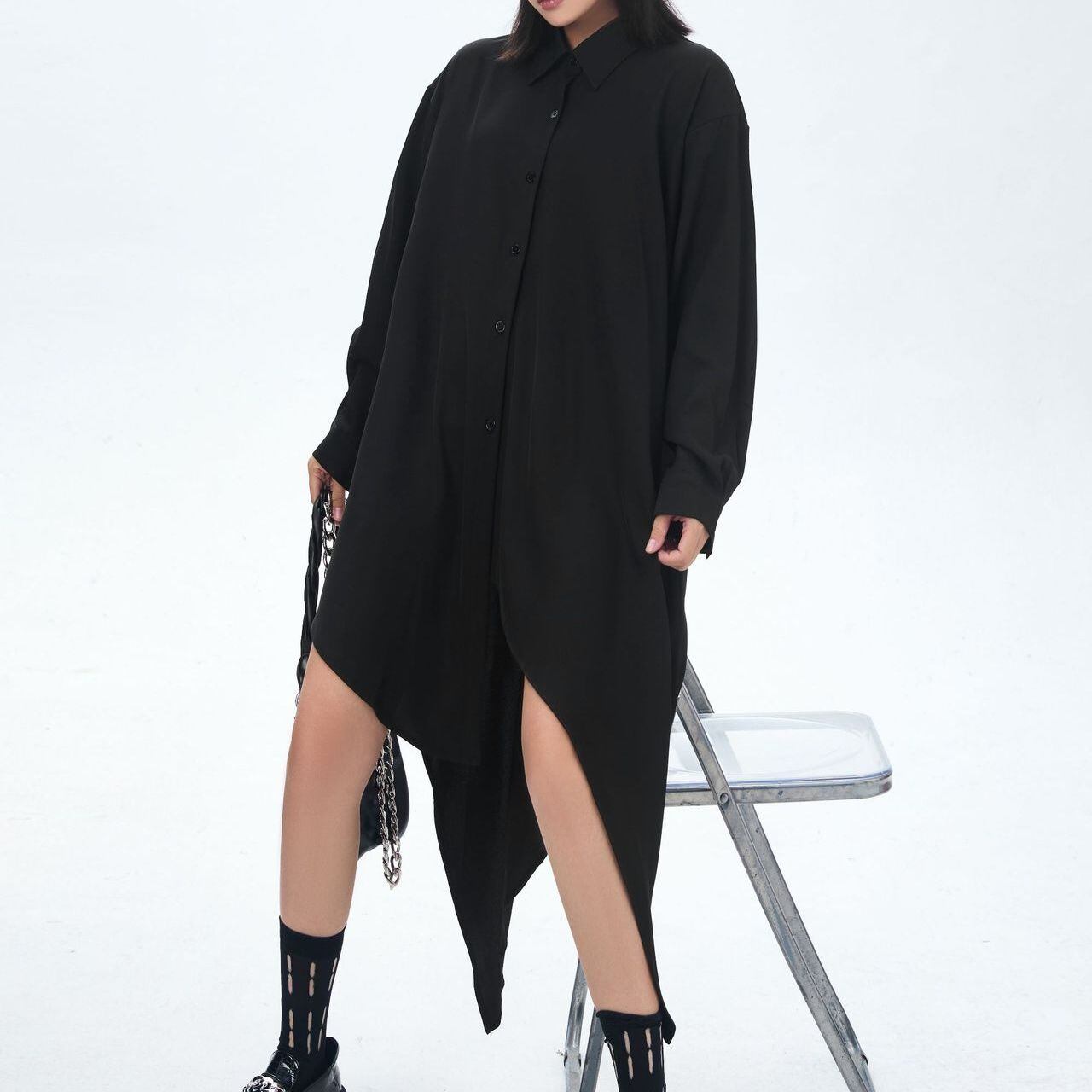 イレギュラーな裾のラインが目を惹く、ポロ襟・長袖・ミドル丈のシャツワンピースです。オールブラックのゆったりとしたシルエットが、クール&モードな印象のアイテムです。シャツジャケットとしても使えます。