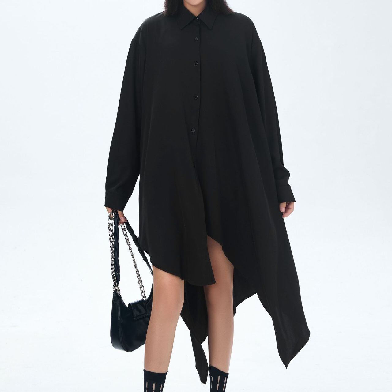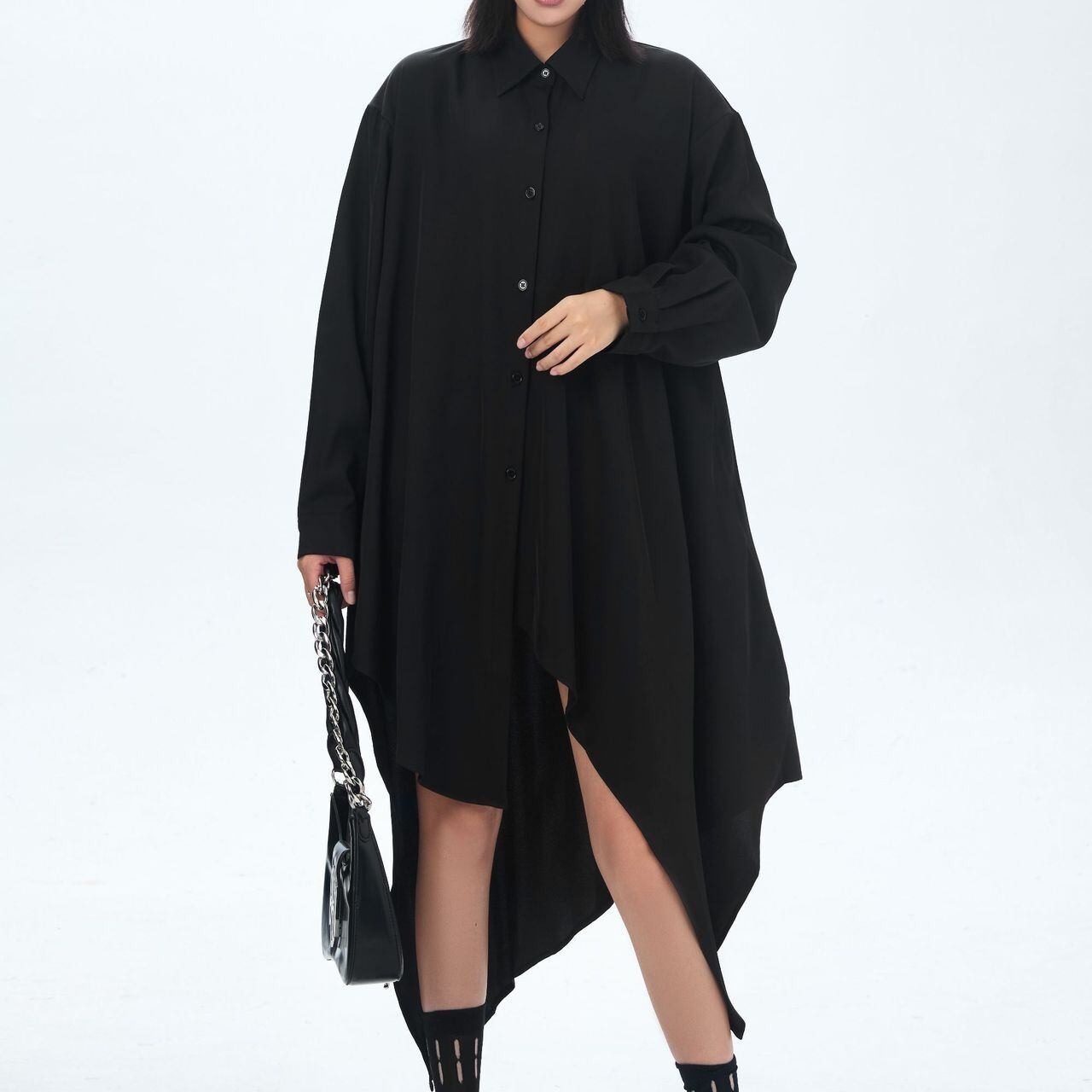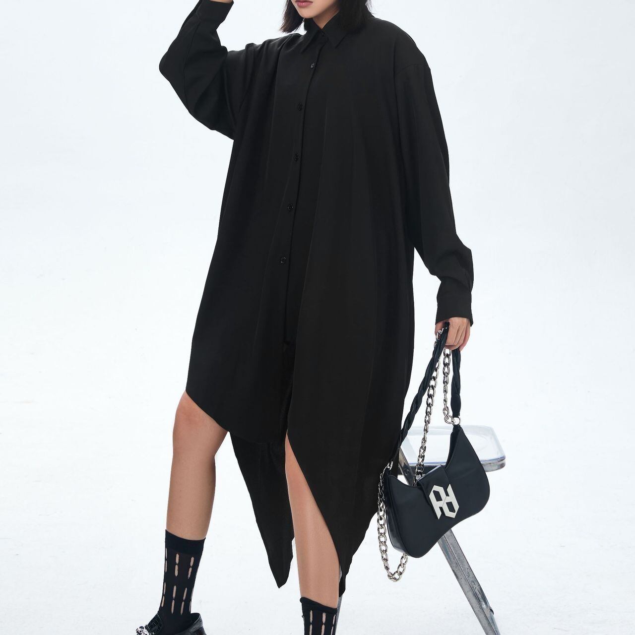 イレギュラーな裾のラインが目を惹く、ポロ襟・長袖・ミドル丈のシャツワンピースです。オールブラックのゆったりとしたシルエットが、クール&モードな印象のアイテムです。シャツジャケットとしても使えます。