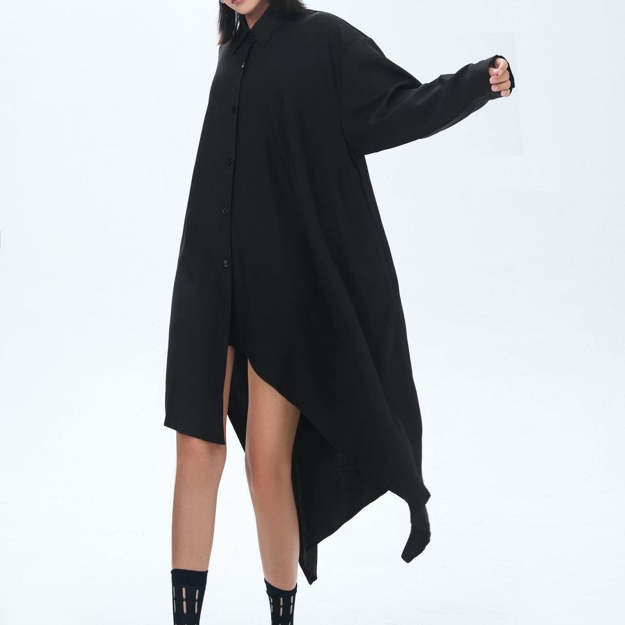 BLACK ASYMMETRIC DESIGN LONG SLEEVES MIDI SHIRT DRESS 1color M-14558