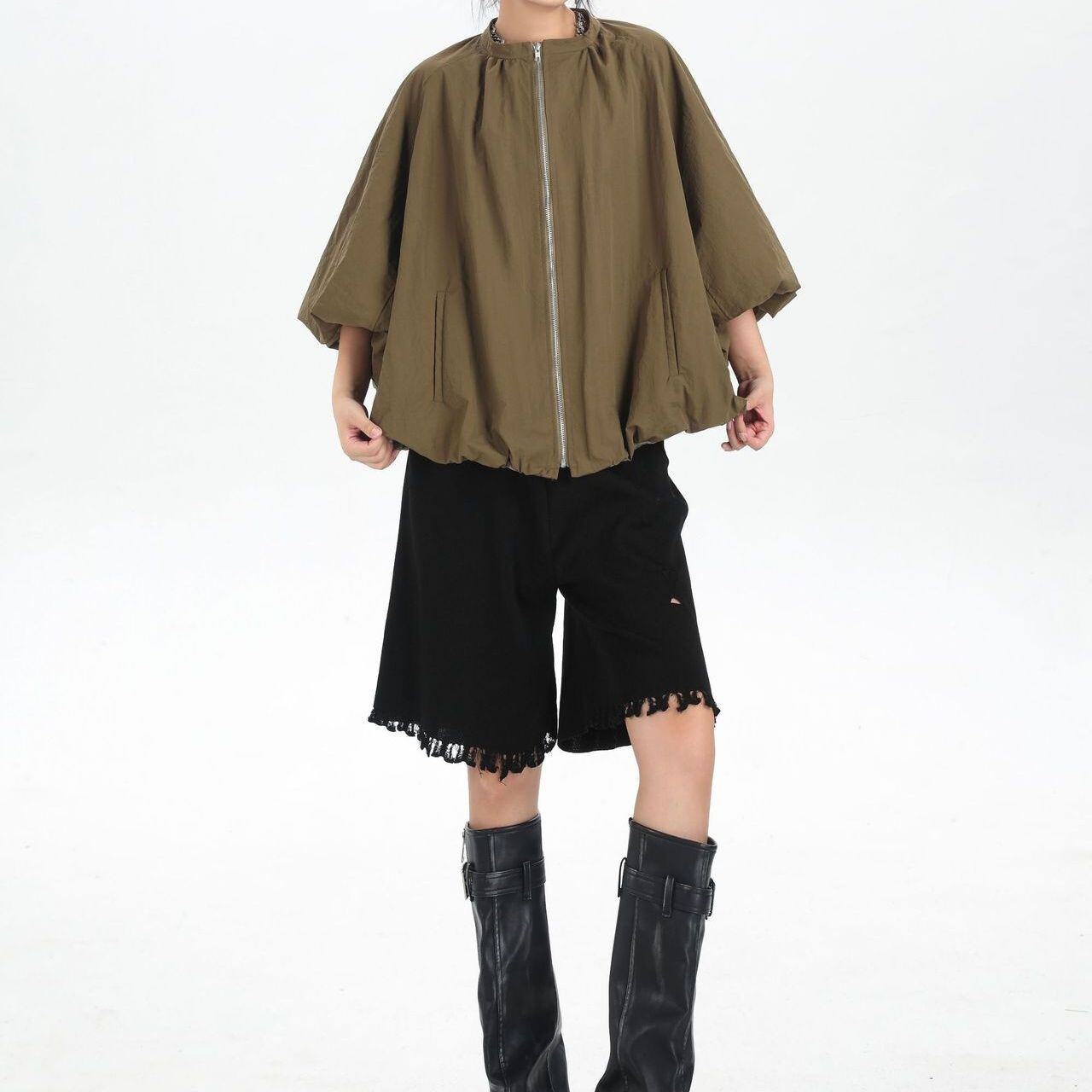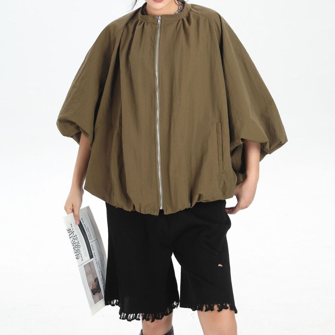 ランタンのような丸みのあるシルエットがお洒落な、スタンドカラー・7分袖のデザインジャケットです。フルジップ+ワイド幅で使いやすい、単色でモードな印象のアイテムです。ブラックとカーキの2色から選べます