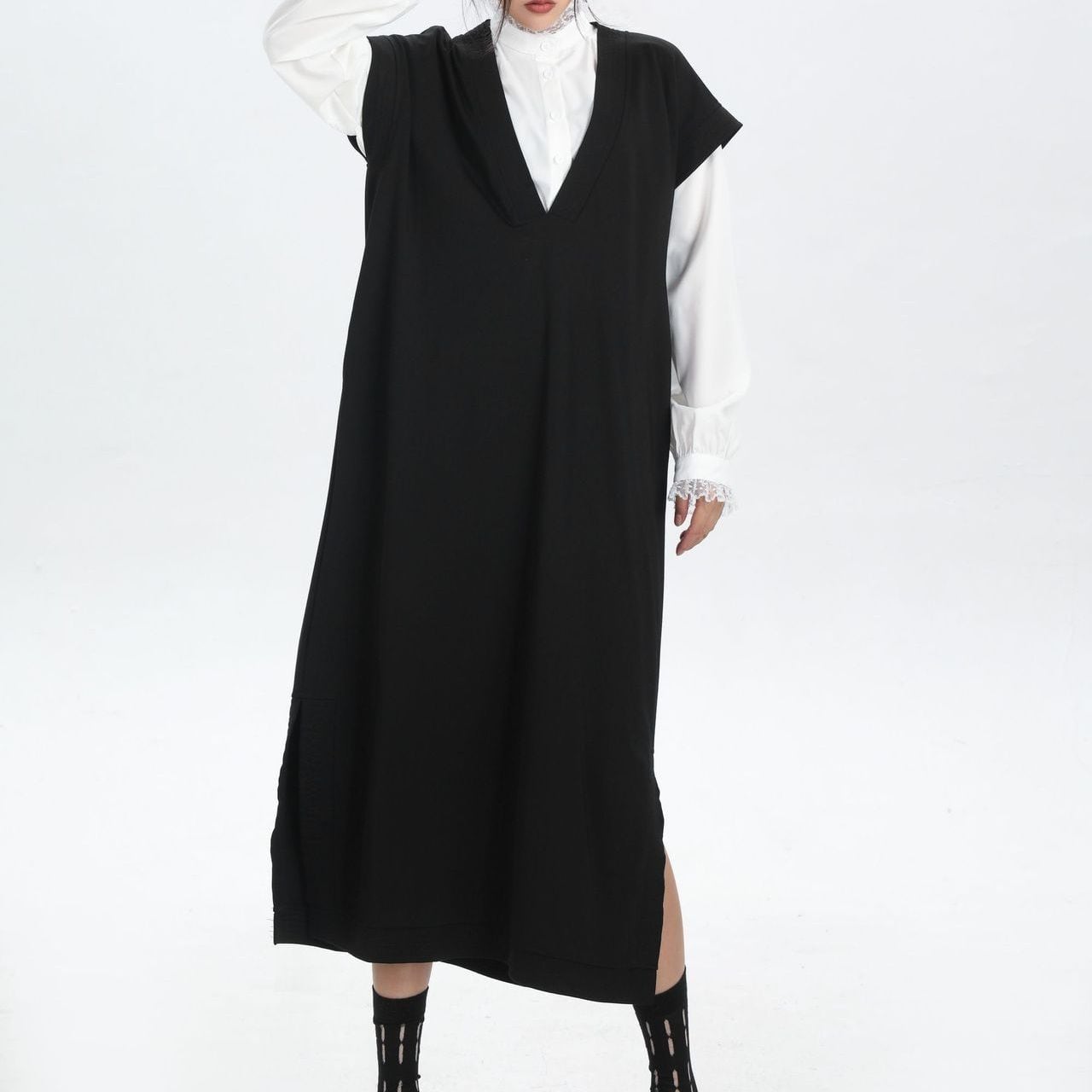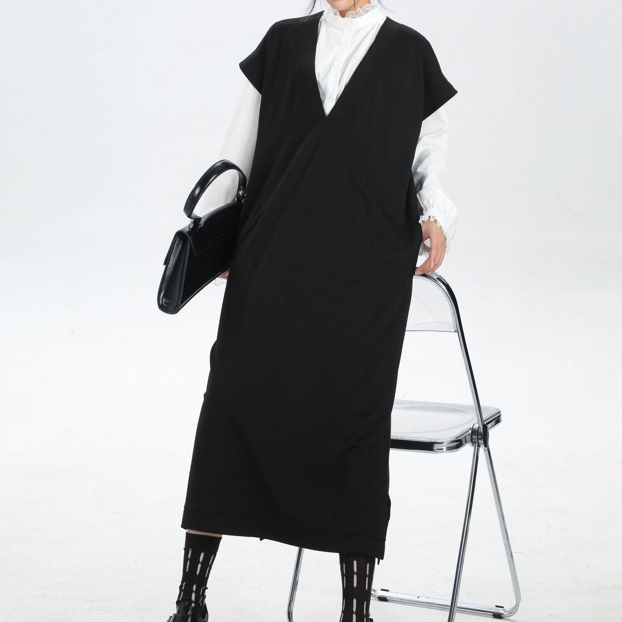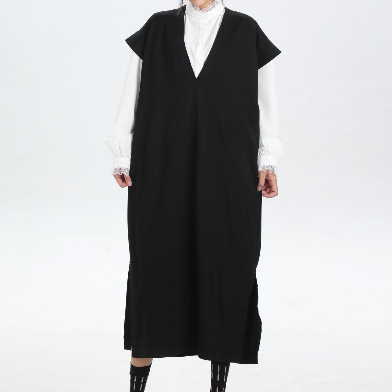 BLACK V-NECK FRENCH SLEEVES MIDI VEST DRESS 1color M-14570