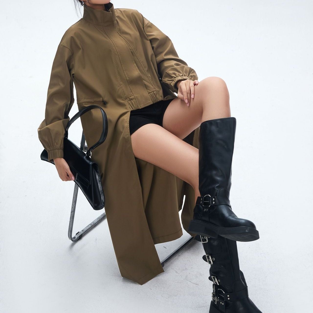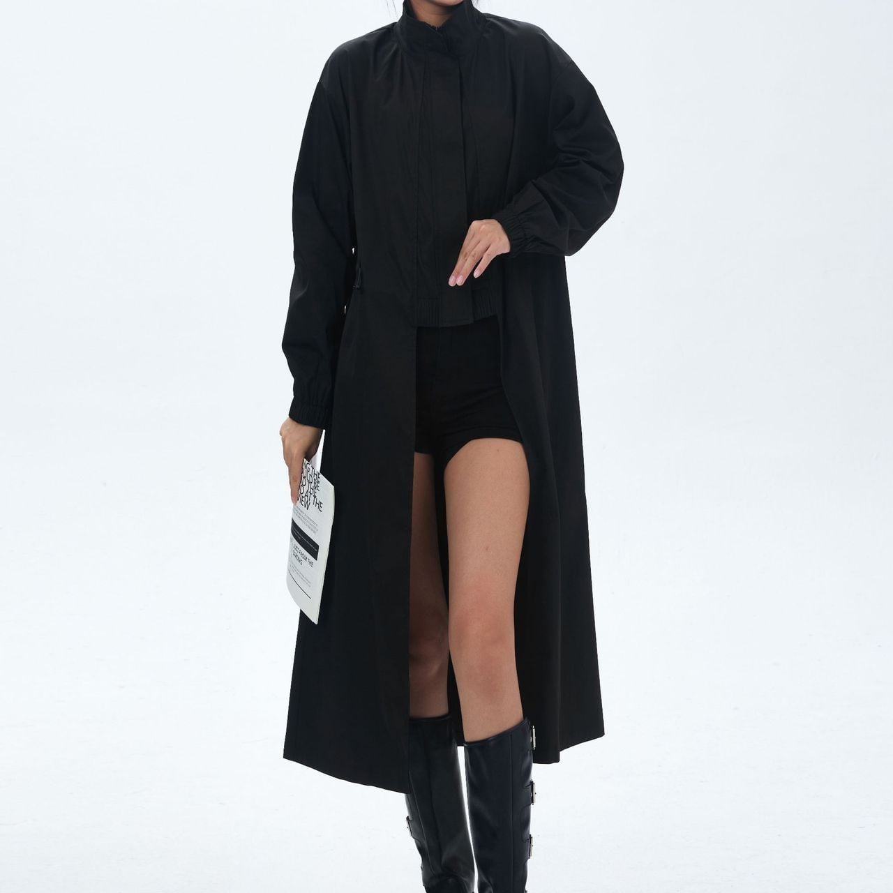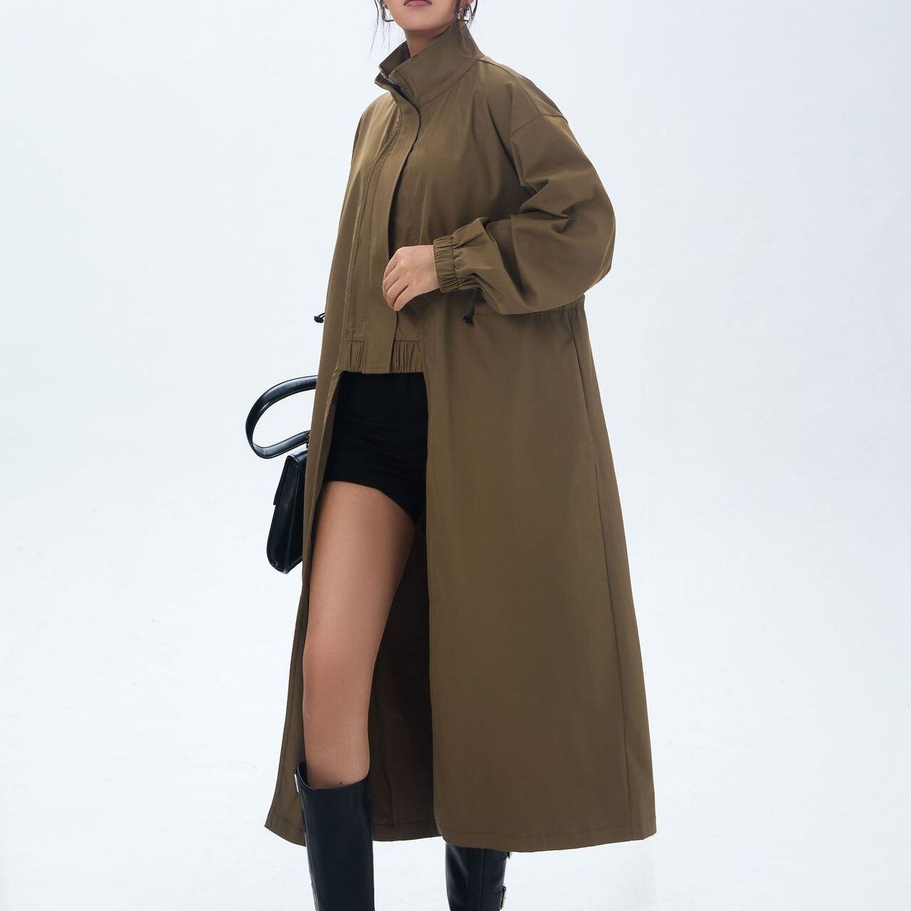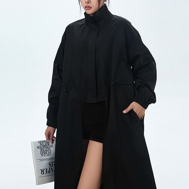 フロントセンターのみがショート丈のシルエットが目を惹く、スタンドカラー・長袖・イレギュラーヘムのデザインコートです。サイドからバックは膝下丈で、ウエストのドローコードでシルエットをアレンジできます。ブラックとカーキの2色から選べます