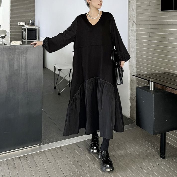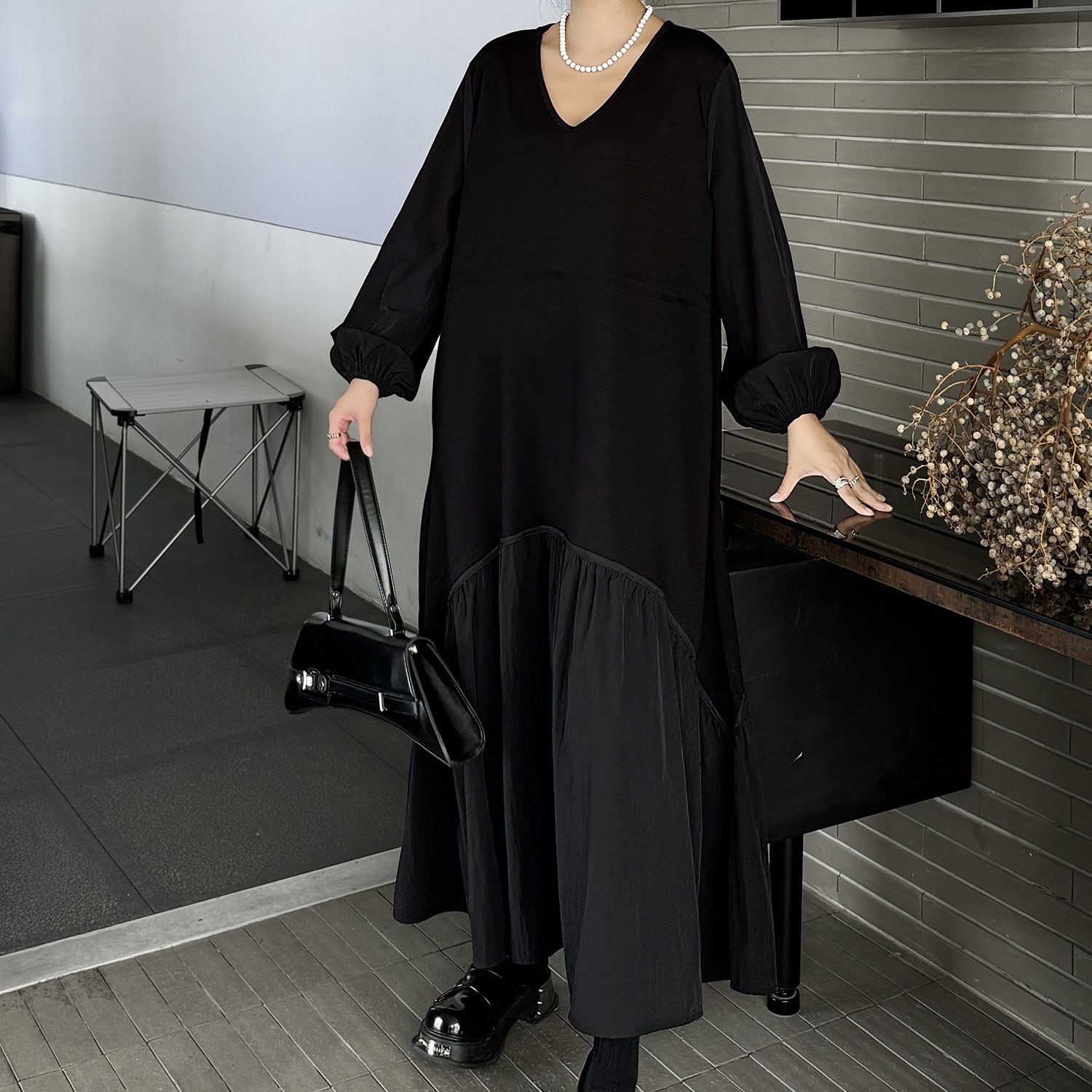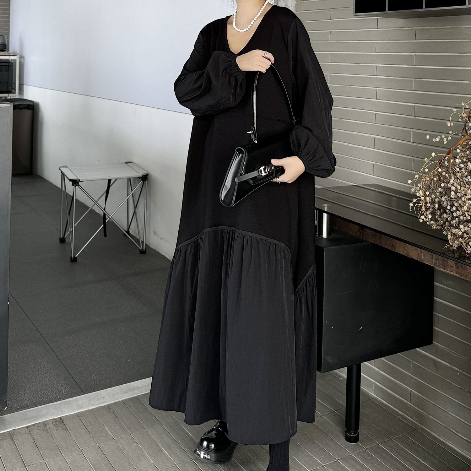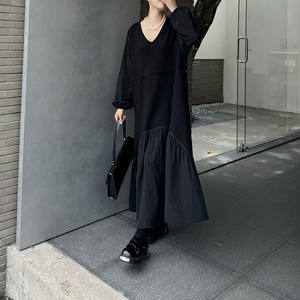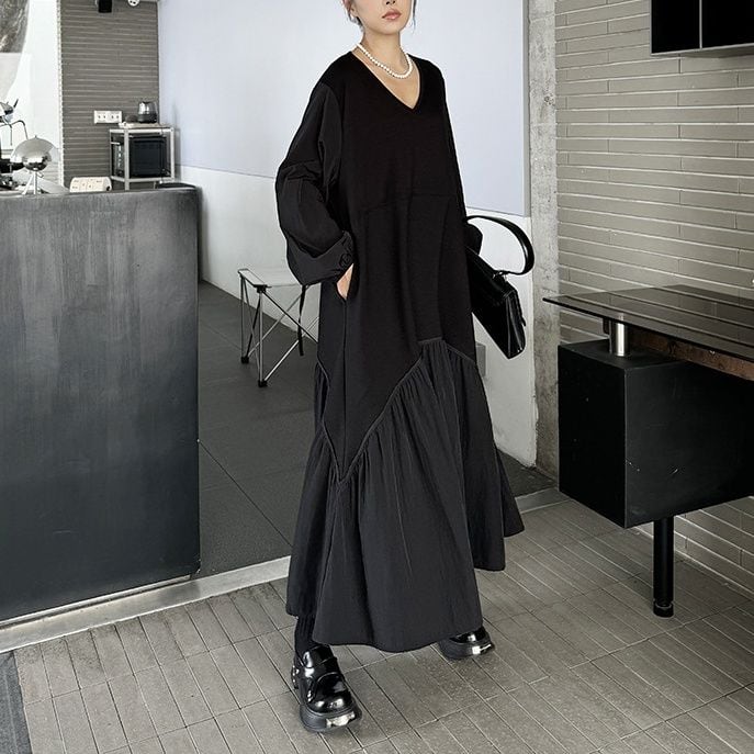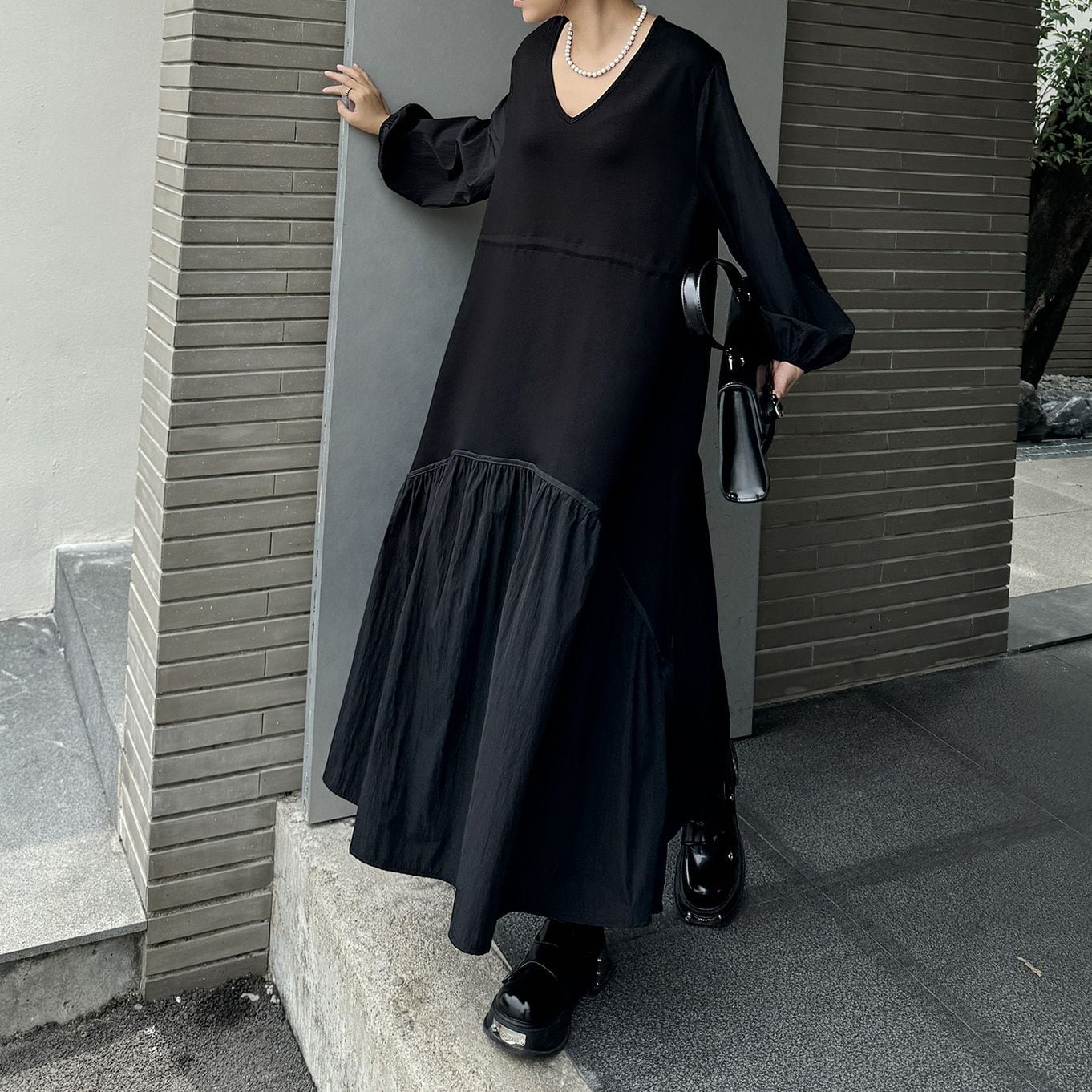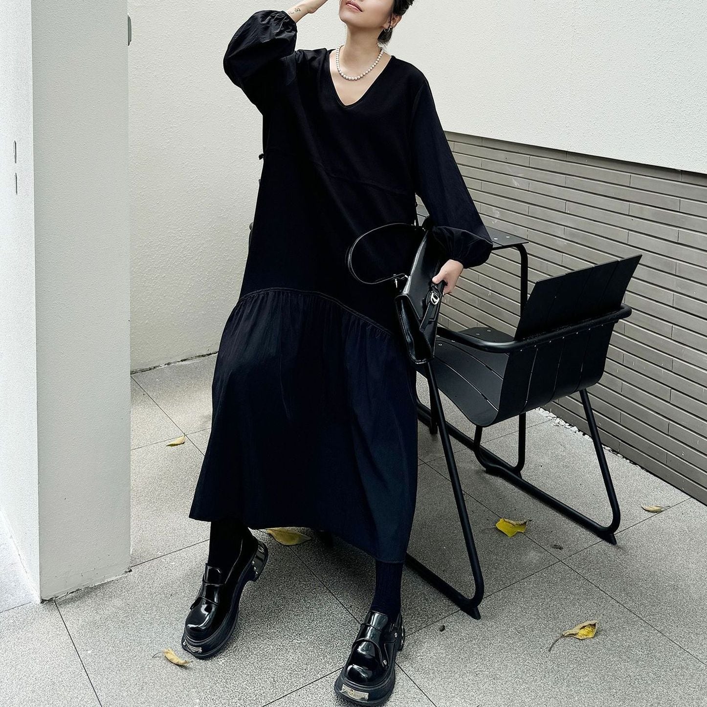 BLACK STITCH V-NECK A-LINE LONG PULLOVER DRESS 1color M-14576
