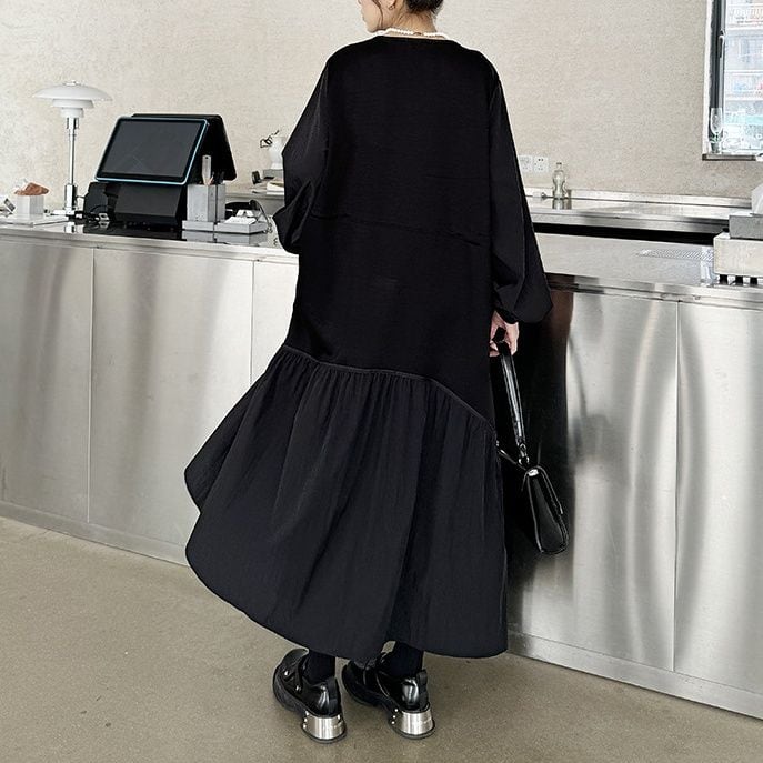 弧を描くような裾のスティッチがアクセントになった、Vネック・長袖・ロング丈のプルオーバーワンピースです。ブラックの単色で、アクセサリーなど小物アレンが効きます。ゴム加工された袖口やゆったりとしたAラインのシルエットが、エレガントな印象のアイテムです。