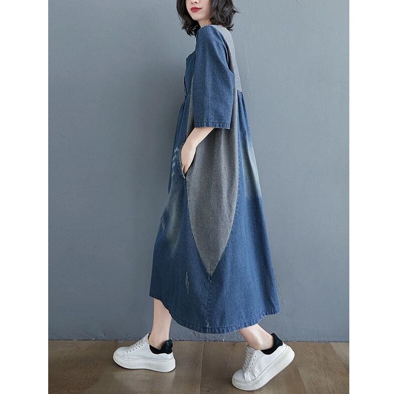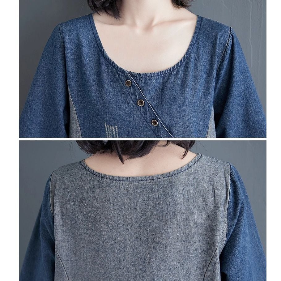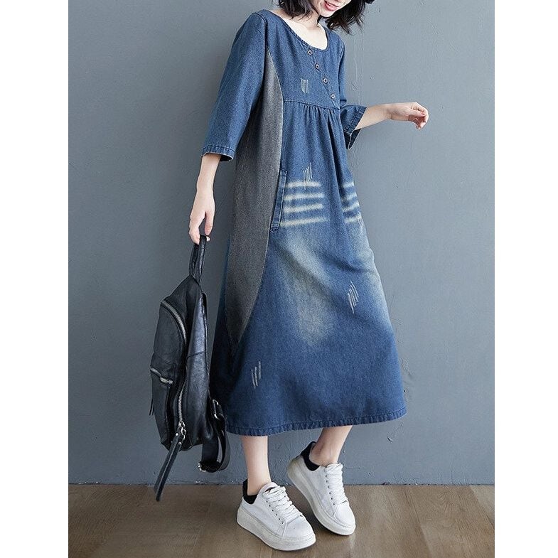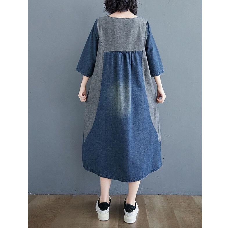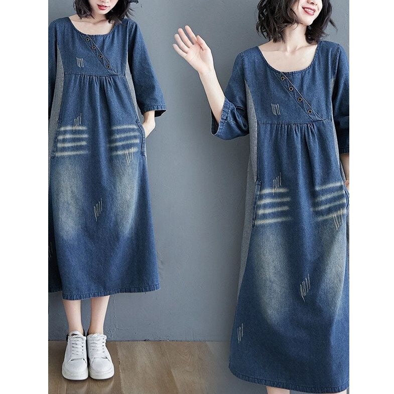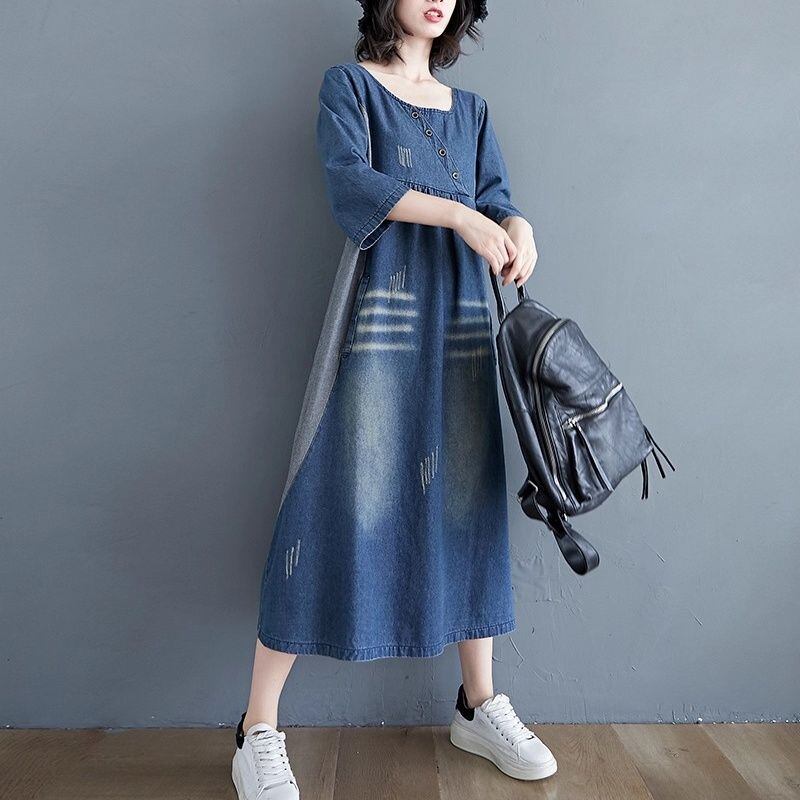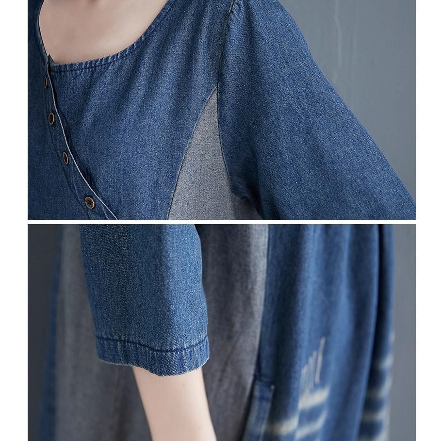 BOAT NECK 3/4 SLEEVES A-LINE MIDI DENIM DRESS 1color M-14580