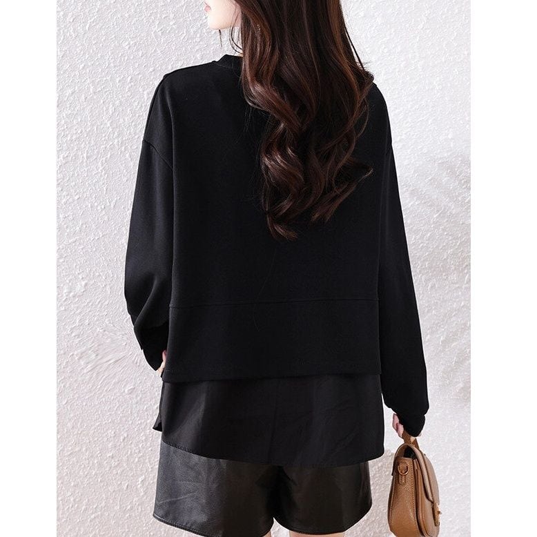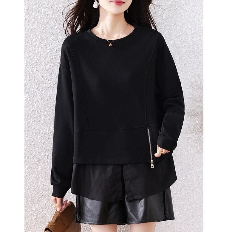 ショート丈のスウェットの裾にシャツの裾をスティッチしたデザインがお洒落な、ラウンドネック・長袖・ラウンドカットのデザイントップです。フロントの短いジップ飾りがアクセントになった、ブラックの単色でコーディネートしやすいアイテムです。 SIZE:※測り方によって2-3cmの差が生じる場合がございます。 【L】バスト108cm 肩幅40cm 袖丈55cm 着丈66cm 【XL】バスト112cm 肩幅41cm 袖丈56cm 着丈67cm 【2XL】バスト116cm 肩幅42cm 袖丈57cm 着丈68cm 【3XL】バスト120cm 肩幅43cm 袖丈58cm 着丈69cm 【4XL】バスト124cm 肩幅44cm 袖丈59cm 着丈70cm 【5XL】バスト128cm 肩幅45cm 袖丈60cm 着丈71cm COLOR:Black 素材:ポリエステル60%、綿40% モデル着用サイズ:L モデル情報:身長161cm 体重49kg STYLE CALENDAR:春◎ 夏〇 秋◎ 冬〇 お届けについて こちらの商品は海外店舗より直接発送となる為、 ご決済から到着までは、多くの場合【10日-2週間前後】でお届けしております。 ※在庫状況や輸送の混雑により、4週間前後かかる場合がございます。 注意事項 ・商品在庫切れにより注文キャンセルとさせていただく恐れもございますので、予めご了承くださいませ。 ・仕入れ工場を変えることがあるため、記載サイズと若干異なる場合がございます。 ・商品の色味は、お手持ちのスマートフォンの画面によって実物と若干異なる場合がございます。 ・イメージ違いやサイズ交換等、お客さまご都合による交換・返品はご遠慮ください。 送料について 全国一律580円。ただし10,000円以上のご注文で送料無料となります。 お支払い方法について ・クレジットカード決済(VISA/Mastercard/JCB/アメリカン・エクスプレス/ Diners Club) ・コンビニ決済/Pay-easy ※前払いのお支払い方法 ・Pay ID あと払い(コンビニ払い、口座振替) ※あと払いのお支払い方法 ・キャリア決済(d払い/au PAY(auかんたん決済)/ソフトバンク・ワイモバイルまとめて支払い) 管理番号:M-14587