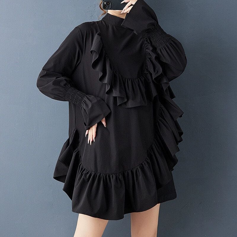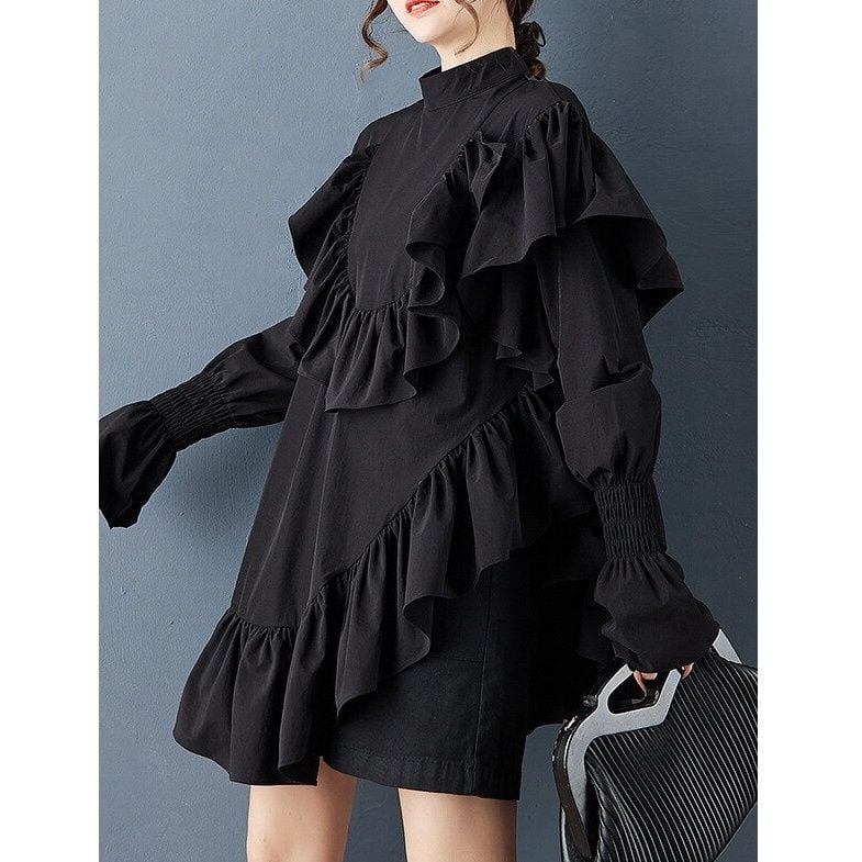 ブラックの単色で大きなフリルの飾りが美しい、ハイネック・長袖・チュニック丈のプルオーバーシャツです。シャーリングで作ったキャンディスリーブやアシンメトリックなデザインにこだわりを感じる、クラシカルで豪華な印象のアイテムです。