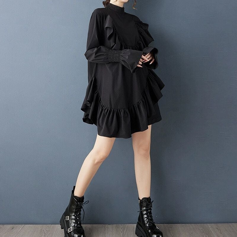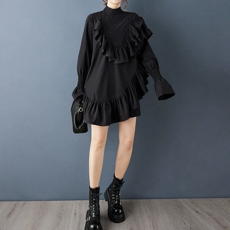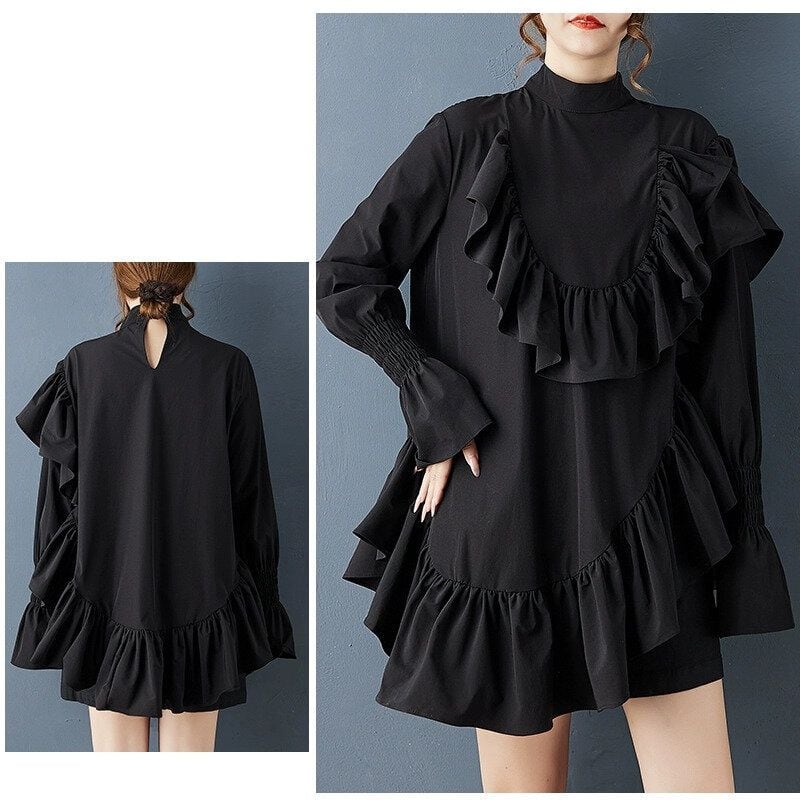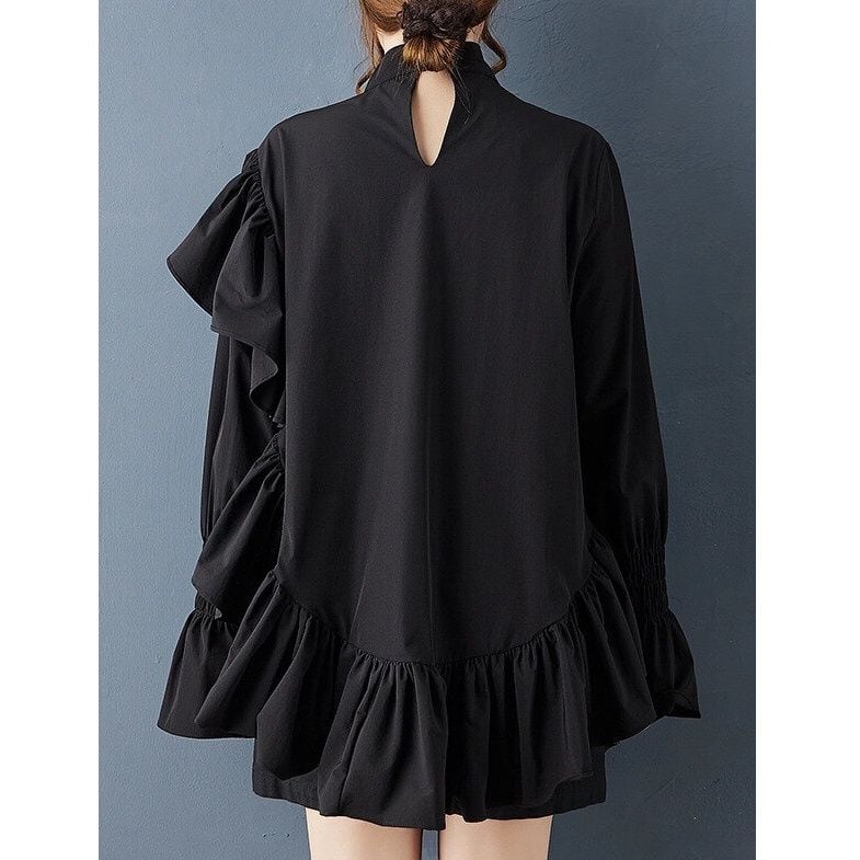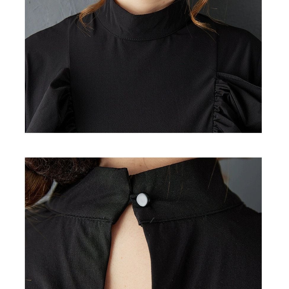 BLACK HIGH NECK FRILL TRIMMED PULLOVER DESIGN SHIRT 1color M-14603