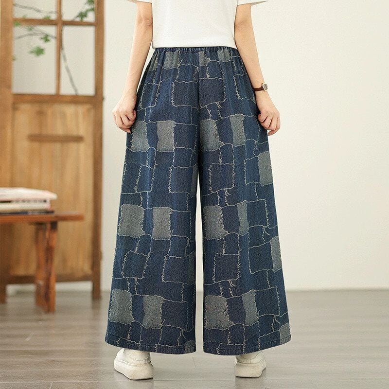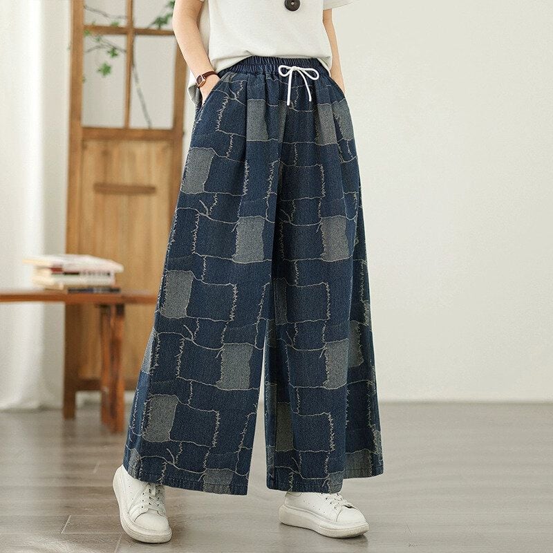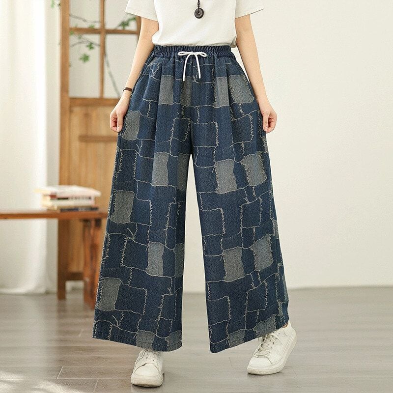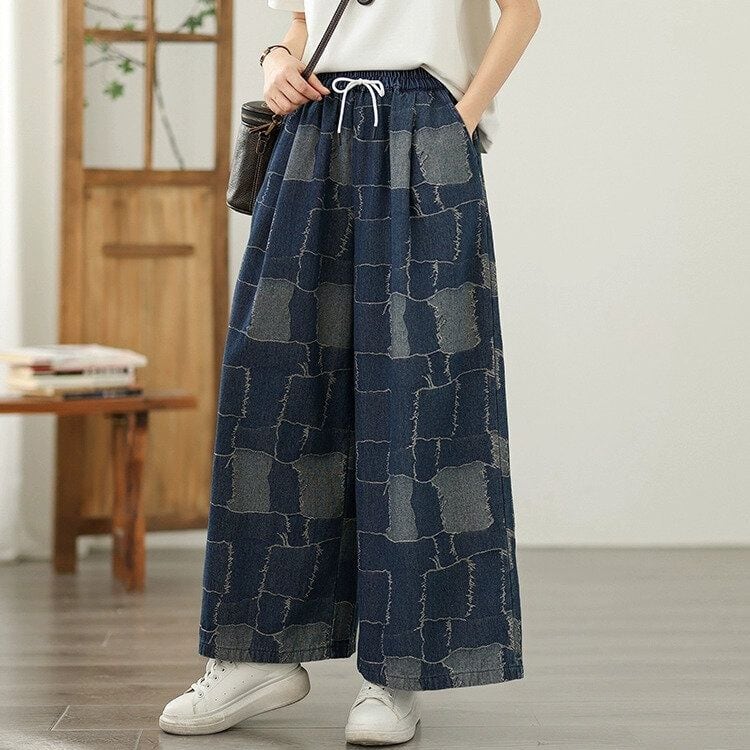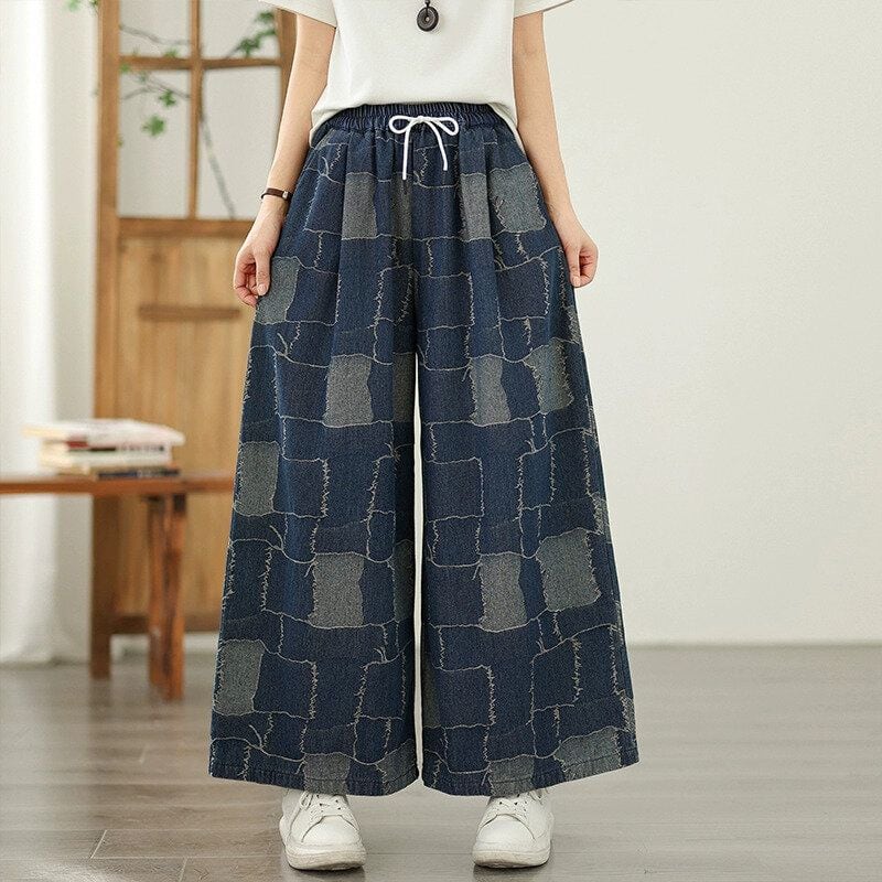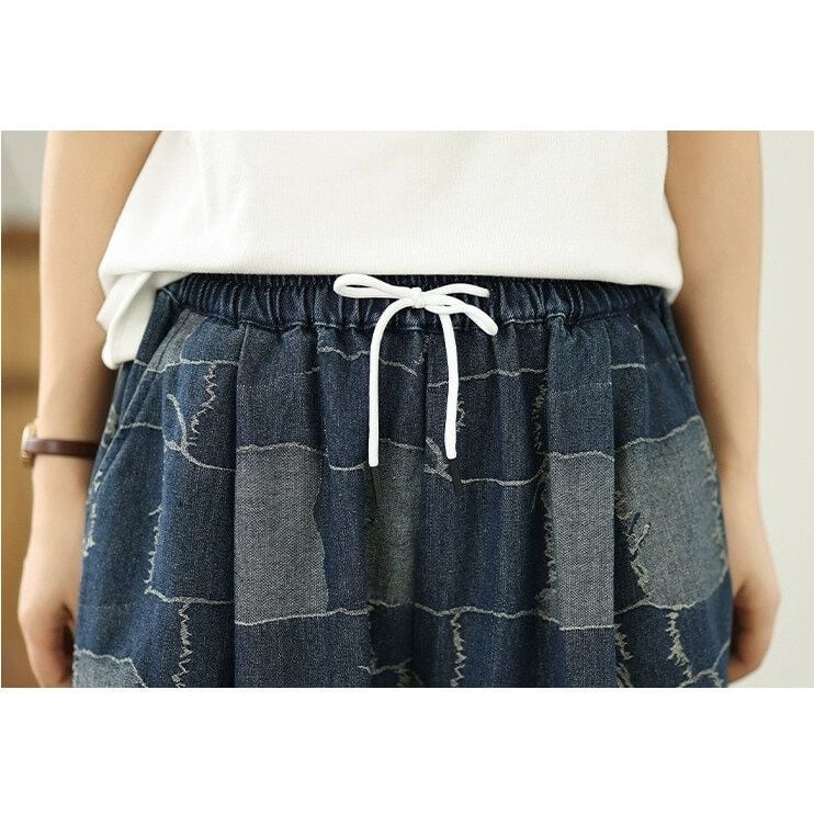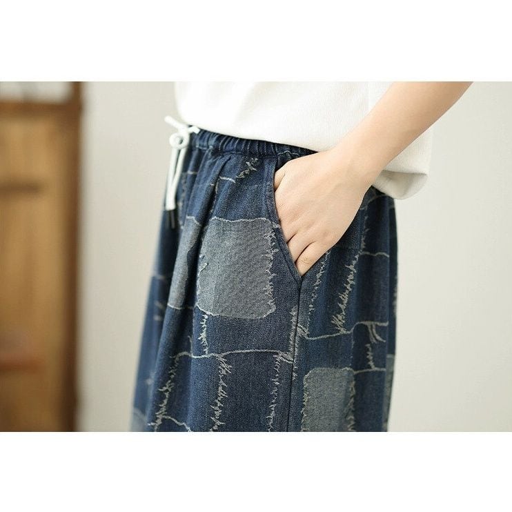 継ぎ接ぎ柄のデニム素材がキュートな、Aライン・9分丈のワイドレッグデザインパンツです。ウエストはドローストリングで、履き心地が良いです。コーディネートの主役になる、目を惹くアイテムです。