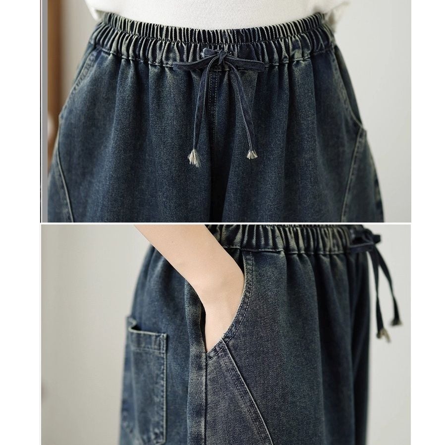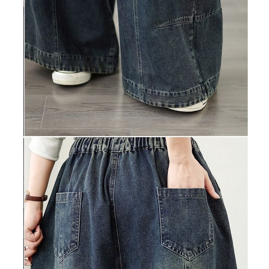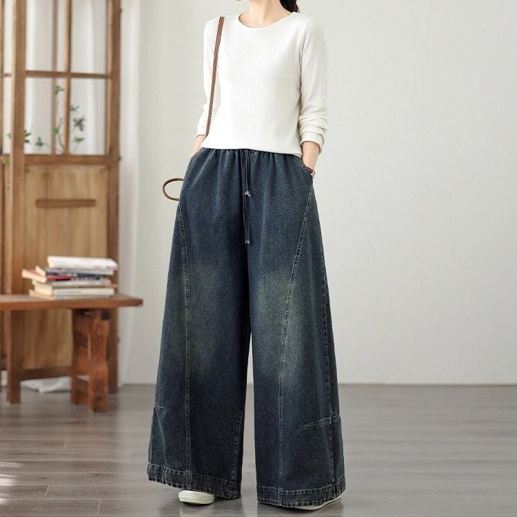 DRAWSTRING WAIST A-LINE WIDE LEG DENIM PANTS 1color M-14618