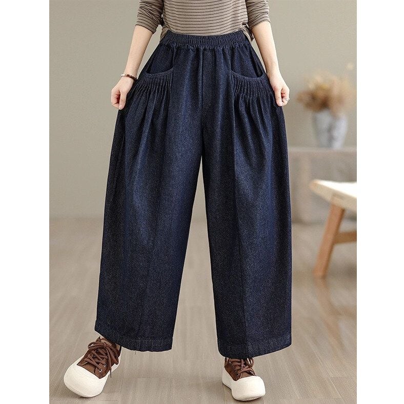 ポケットのプリーツがアクセントになった、ワイドレッグ・クロップド・デニムパンツです。ウエストはゴムなので、着脱が簡単で履き心地が良いです。シンプルなデザインときれいなダークブルーで、モードな印象の合わせやすいアイテムです。