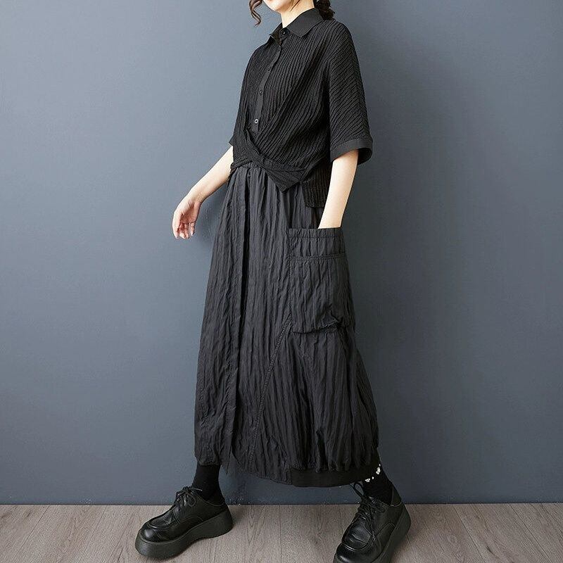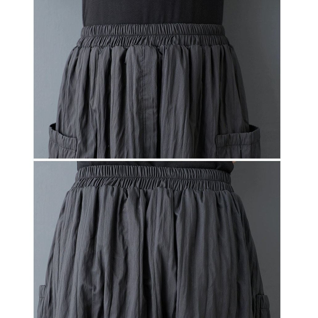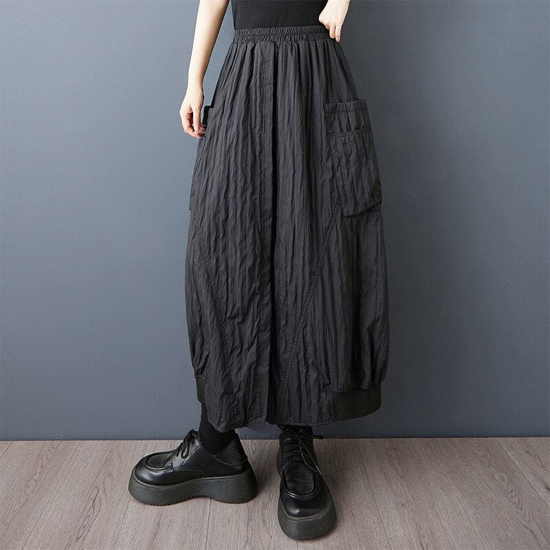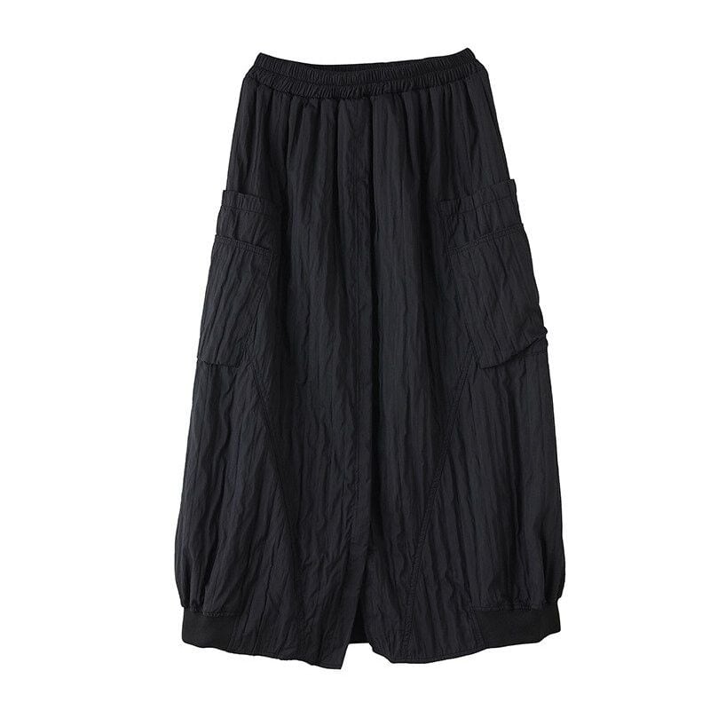 ブラックのキルティングのようなシワ加工生地がお洒落な、膝下丈のデザインスカートです。ウエストはゴムなので、着脱が簡単で履き心地が良いです。大きなポケットやランタンのようなシルエットが特徴的な、コーディネートのアクセントになるアイテムです。