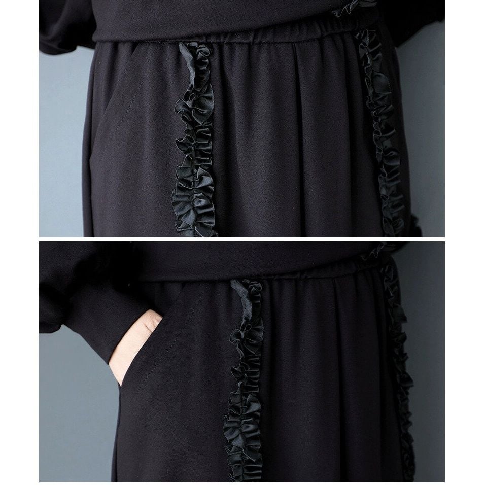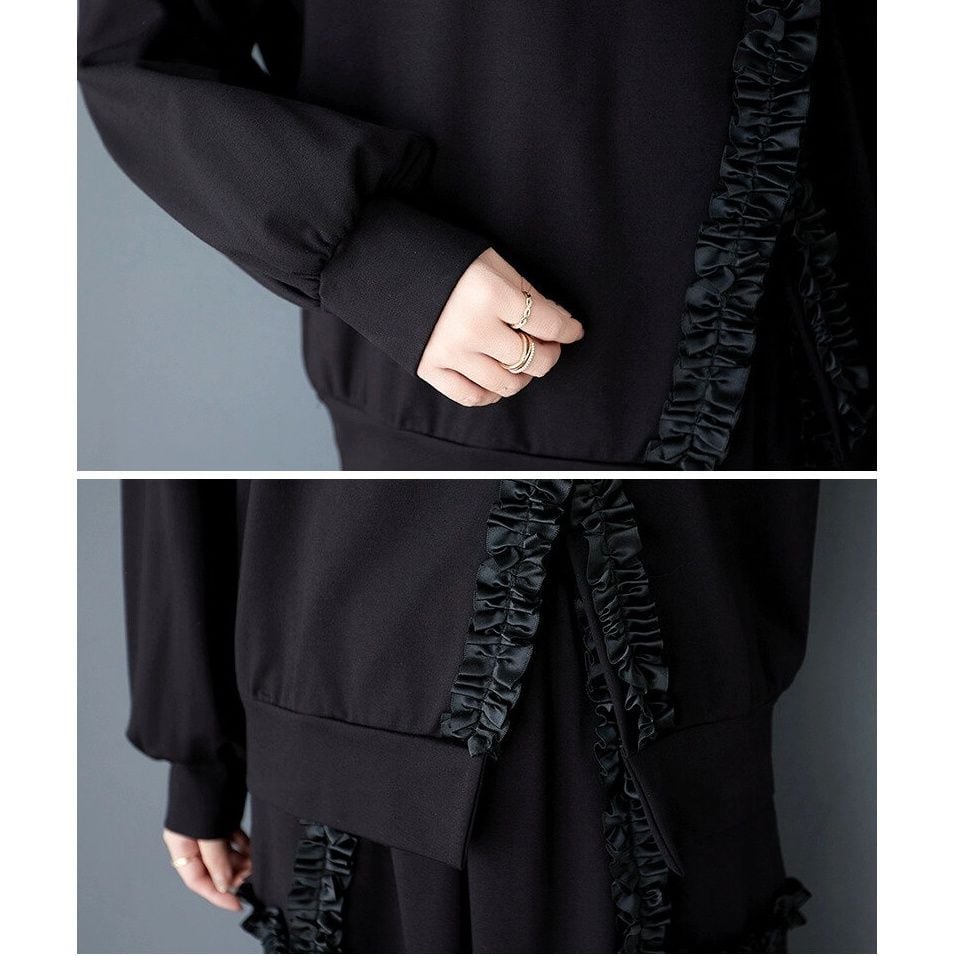 艶のあるブラックのフリルリボン飾りがガーリーな、Vネック・長袖・スリットヘムのプルオーバートップと、Aライン・ロングスカートのセットアップです。シックなブラックの単色で、ガーリーさとクールさがミックスした印象のアイテムです。