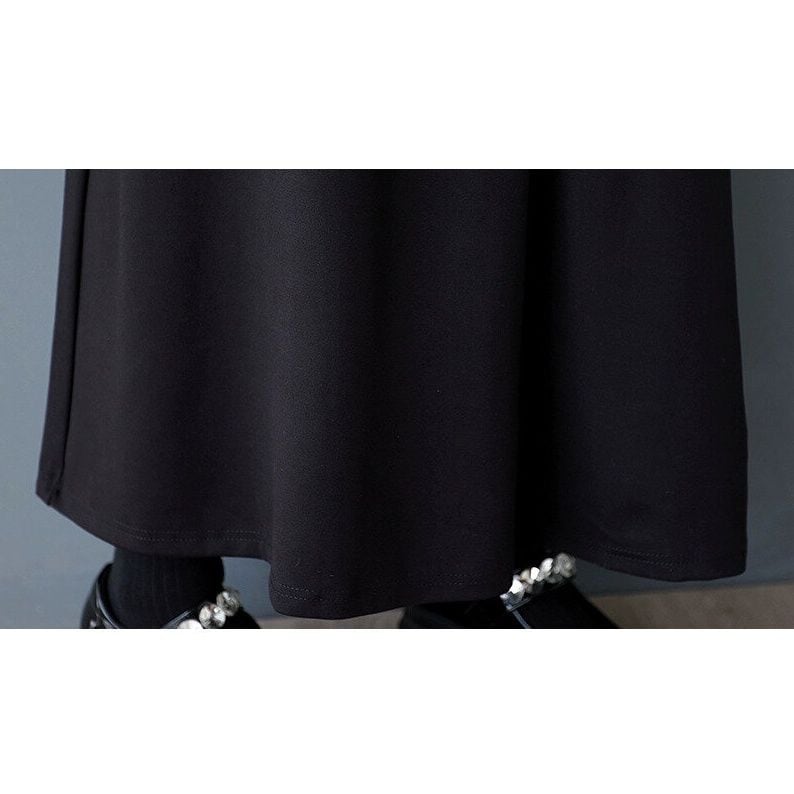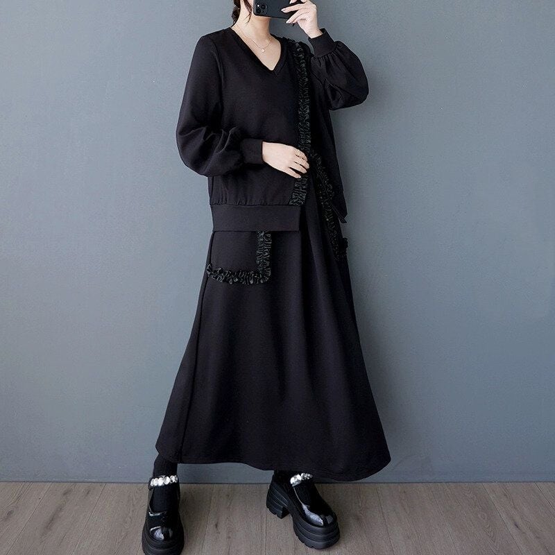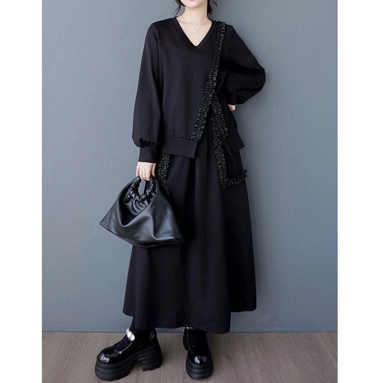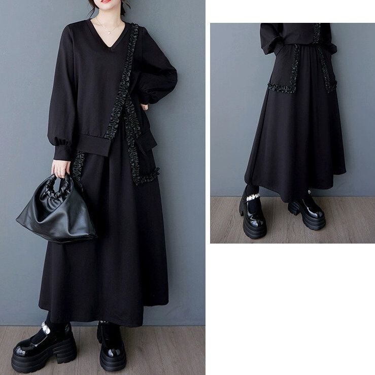 BLACK FRILL RIBBON TRIMMED V-NECK TOP & LONG SKIRT SET 2pieces 1color M-14636
