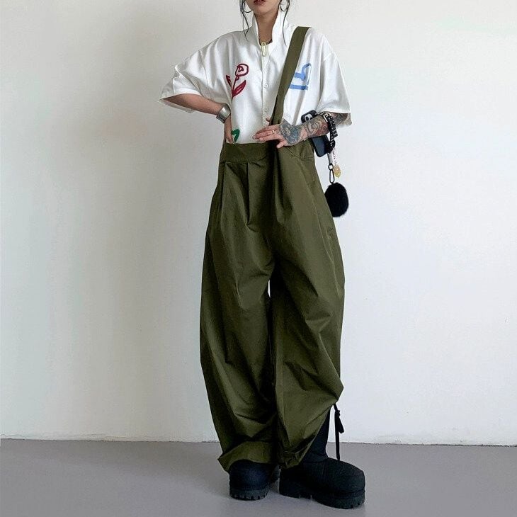 ワンショルダーストラップのシルエットがキュートな、アーミーグリーンのワイドレッグ・オーバーオールです。プリーツで作られたバギースタイルがカッコいい、コーディネートの主役になるアイテムです。