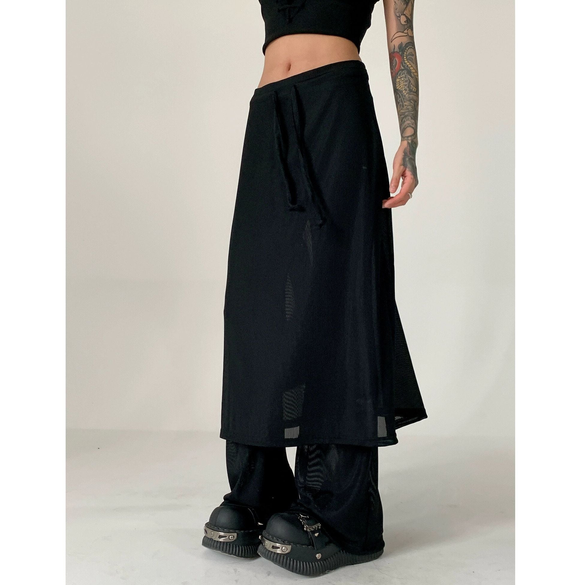 BLACK FAKE-2-PIECE MESH LAYERED FLARE PANTS 1color M-14659