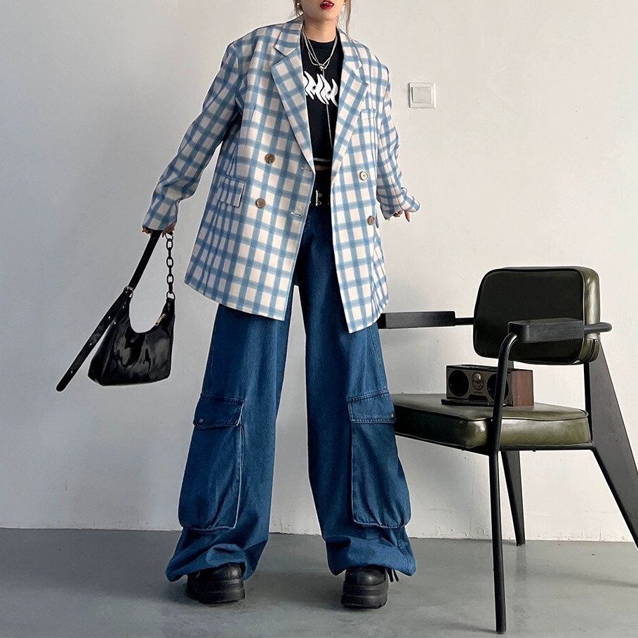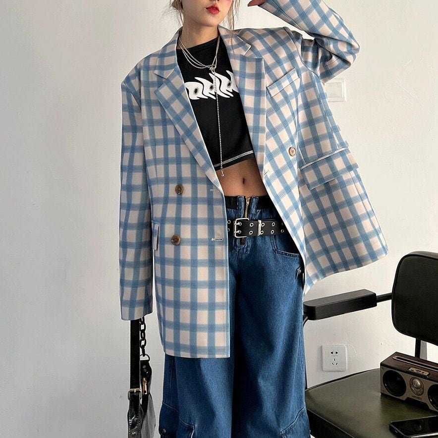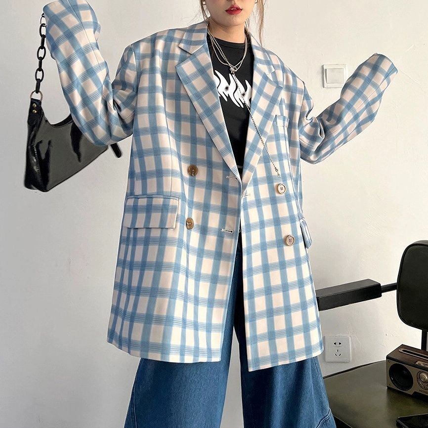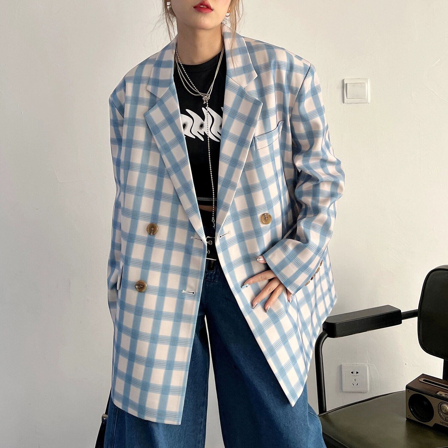 LIGHT BLUE PLAID OVERSIZED BLAZER JACKET 1color M-14675