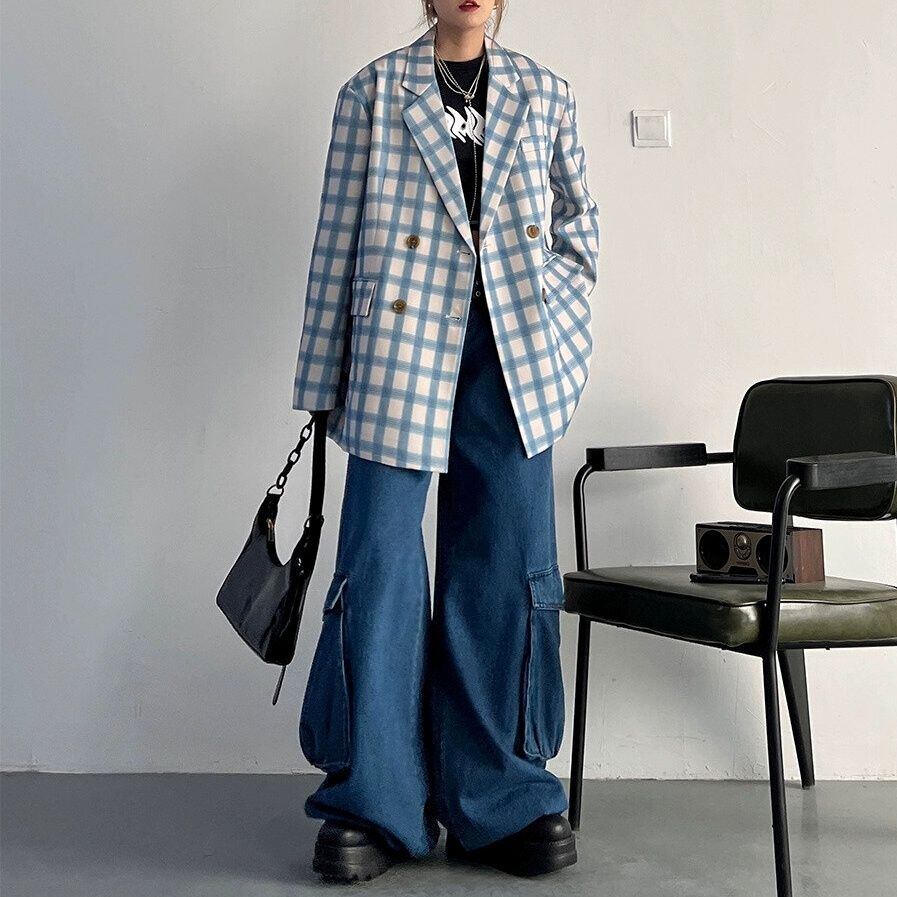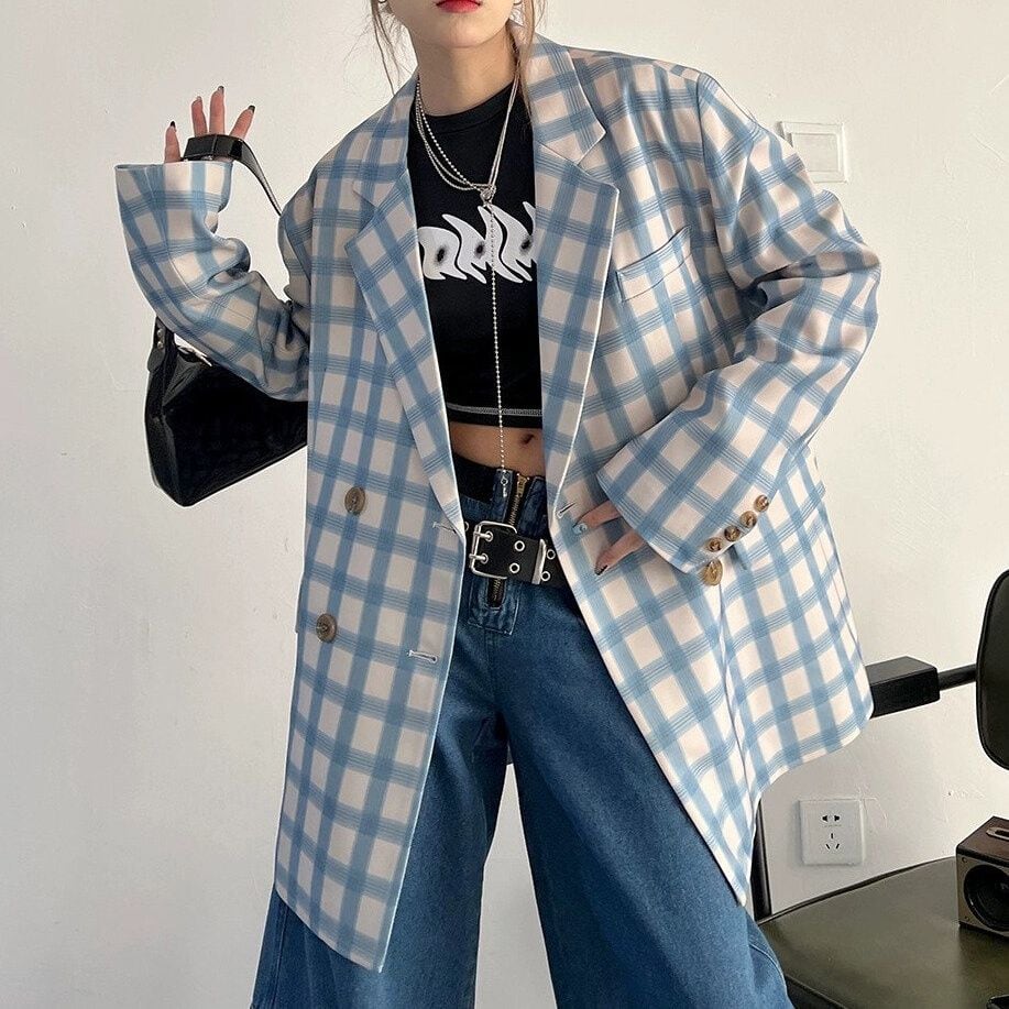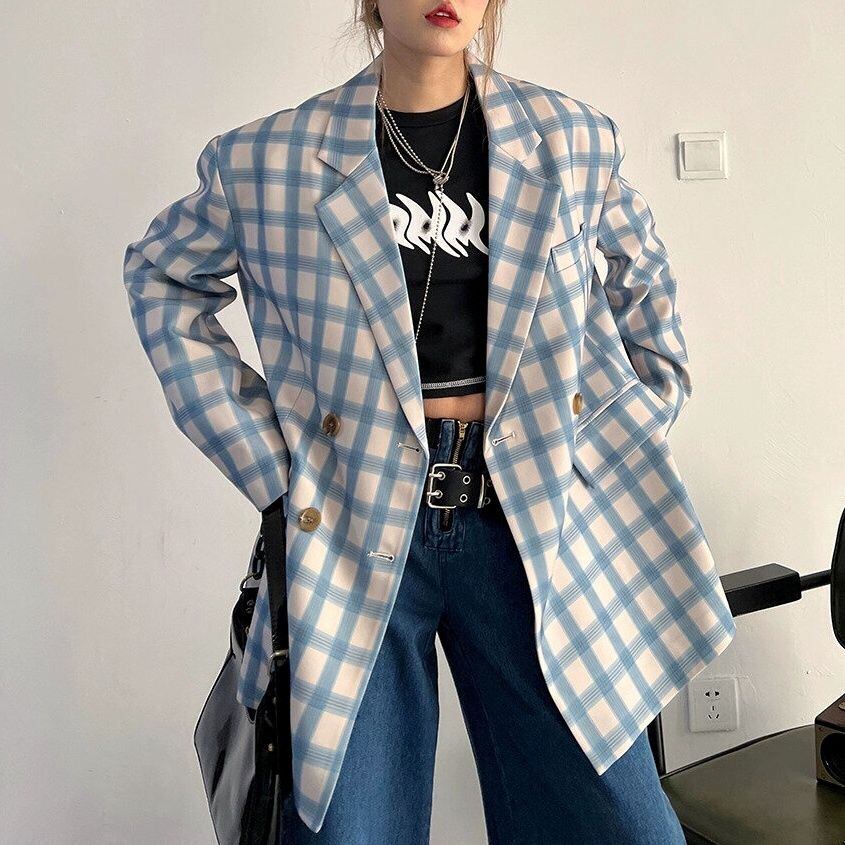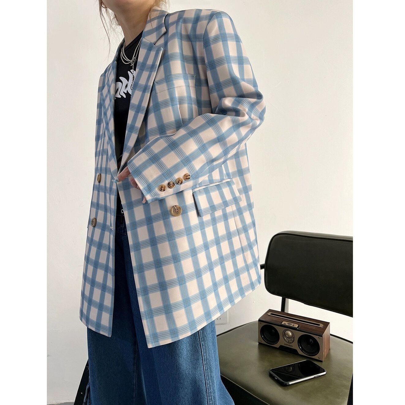 白地にライトブルーのチェック柄がレトロでキュートな、ラペル付きVネック・長袖・ミドル丈のブレザージャケットです。オーバーサイズシルエットのダブルブレストデザインがお洒落な、コーディネートの主役になるカジュアルアイテムです。