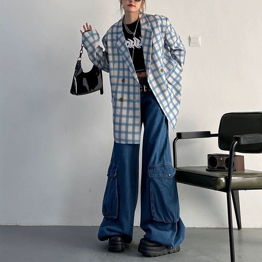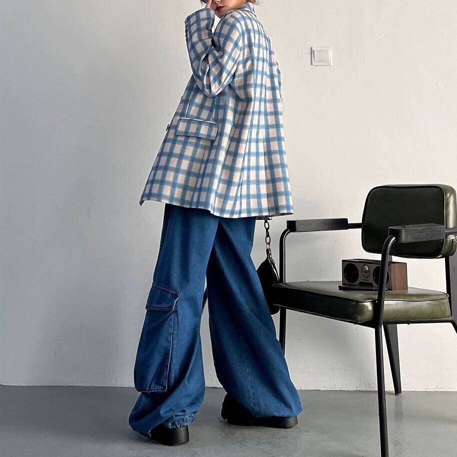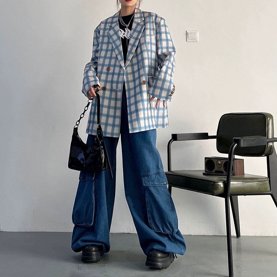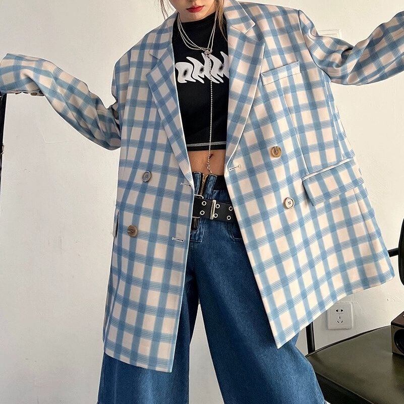白地にライトブルーのチェック柄がレトロでキュートな、ラペル付きVネック・長袖・ミドル丈のブレザージャケットです。オーバーサイズシルエットのダブルブレストデザインがお洒落な、コーディネートの主役になるカジュアルアイテムです。