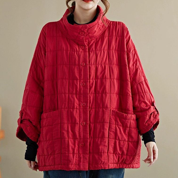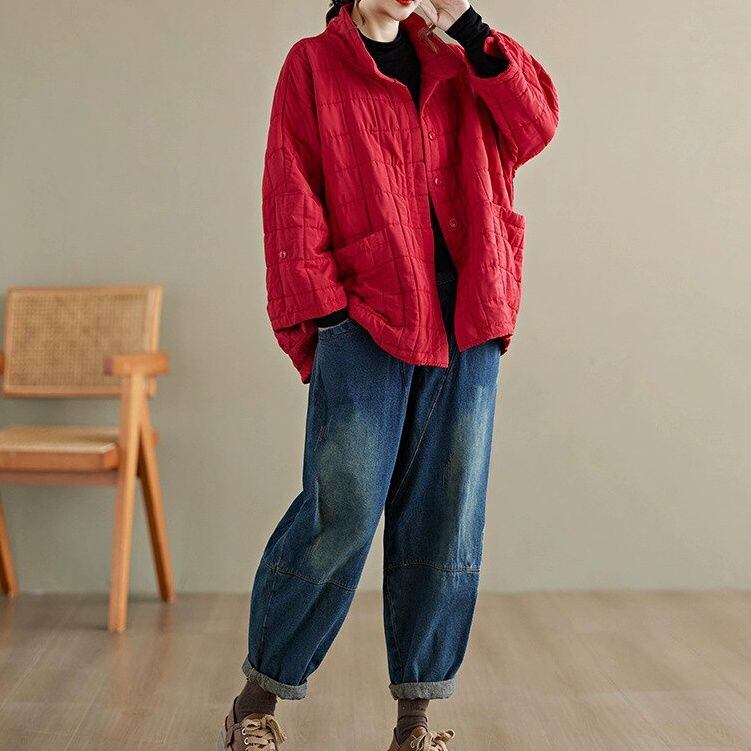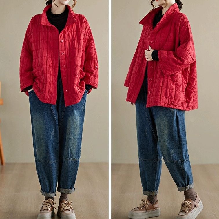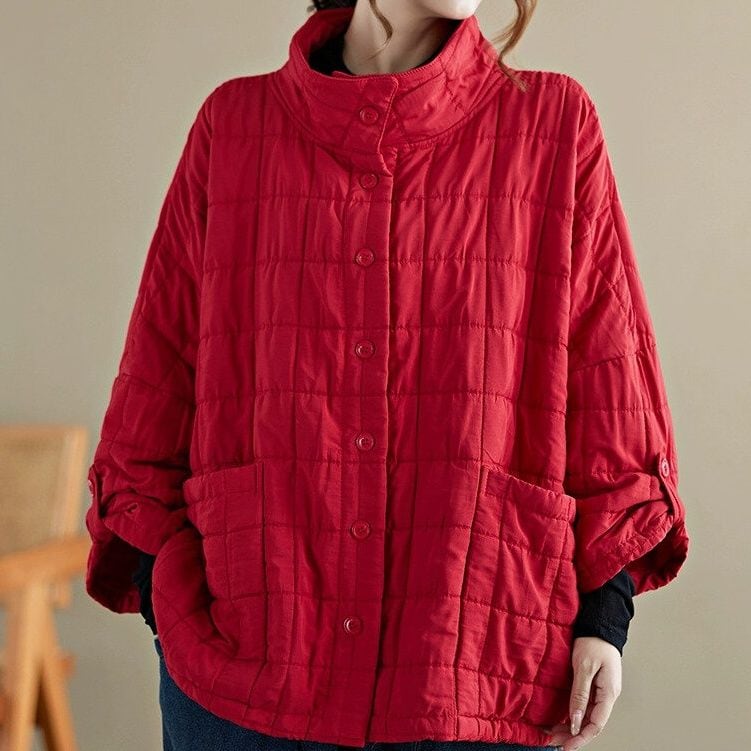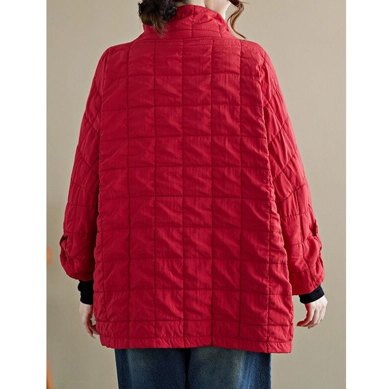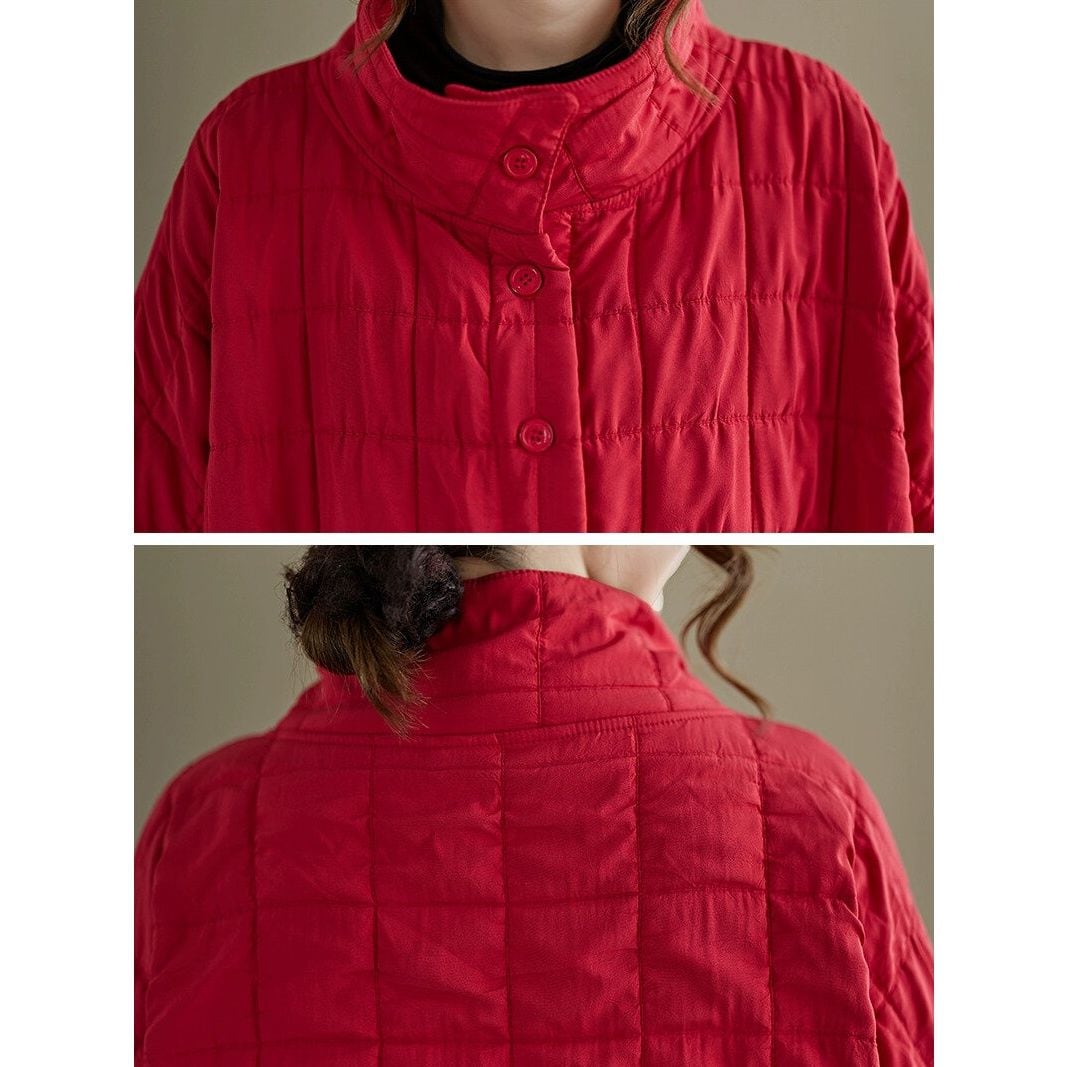 チェックのスティッチラインがキュートな、スタンドカラー・長袖・ショート丈の中綿ジャケットです。ゆったりとしたワイド幅シルエットに短めの袖口をボタンストラップで留めるデザインがお洒落な、単色で合わせやすい防寒アイテムです。ブラックとレッドの2色から選べます。