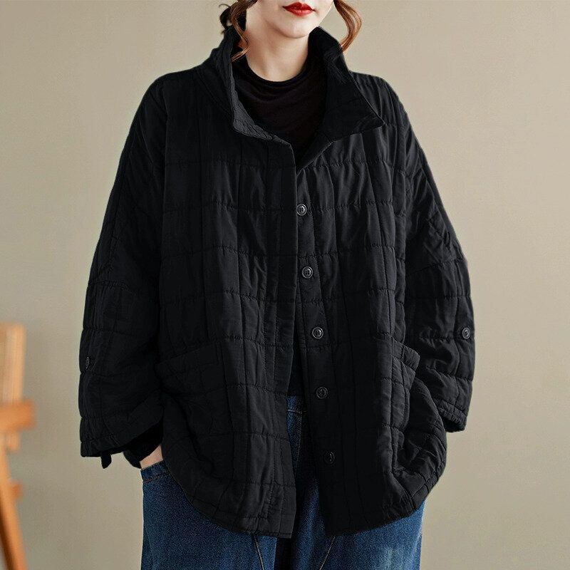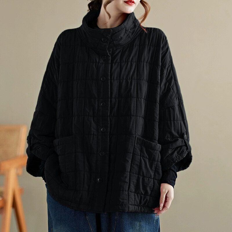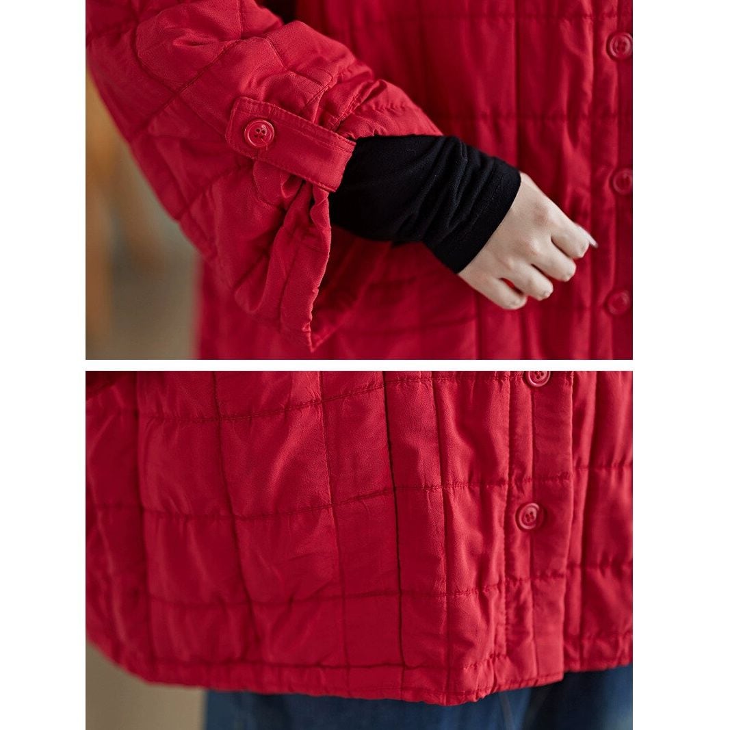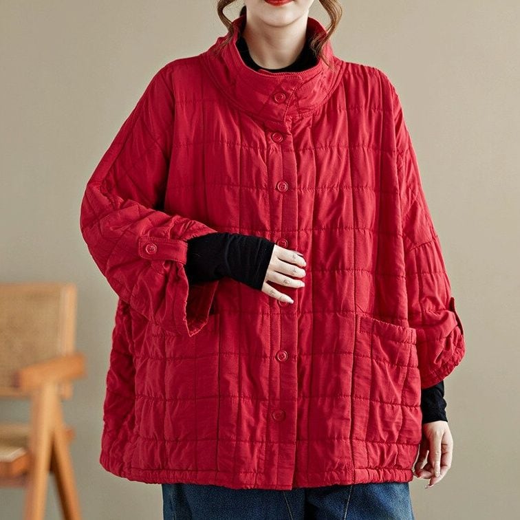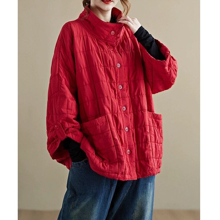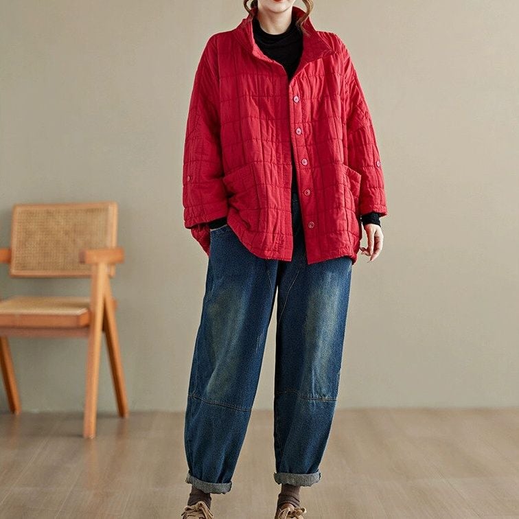 チェックのスティッチラインがキュートな、スタンドカラー・長袖・ショート丈の中綿ジャケットです。ゆったりとしたワイド幅シルエットに短めの袖口をボタンストラップで留めるデザインがお洒落な、単色で合わせやすい防寒アイテムです。ブラックとレッドの2色から選べます。