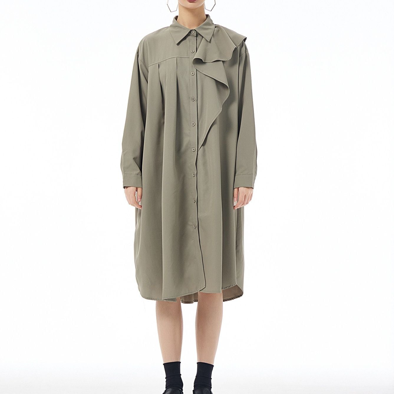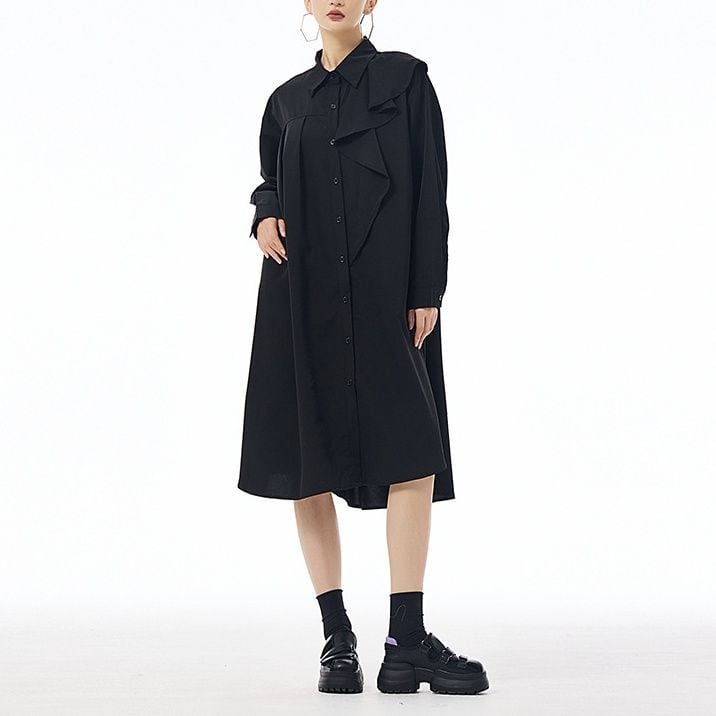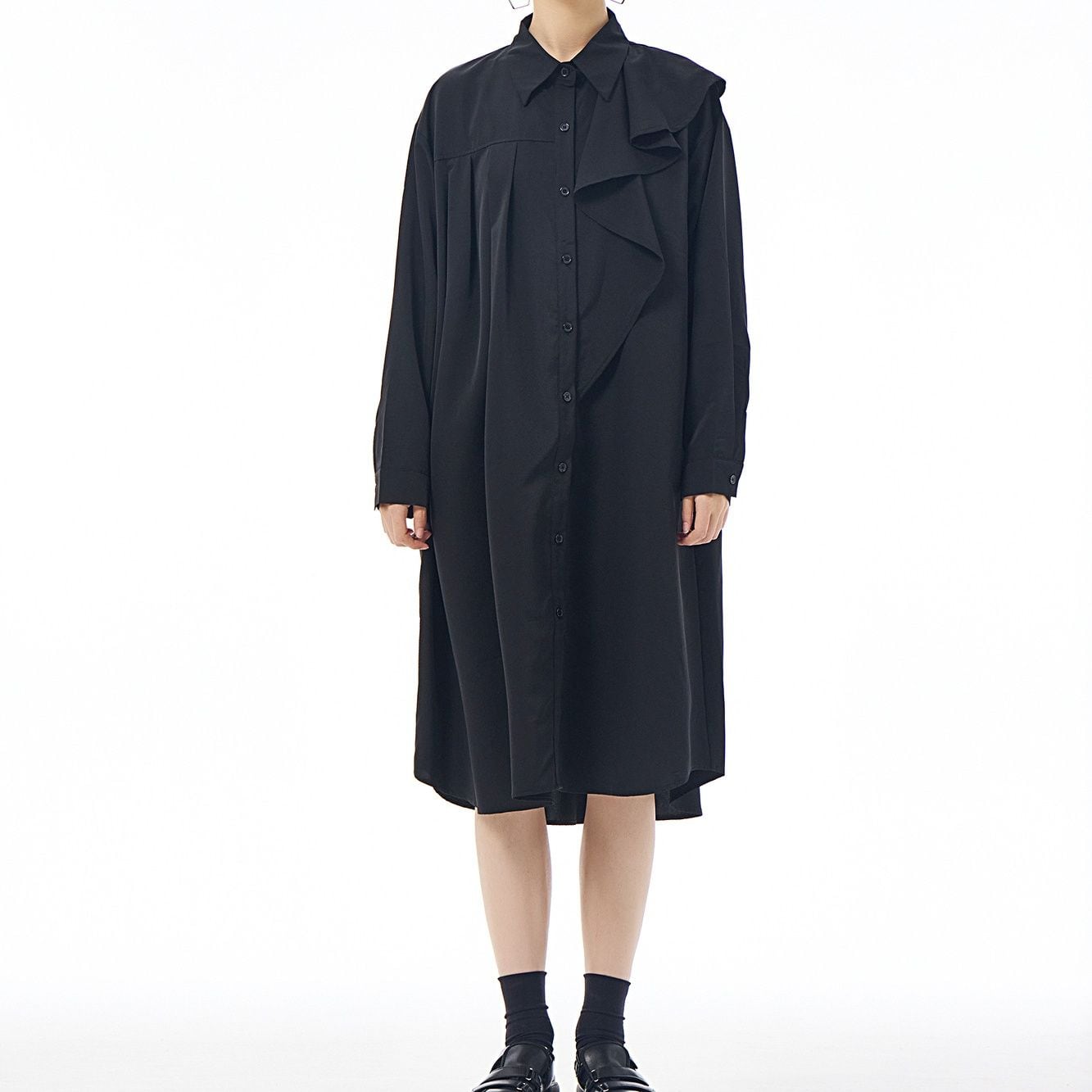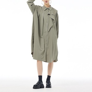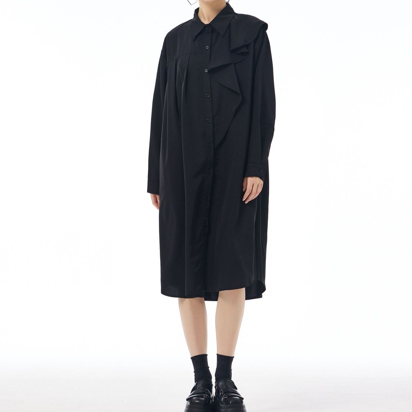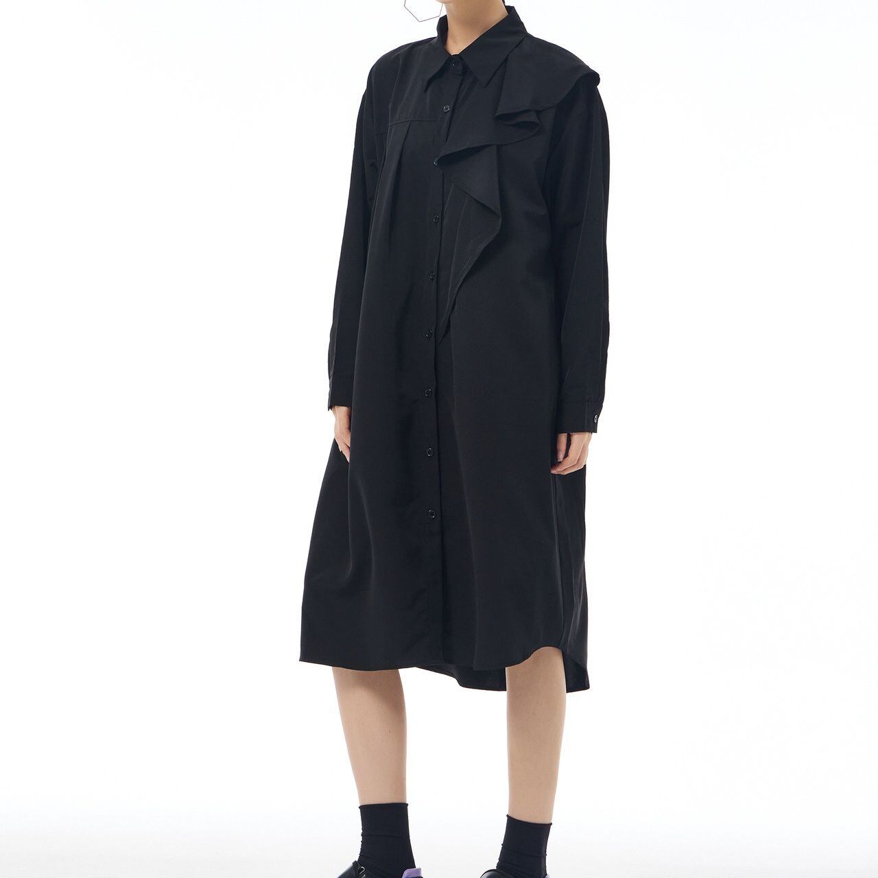 左肩のフリルフラップが美しい、ポロ襟・長袖・ミドル丈のシャツワンピースです。右サイドだけにプリーツの入ったアシンメトリックなデザインで、広がりすぎないシルエットが魅力的なアイテムです。