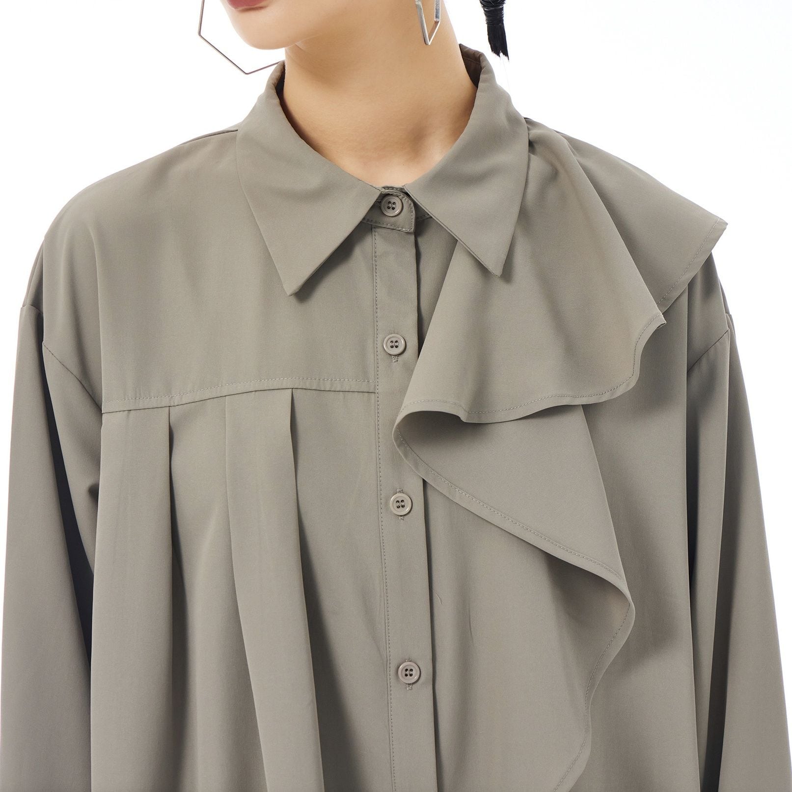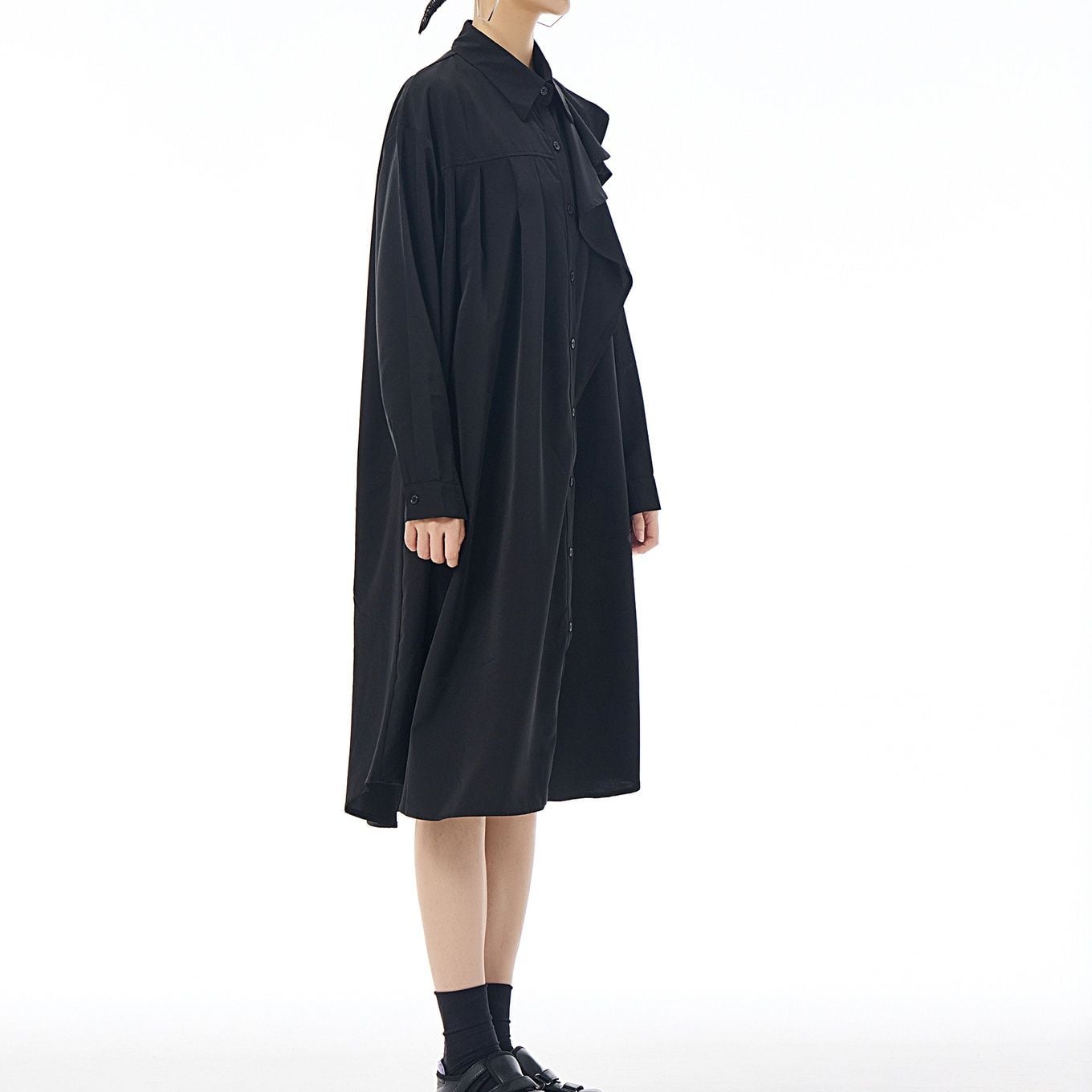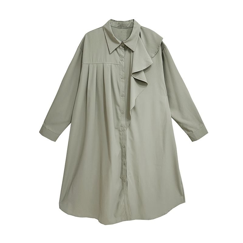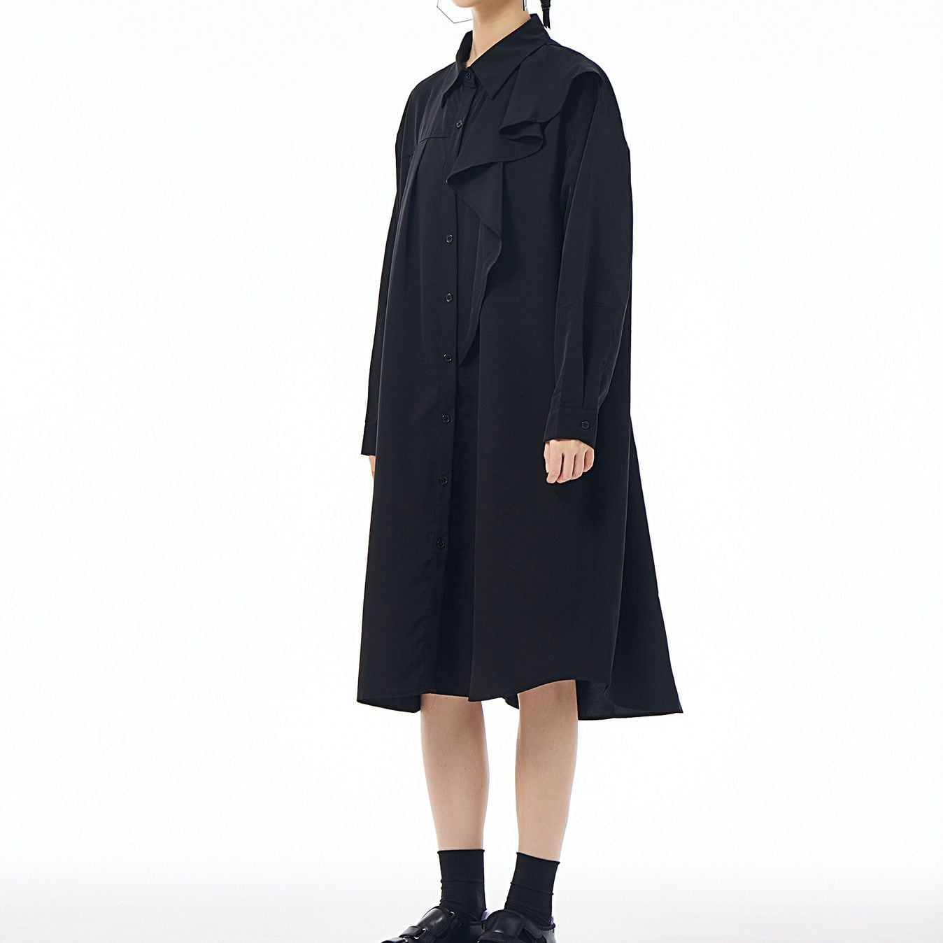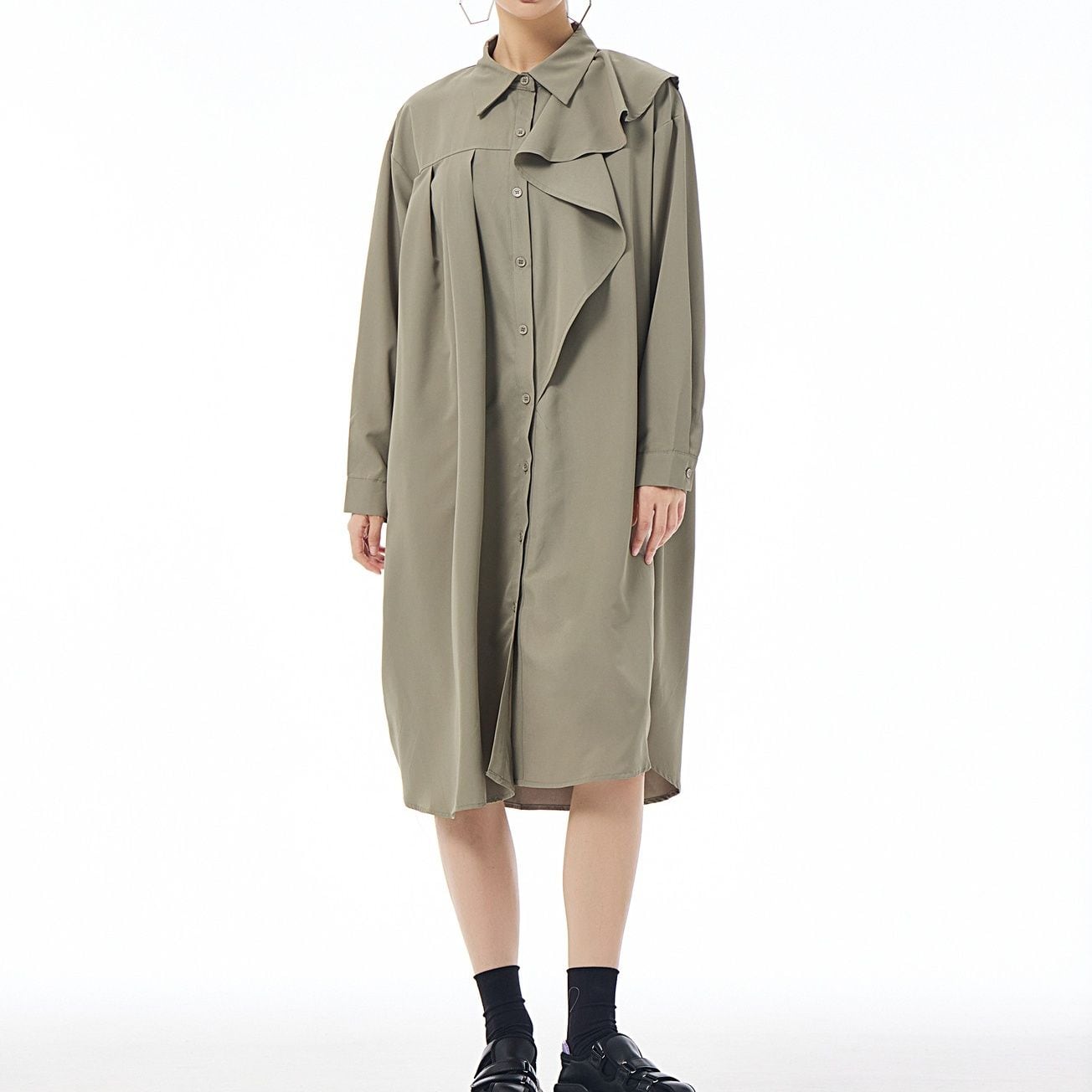 左肩のフリルフラップが美しい、ポロ襟・長袖・ミドル丈のシャツワンピースです。右サイドだけにプリーツの入ったアシンメトリックなデザインで、広がりすぎないシルエットが魅力的なアイテムです。